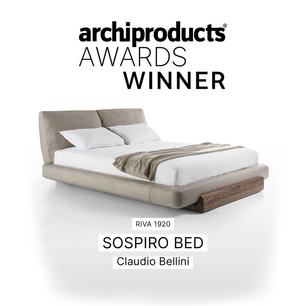 Archiproducts hat am 16. November 2023 Riva1920 den Preis für die Kategorie „Möbel“ verliehen, mit dem Bett„ Sospiro Bed“ entworfen von den Architekten Claudio Bellini. Bett mit einer Struktur, die sich aus der Verbindung zweier Komponenten mit weichen, abgerundeten Linien ergibt: der Sockel aus Massivholz, der ein gepolstertes Bettgestell aufnimmt. Kombiniert mit einem gepolsterten Kopfteil, das mit Leder oder Stoff bezogen ist.