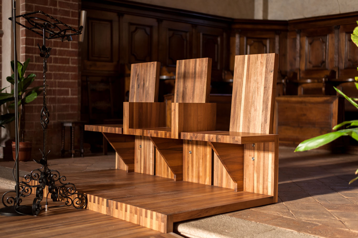 Riva 1920 realisiert eine Reihe von Sitzen aus massivem Nussbaum, mit naturöl gefertigt, für die Abtei SS. Pietro und Paolo in V...