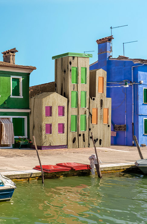 Die Cities Collection wächst um ein neues Kapitel, inspiriert von einem der charakteristischsten Recyclingmaterialien von Riva1920: den venezianischen Briccole. Ausgehend von diesem Symbol der Lagune hat Authentic Design mit Farbe gearbeitet, um der Insel Burano zu huldigen, die weltweit für ihre farbenfrohen Häuser und ihren architektonischen Reiz bekannt ist und jedes Jahr Besucher aus aller Welt anzieht.