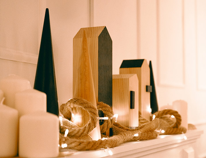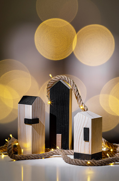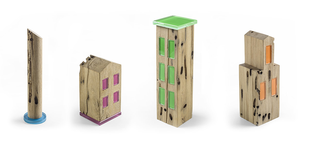 - Drei kleine Häuser, deren Formen an ikonische Gebäude der Insel erinnern, gefertigt aus Briccola-Holz und veredelt mit farbig lackierten Glaseinsätzen.
