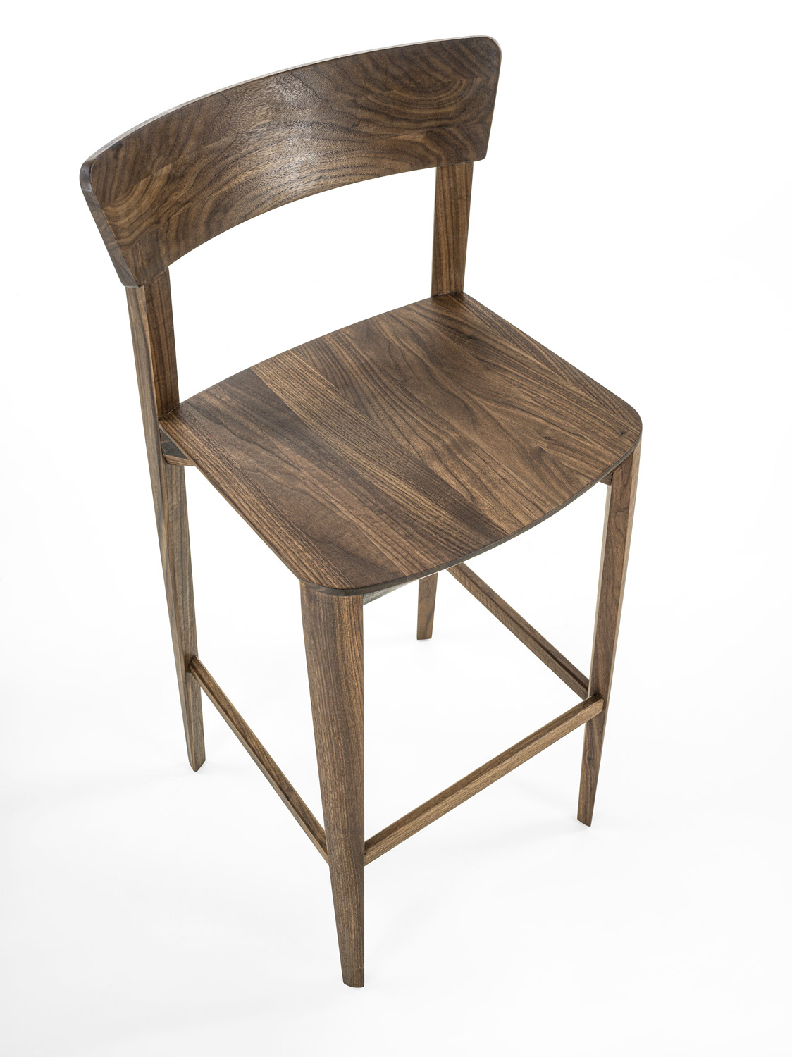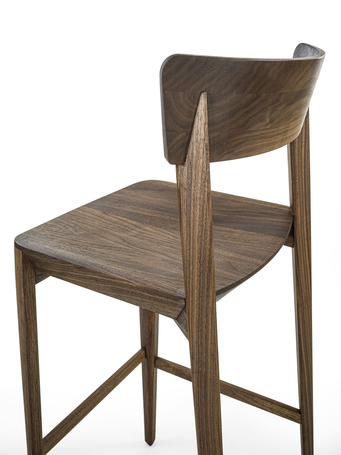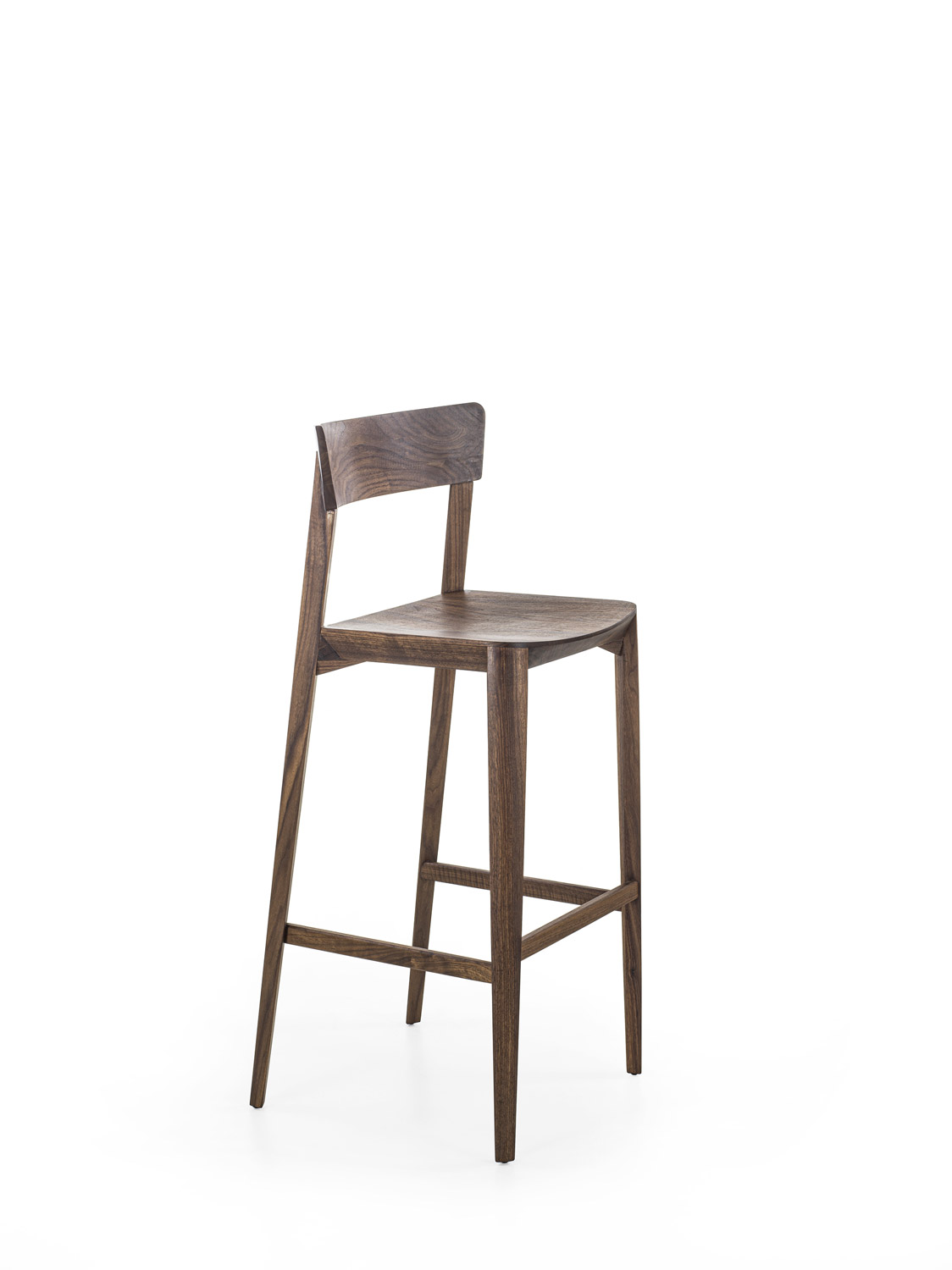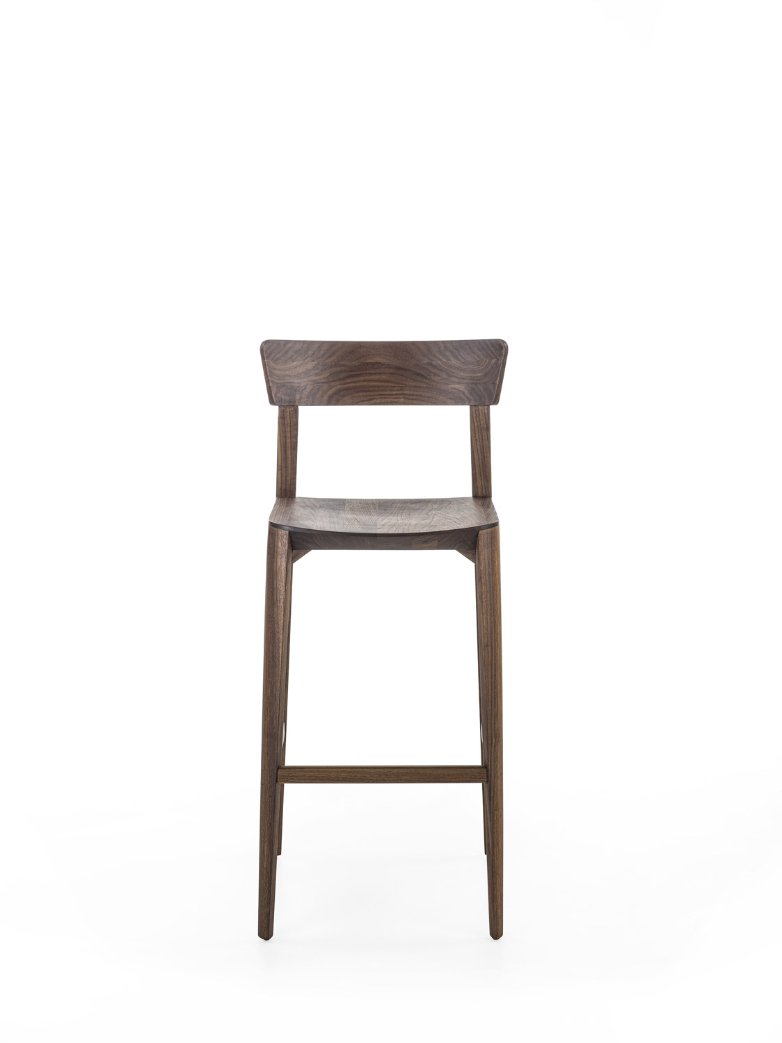 Barhockerversion des Stuhls MIA aus Massivholz, der von den klassischen, traditionellen Bistrotstühlen inspiriert ist.