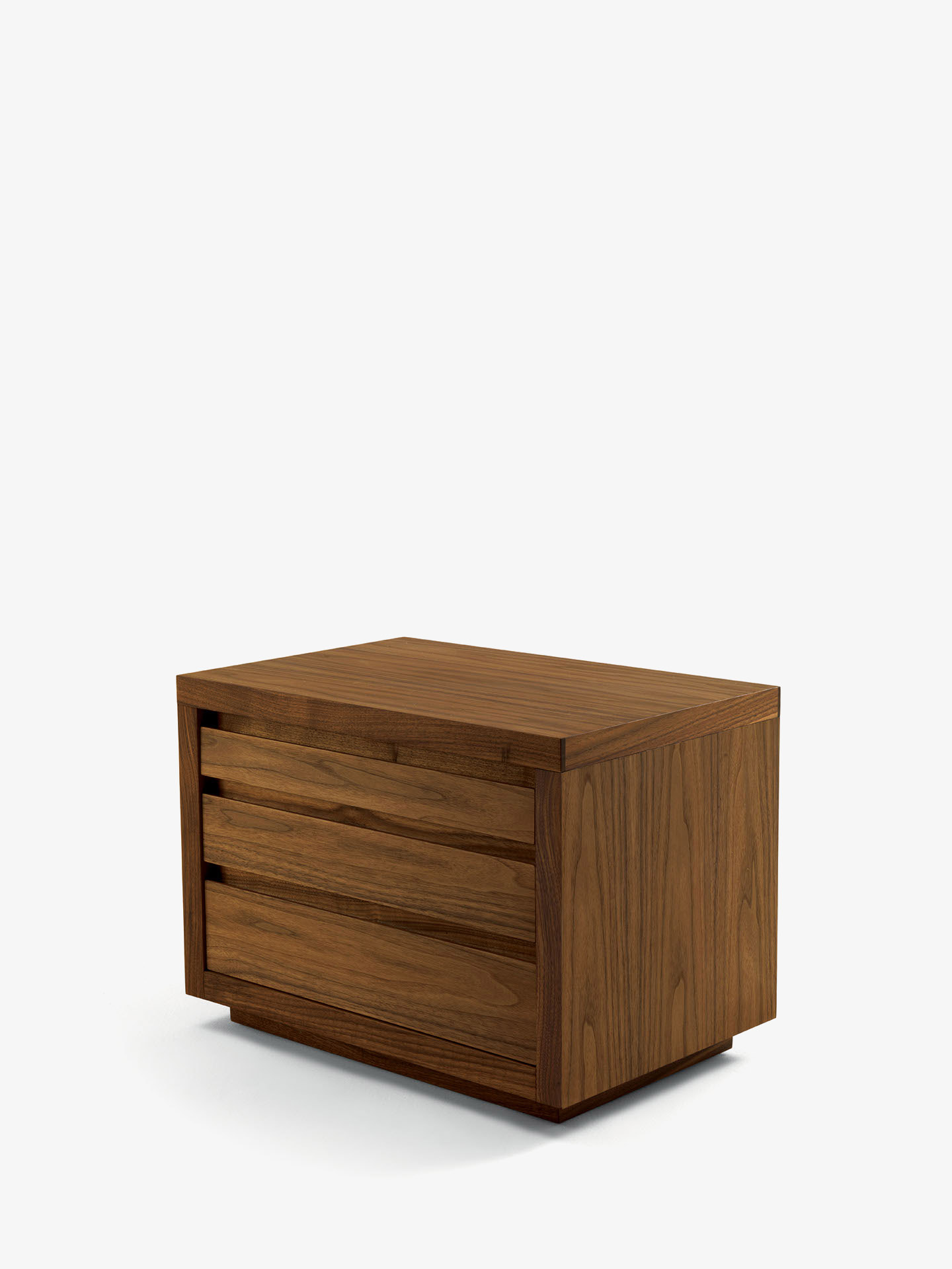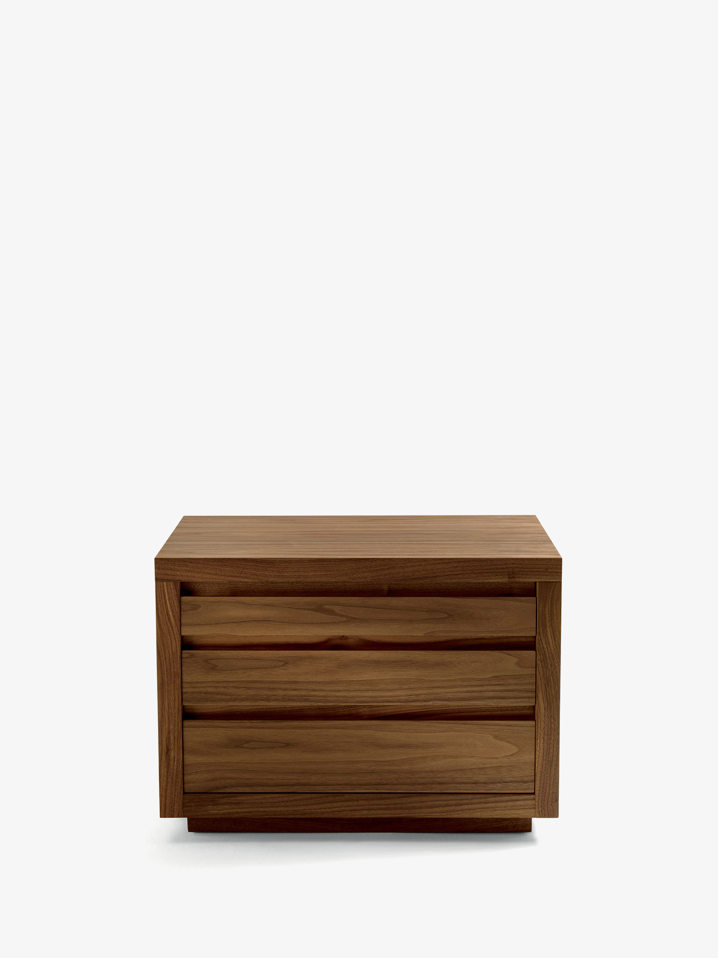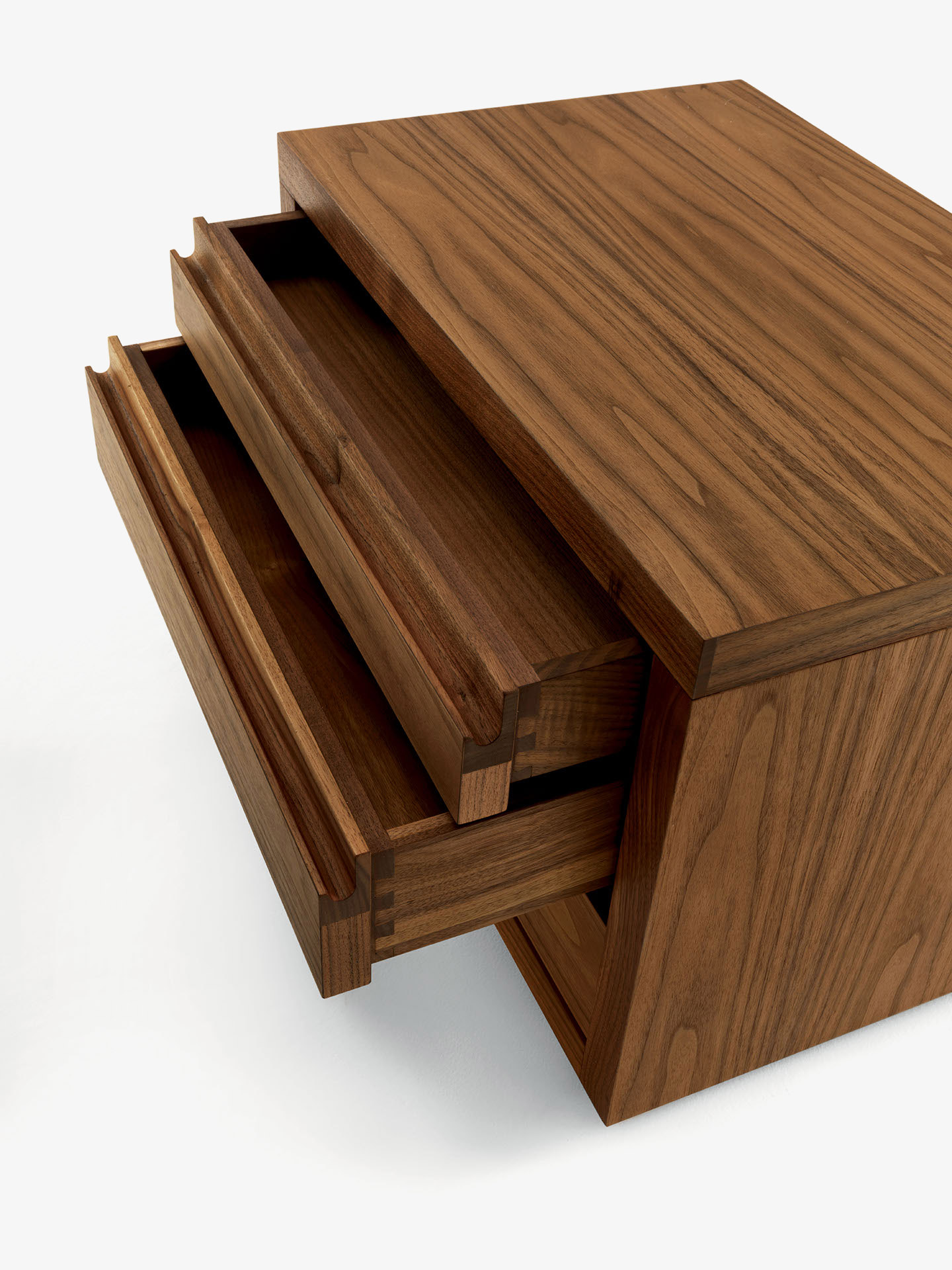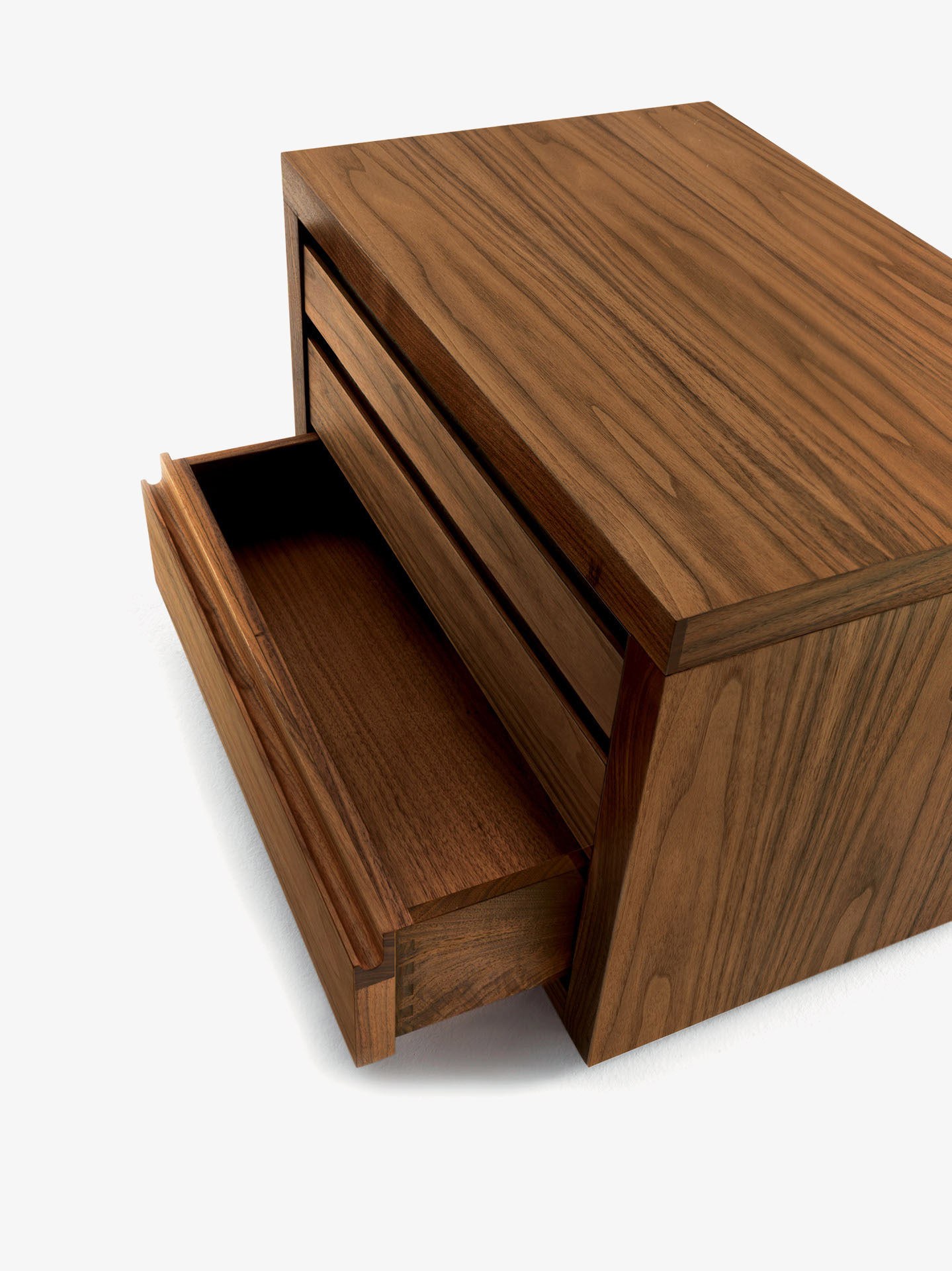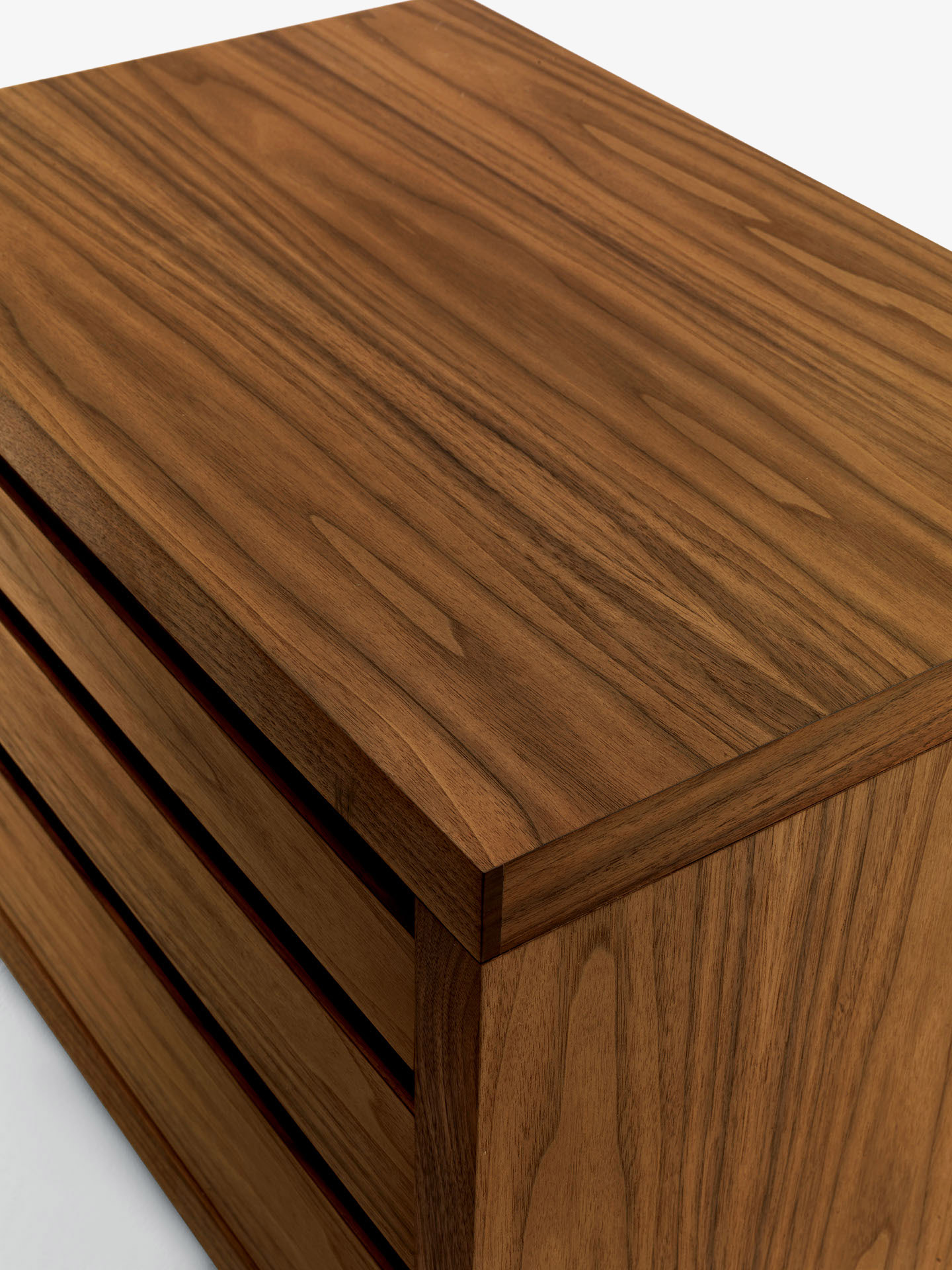 Nachttisch aus furnierter Tischlerplatte, mit 3 Schubladen mit Fronten aus Massivholz und mit traditioneller Schwalbenschanzverbindung gefertigt.