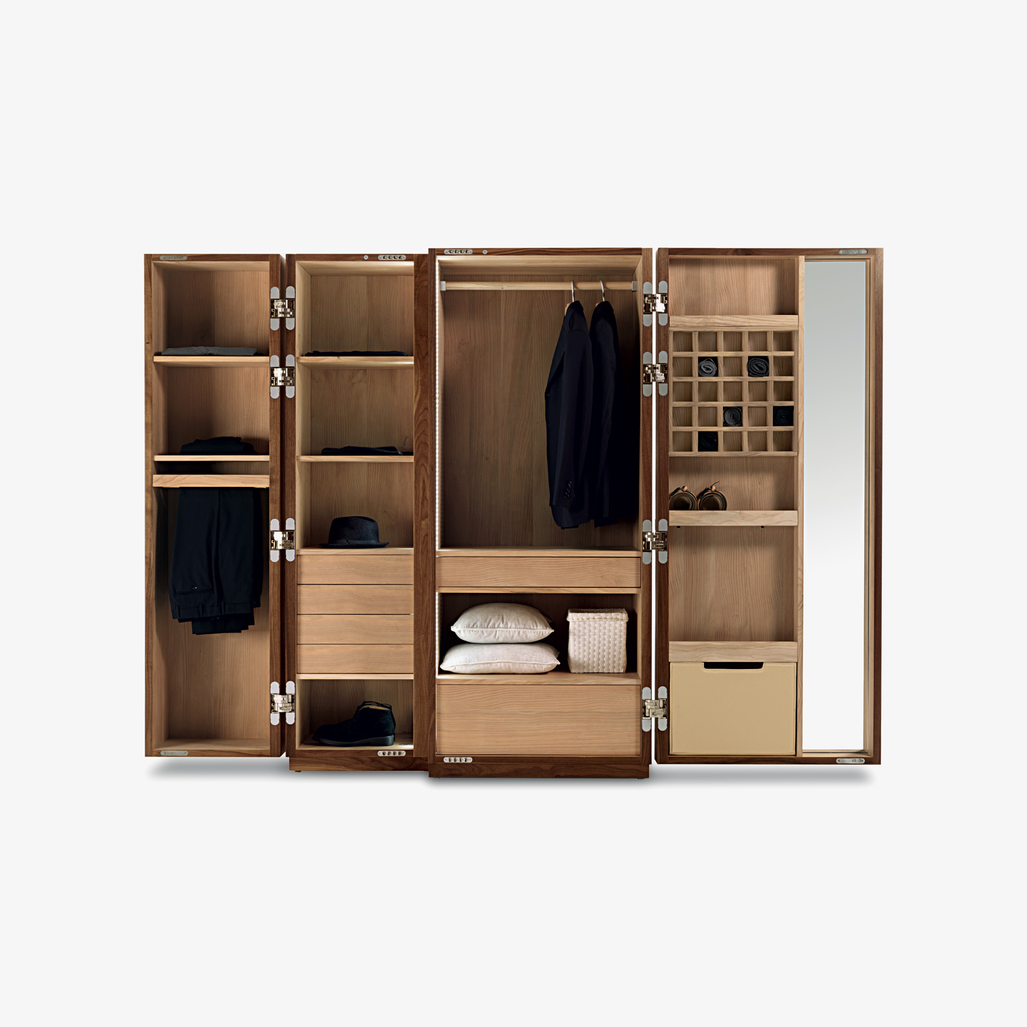Je nach Bedarf sind die Kleiderschränke auch in edlen Holzarten wie Nussbaum, Eiche mit oder ohne Knoten, Kirsche, Ulme und Ahorn erhältlich, die aus kontrollierten und programmierten Schnitten kommen.