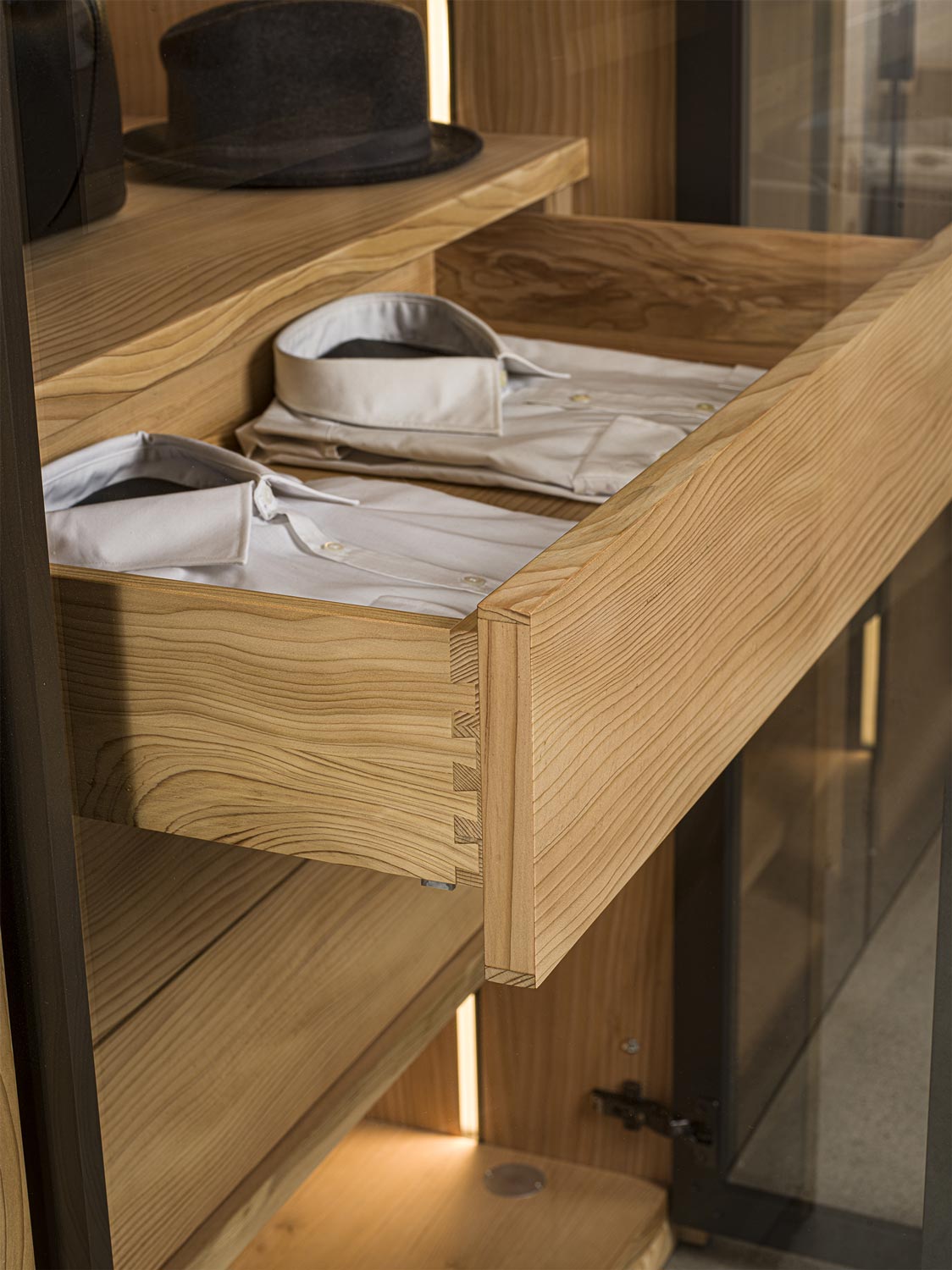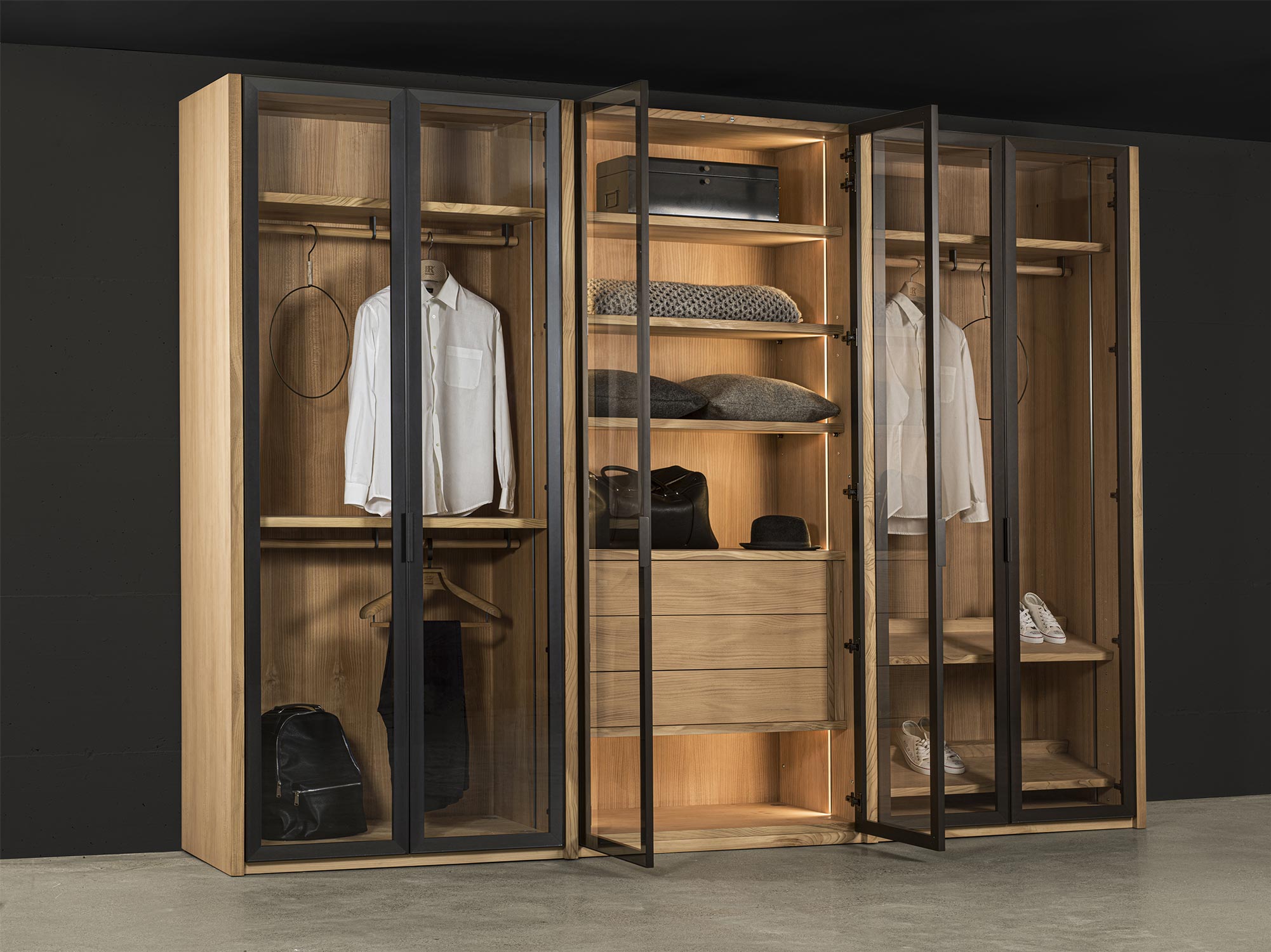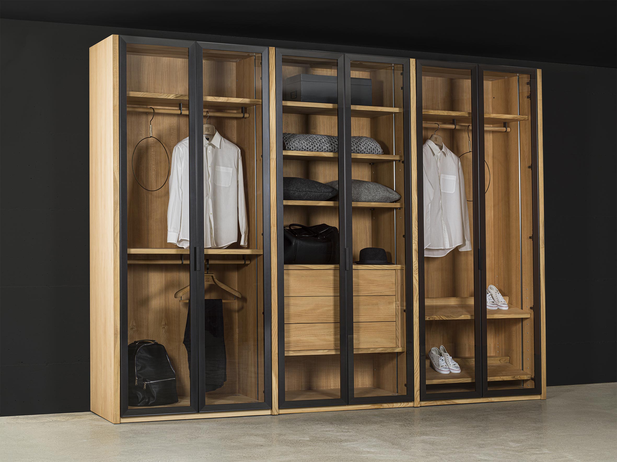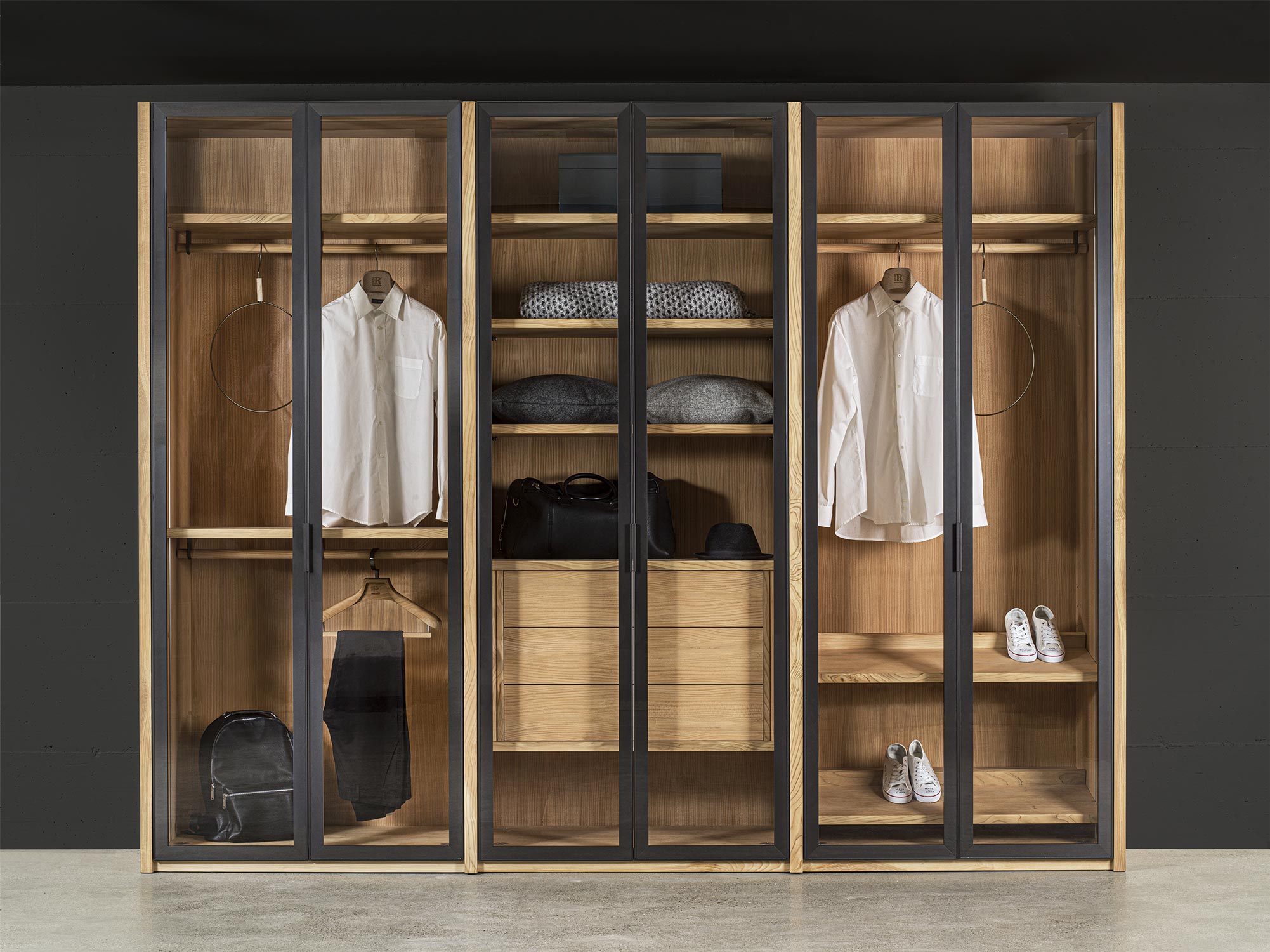 Schrank aus Tischlerplatte und Massivholz. Glastüren mit Rahmen aus Aluminium lackiert. Funktionelle Innenausstattung, je nach Wunsch erhältlich, mit Kleiderstangen, Einlegeböden, Schubladen mit traditioneller Schwalbenschwanzverbindung usw. Perfekt mit Innenausstattung aus duftendem Zedernholz, ideal gegen Kleidermotten. Auf Wunsch mit Led-Beleuchtung verfügbar. INNENAUSSTATTUNG NICHT INBEGRIFFEN (PREISE UNTER SCHRÄNKE BESTANDTEILE)