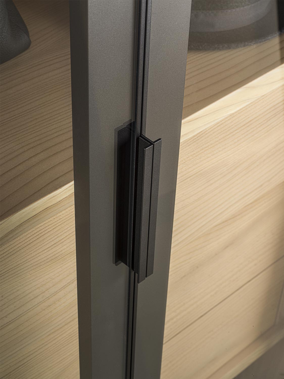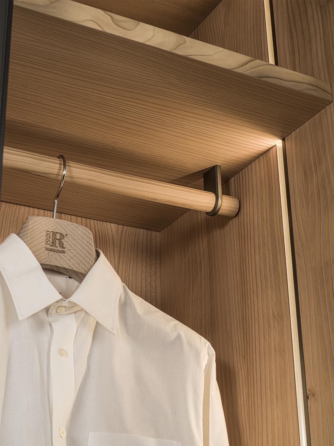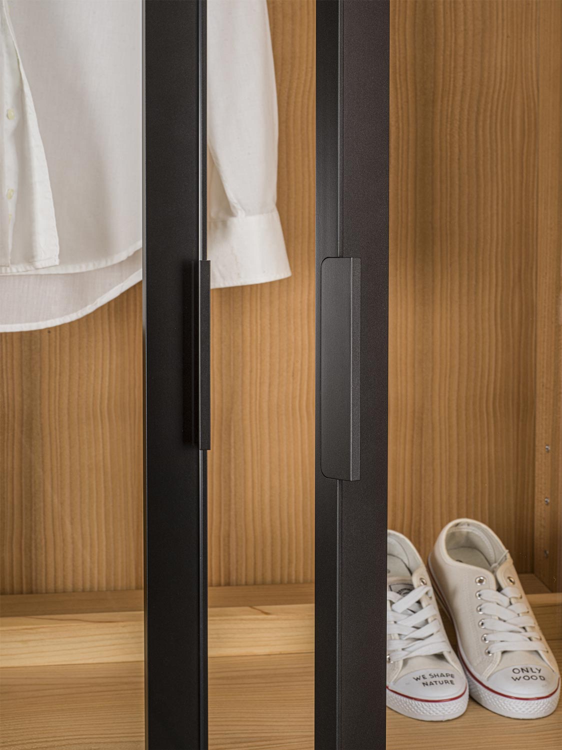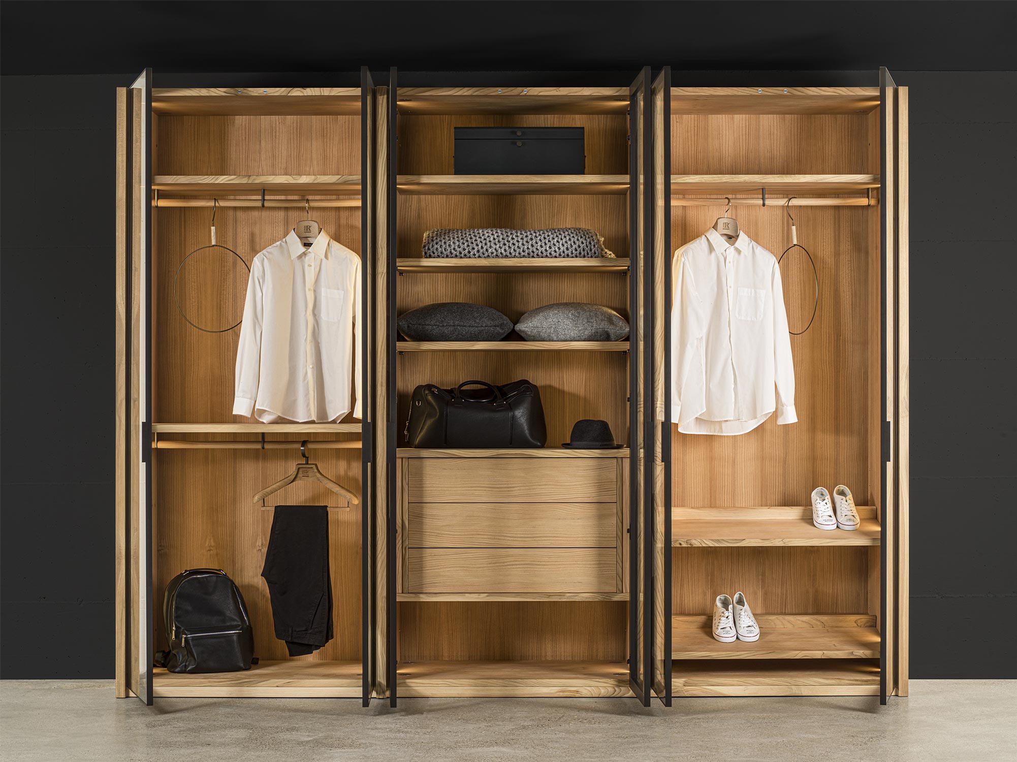 Schrank aus Tischlerplatte und Massivholz. Glastüren mit Rahmen aus Aluminium lackiert. Funktionelle Innenausstattung, je nach Wunsch erhältlich, mit Kleiderstangen, Einlegeböden, Schubladen mit traditioneller Schwalbenschwanzverbindung usw. Perfekt mit Innenausstattung aus duftendem Zedernholz, ideal gegen Kleidermotten. Auf Wunsch mit Led-Beleuchtung verfügbar. INNENAUSSTATTUNG NICHT INBEGRIFFEN (PREISE UNTER SCHRÄNKE BESTANDTEILE)