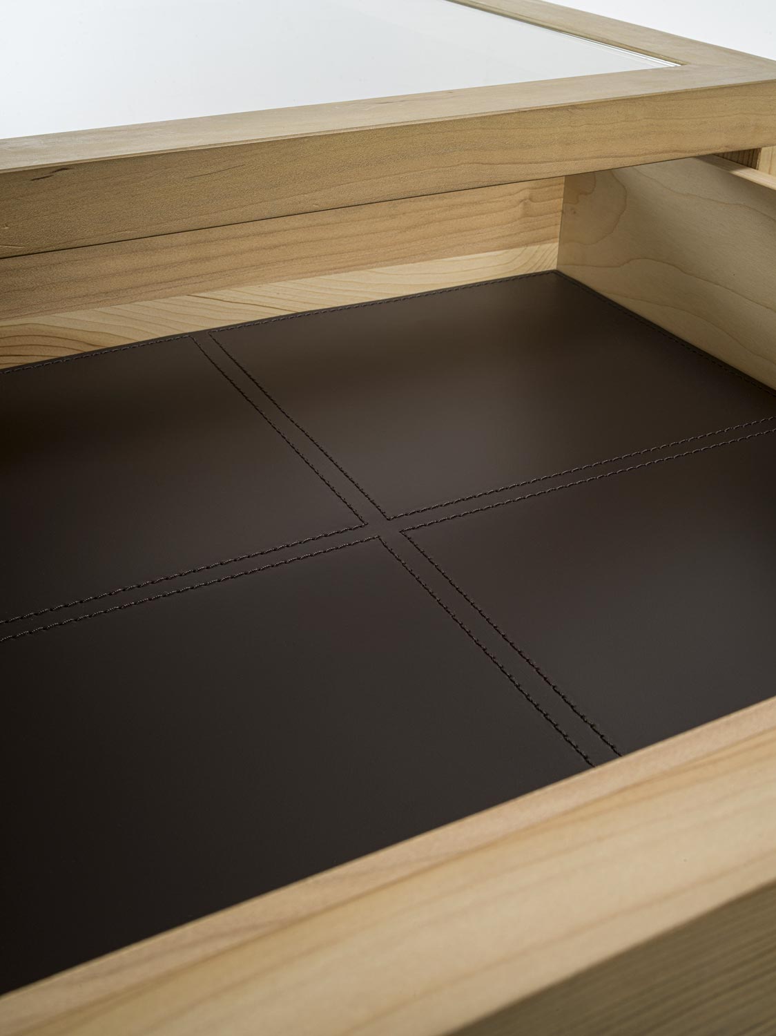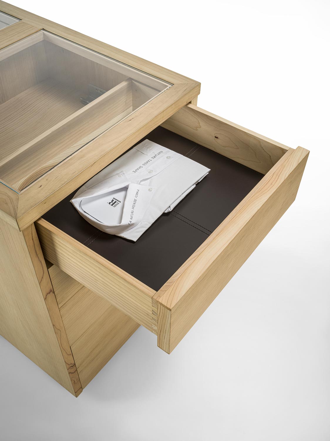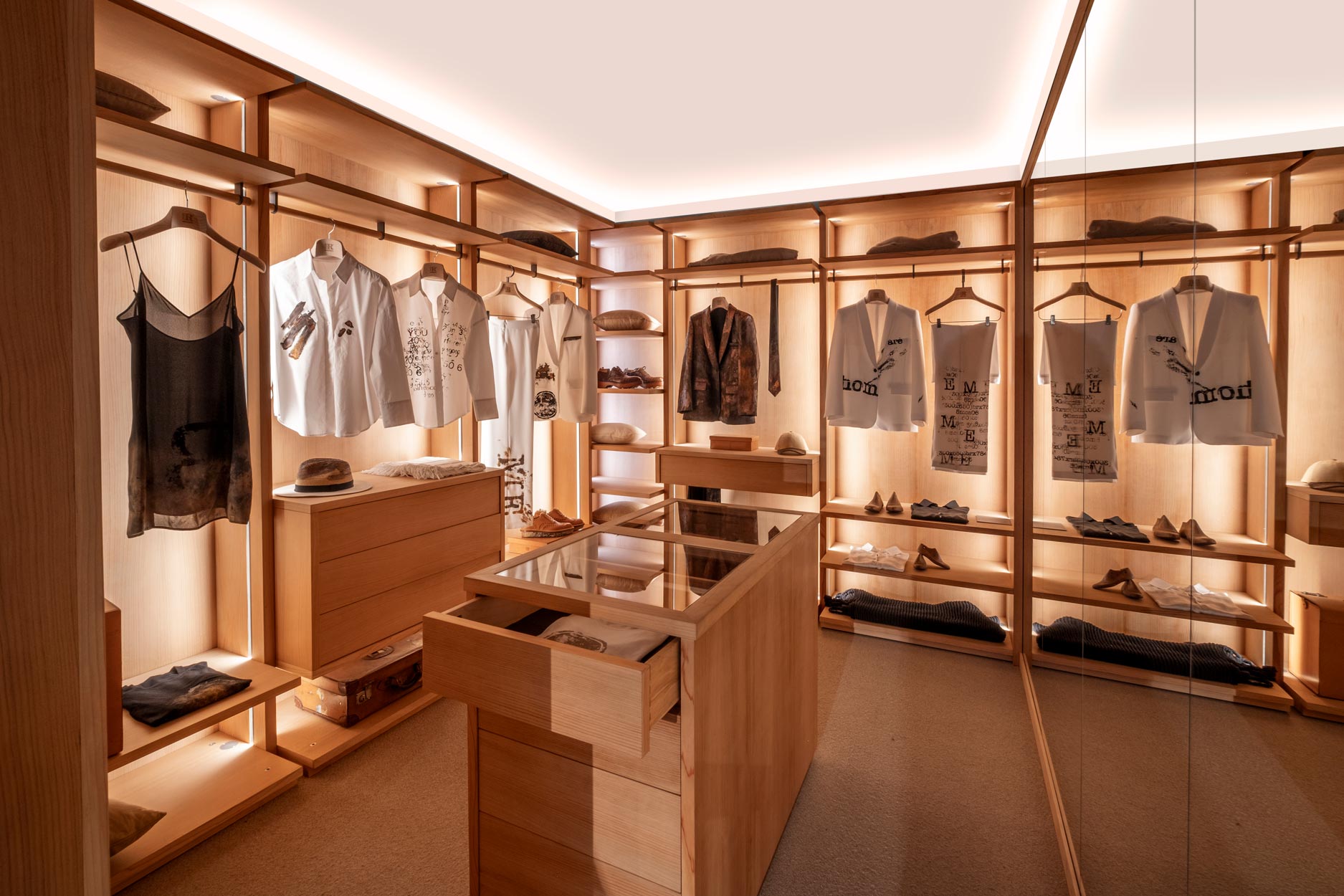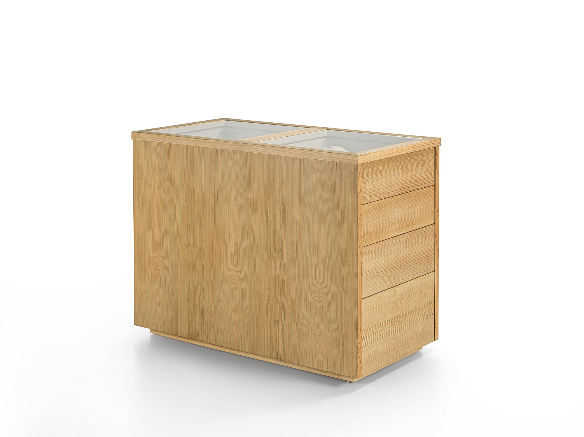 Das Schranksystem Avant wird durch ein zentrales Aufbewahrungselement ergänzt. Organisiert mit 4 beidseitig angeordneten Schubladen mit traditioneller Schwalbenschwanzverbindung. Ideal für die Aufbewahrung von Accessoires für Sie und Ihn, jedes mit seinem eigenen Platz. Hergestellt aus Tischlerplatte und Massivholz und mit einer Glasplatte.