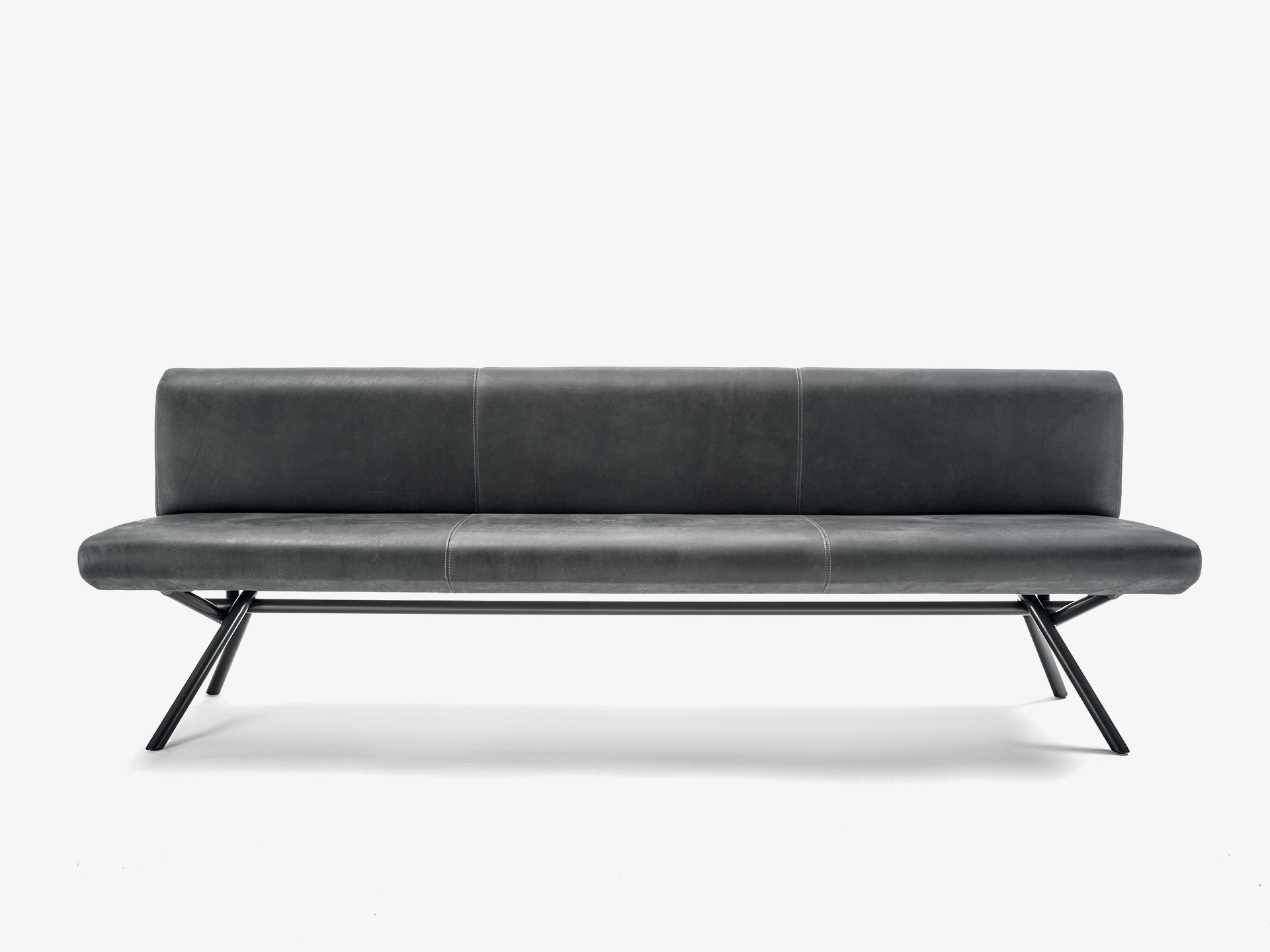 Bank mit Struktur aus Tischlerplatte, gepolstert und mit Leder- oder Stoffbezug mit dekorativen Nähten. Design essentiell und linear, besteht das Untergestell aus einem gebogenen hohlen Stahlrohr. Auf Anfrage aus einem gebogenem vollem Stahlrohr erhältlich.