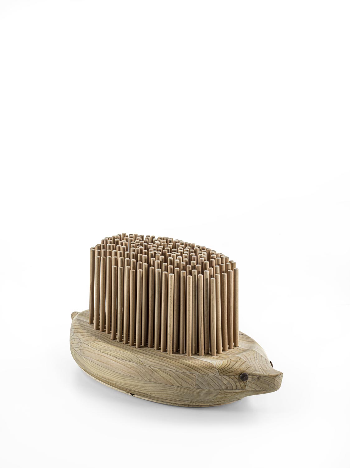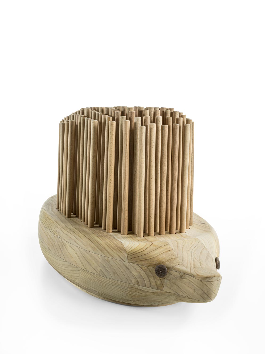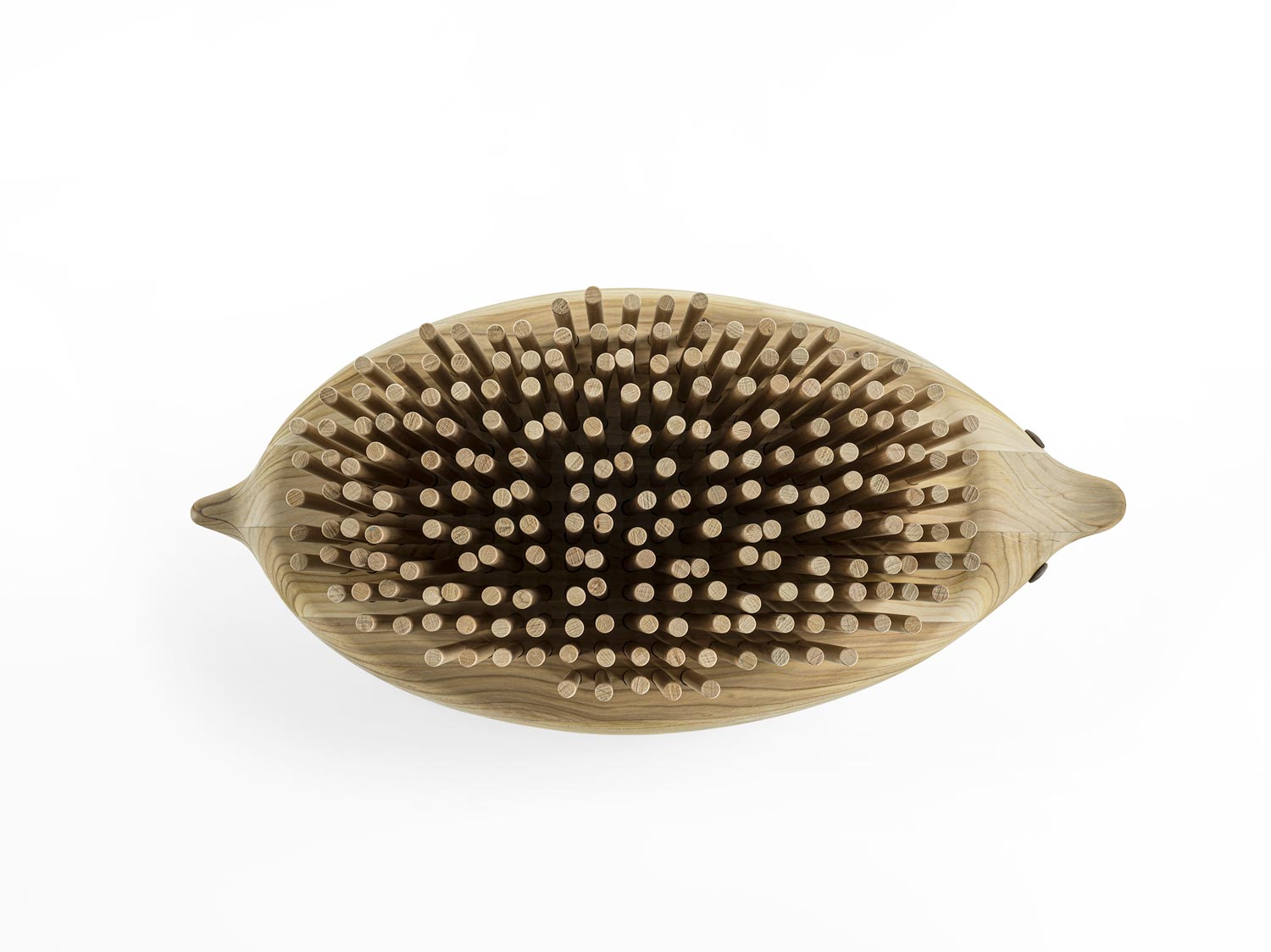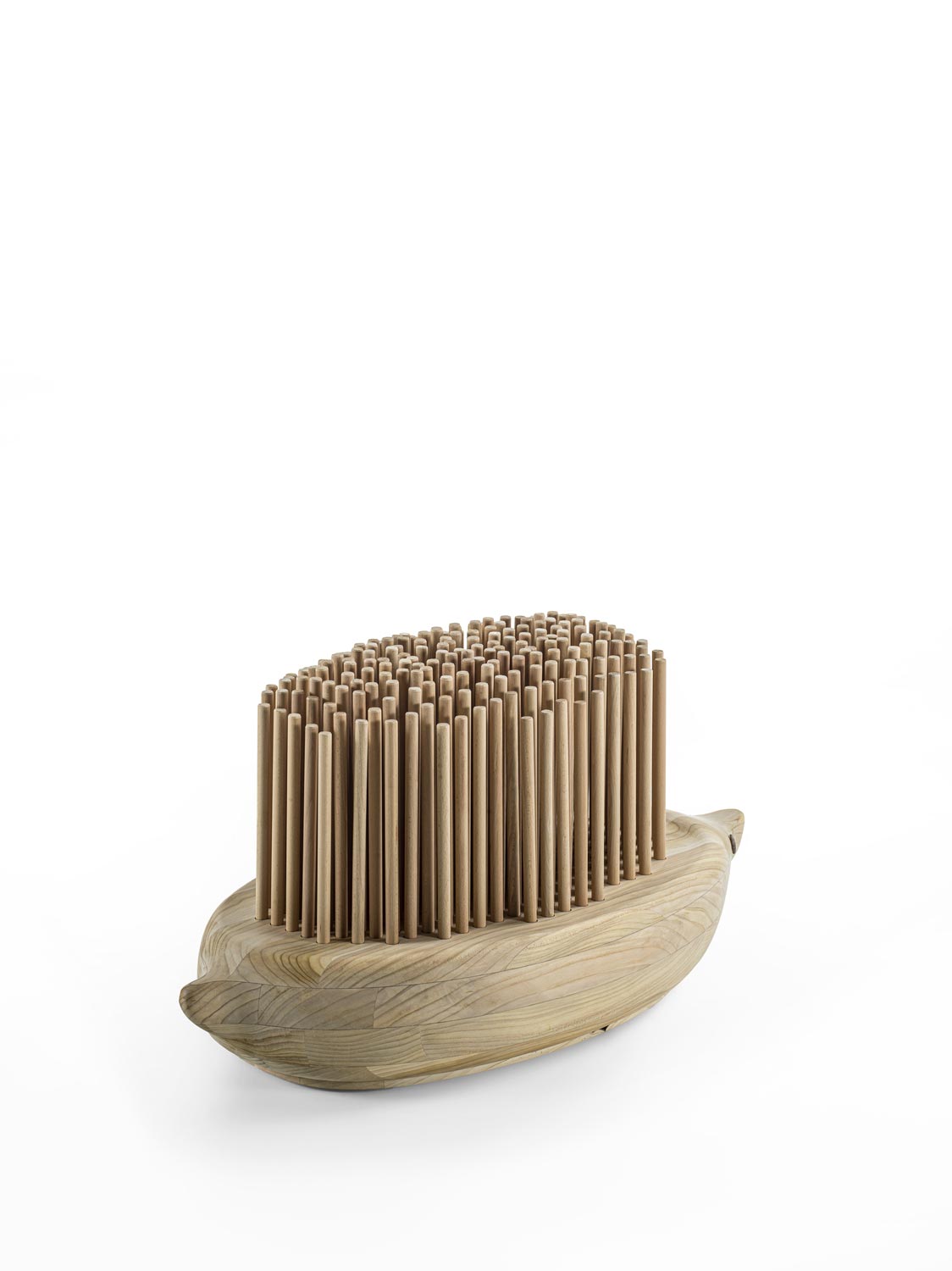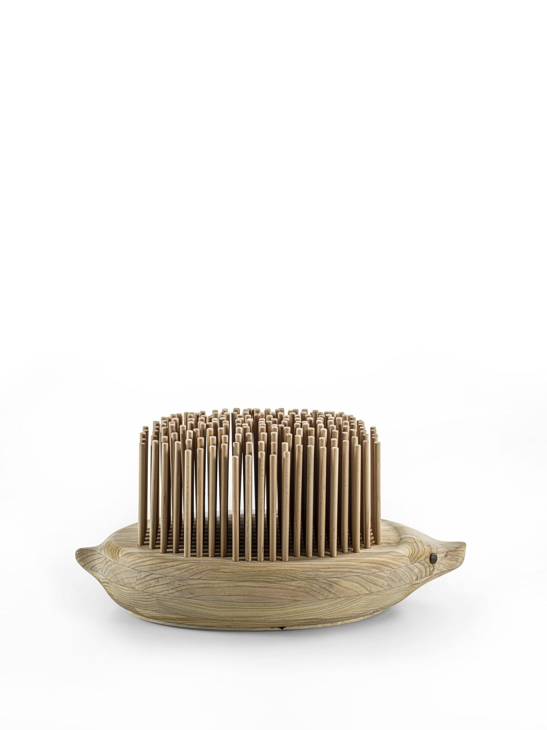 Bank aus massivem duftenden Zedernholz mit einem Design, das an die Form eines Igels erinnert. Die „Stacheln“ bestehen aus zylindrischen Massivholzdübeln, die auf ein abfederndes Kissen gesetzt sind, das Komfort und Biegsamkeit garantiert. Die Herkunft dieses Konzepts ist in der oxakanischen Tradition der Animalitos zu suchen, bei der in die natürlichen Formen der Äste eines Baumes Tierfiguren mit malerischen ornamentalen Verzierungen geschnitzt werden.