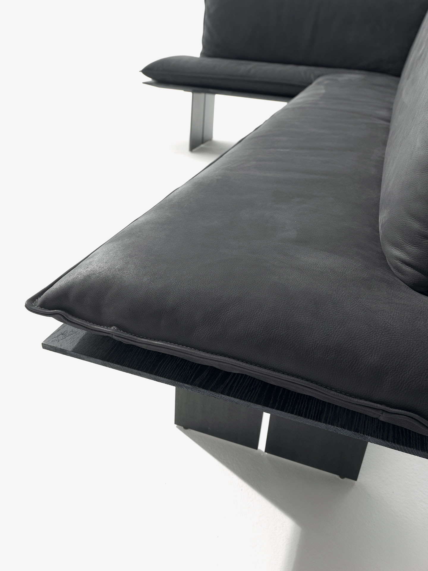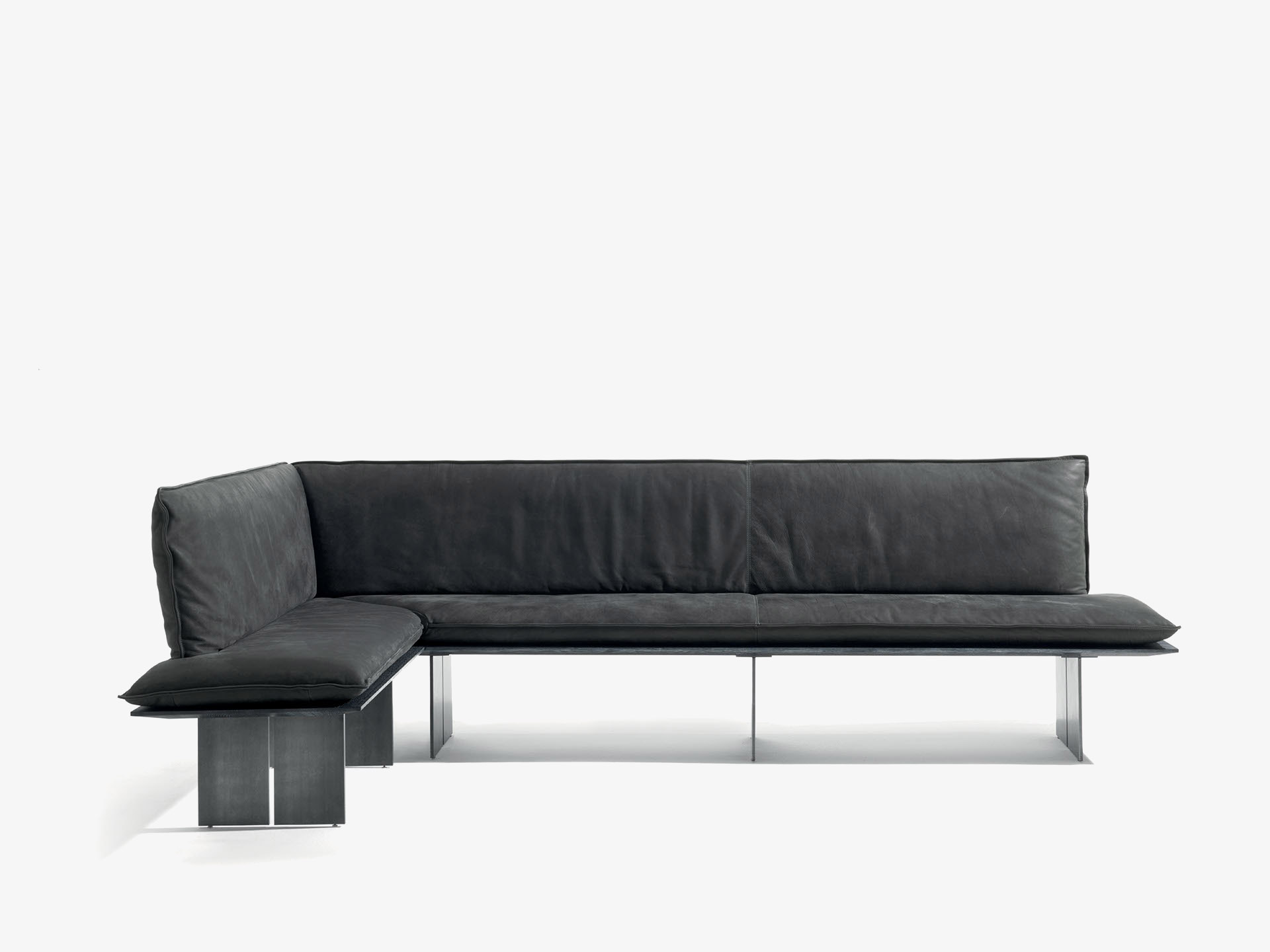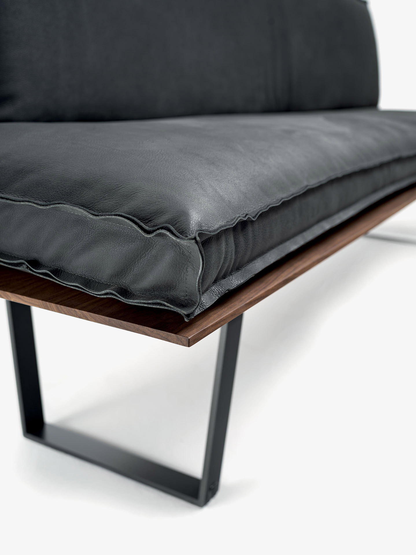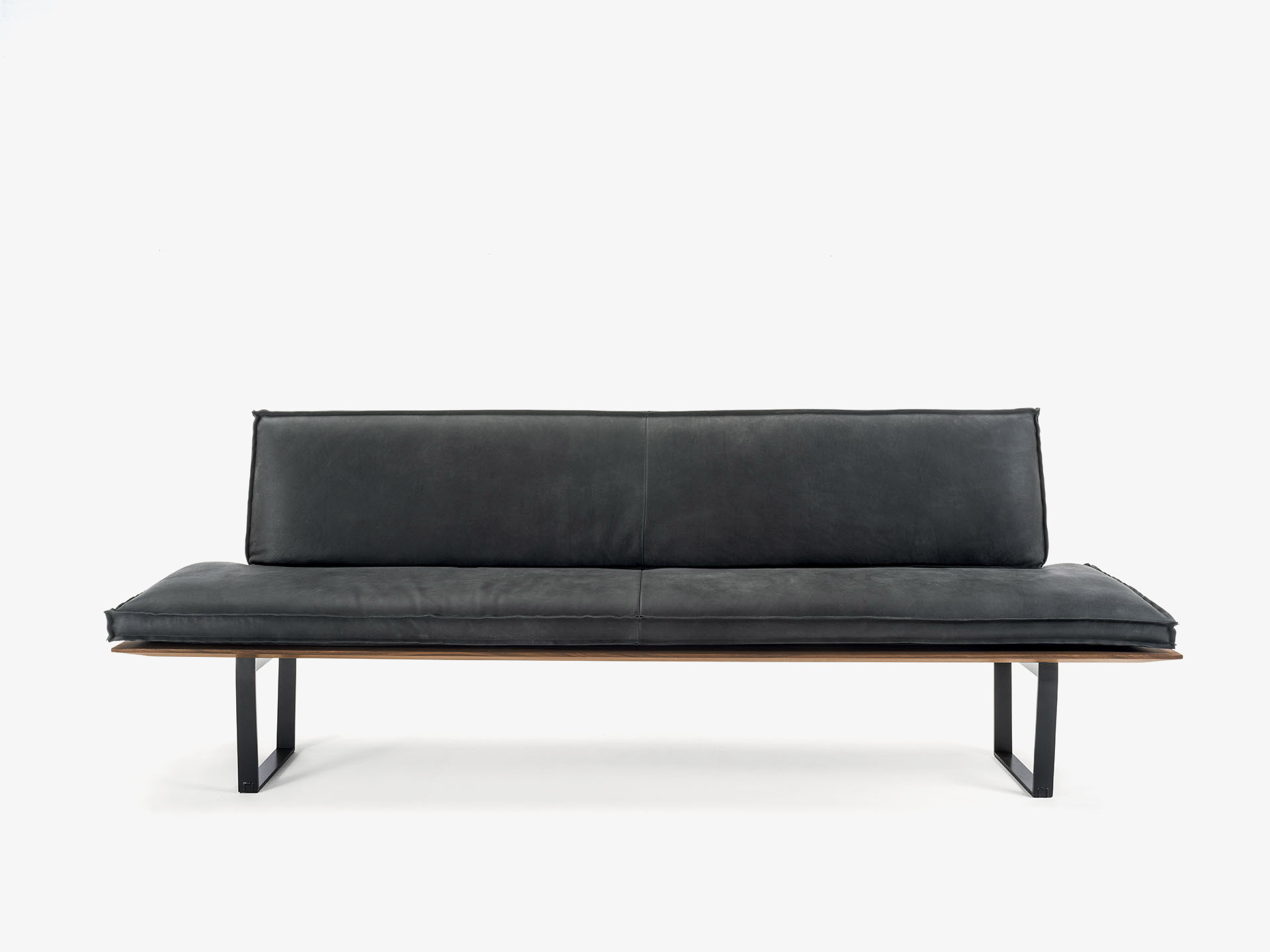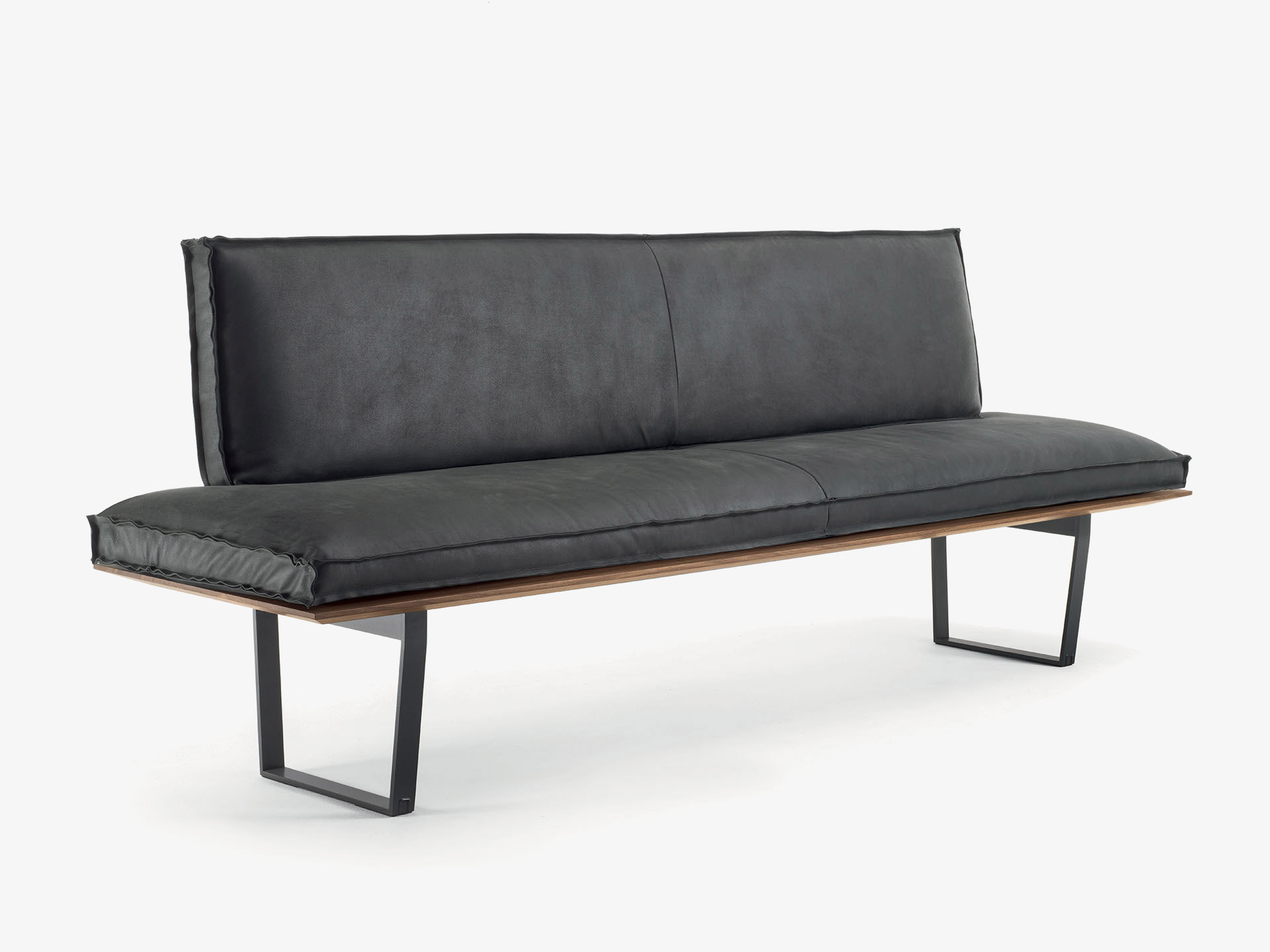Bank mit Massivholzstruktur und Gestell aus Eisen. Die Sitz-und Rückenkissen sind aus Leder oder Stoff mit dekorativen Nähten bezogen, in zwei verschiedenen Varianten erhältlich. Auch als Eckbank erhältlich.