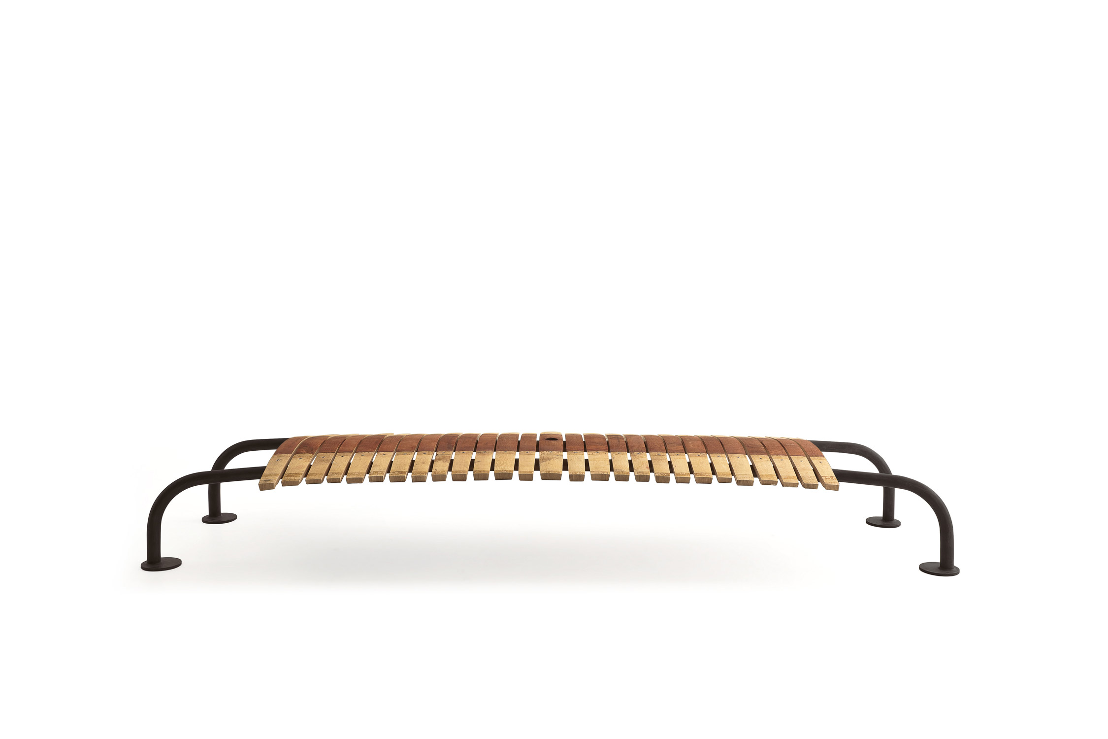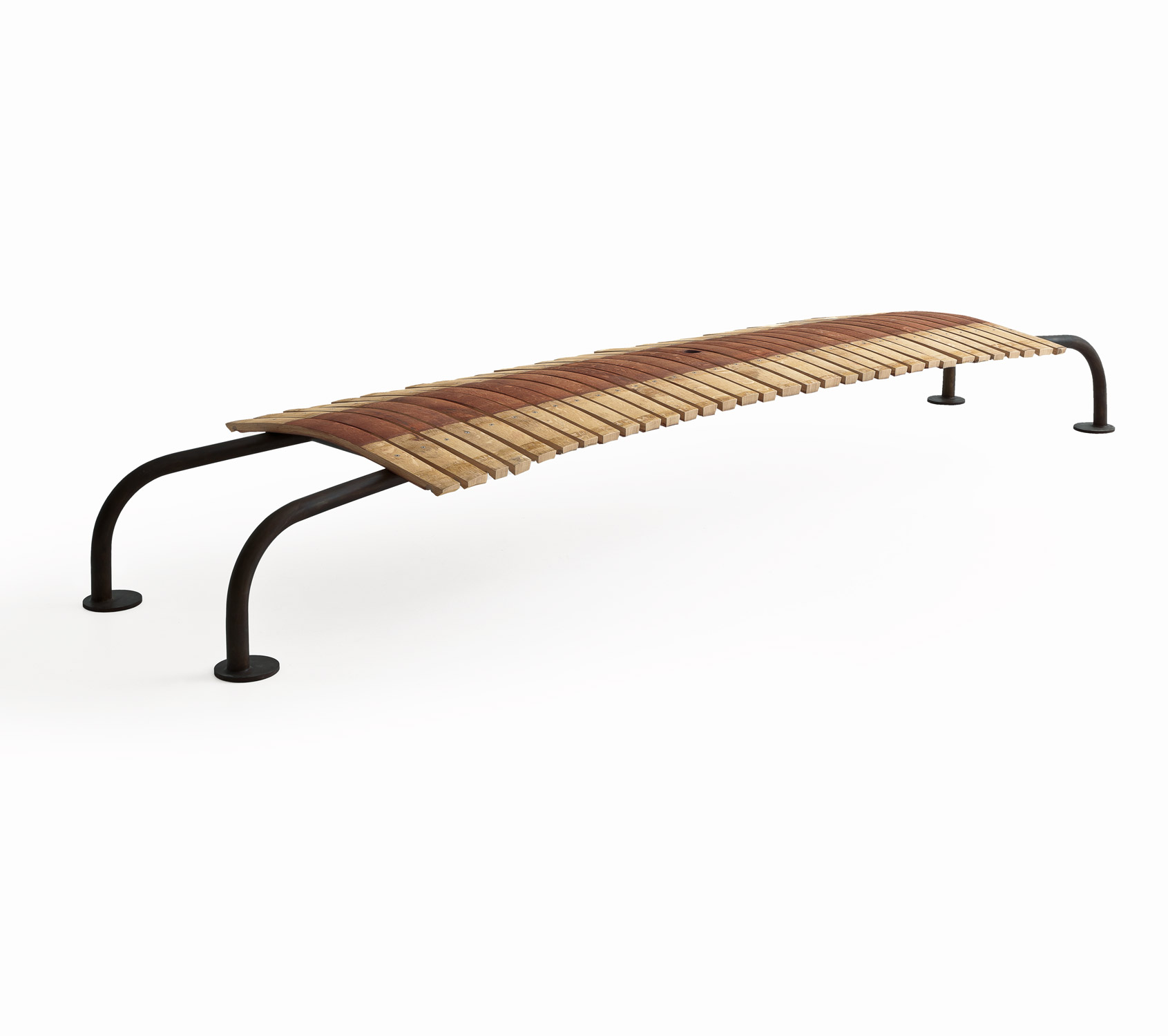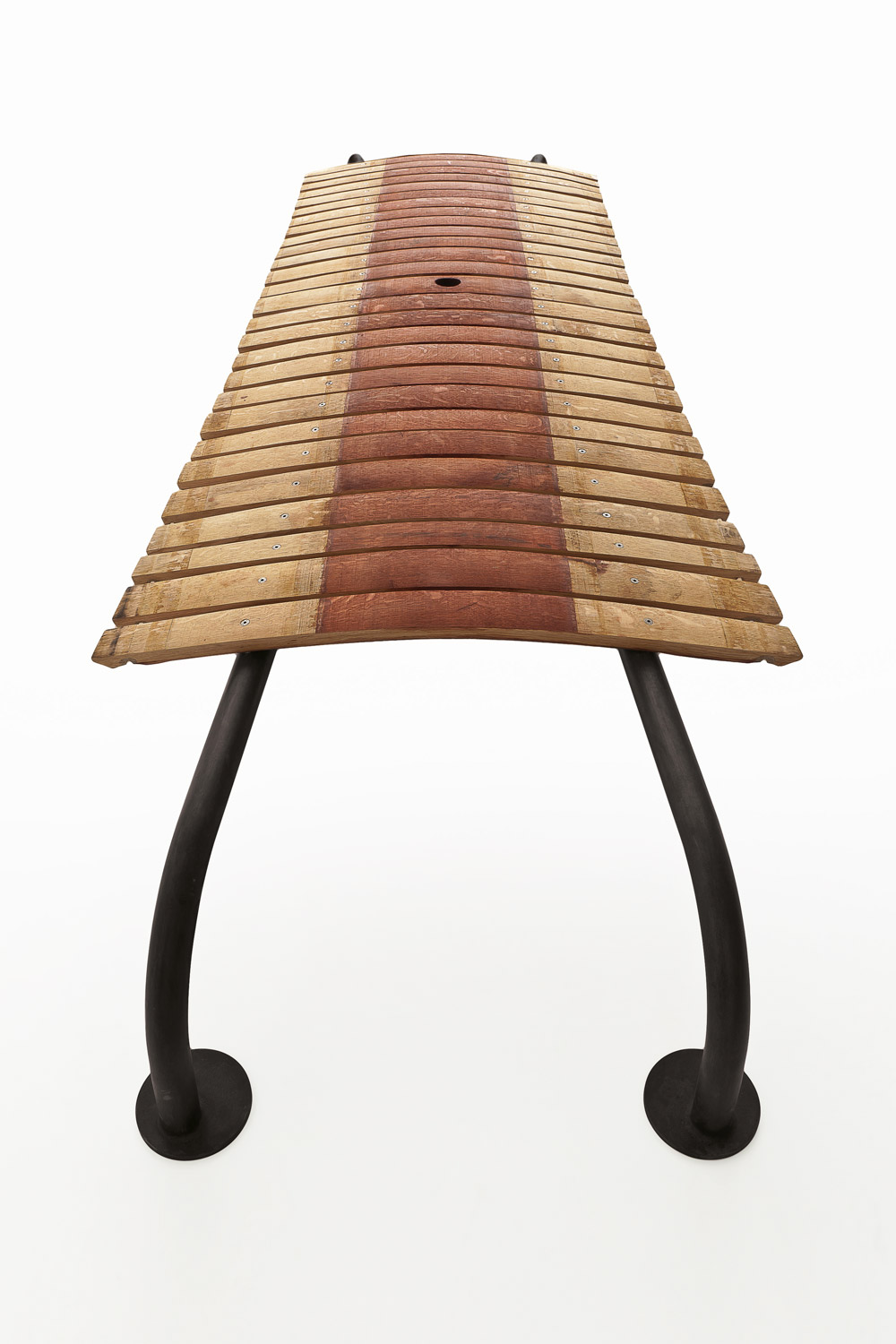 Holzbank aus einer Kombination von Eichenstäben von Barrique-Fässern. Gebogener Eisenfuß.