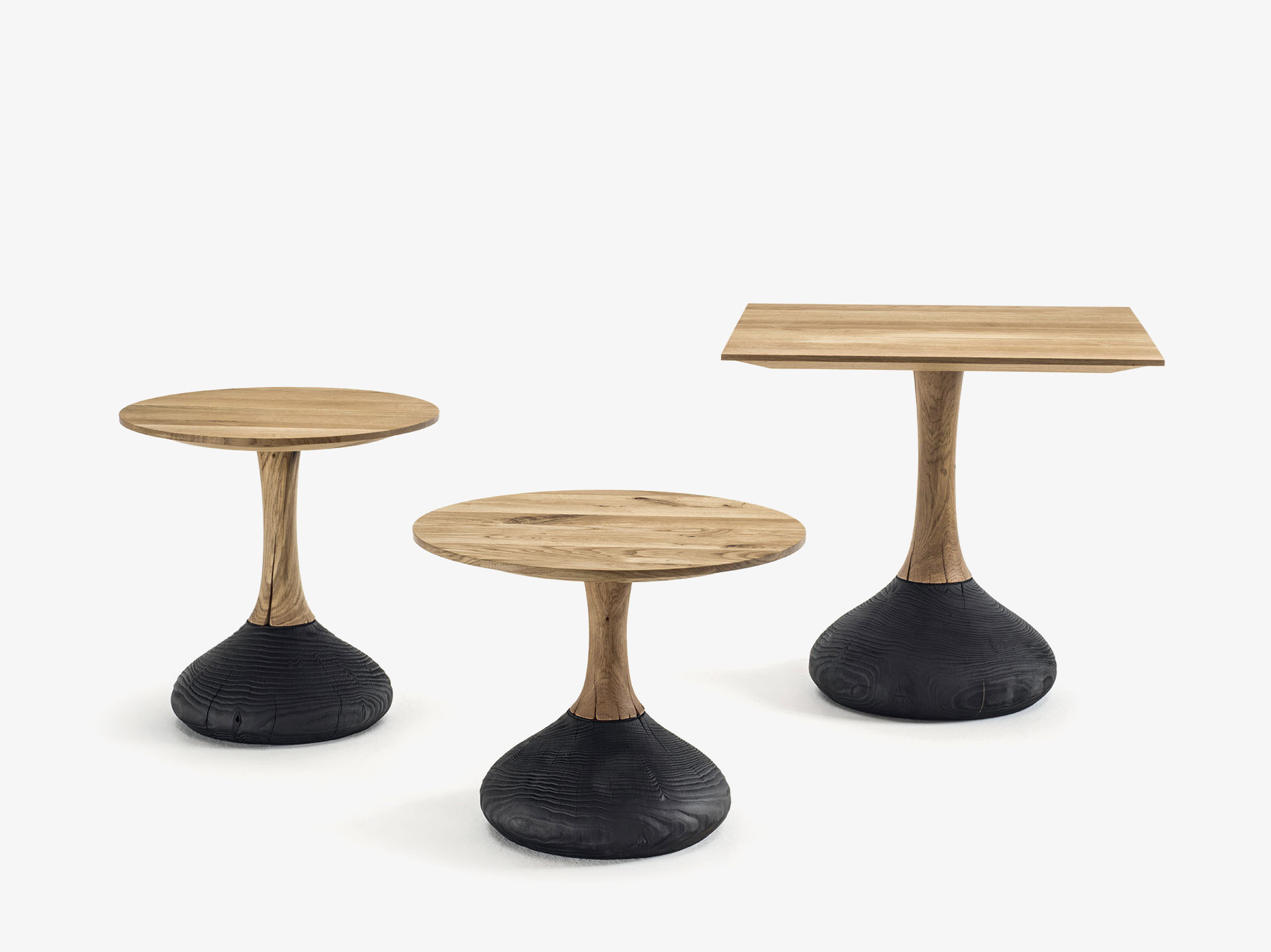 Runder oder quadratischer Tisch mit Platte bestehend aus verleimten Massivholzleisten. Gestell bestehend aus einem mittleren Bein im gleichen Holz wie die Platte und unterem Teil in Zeder, Vulcano Ausführung.