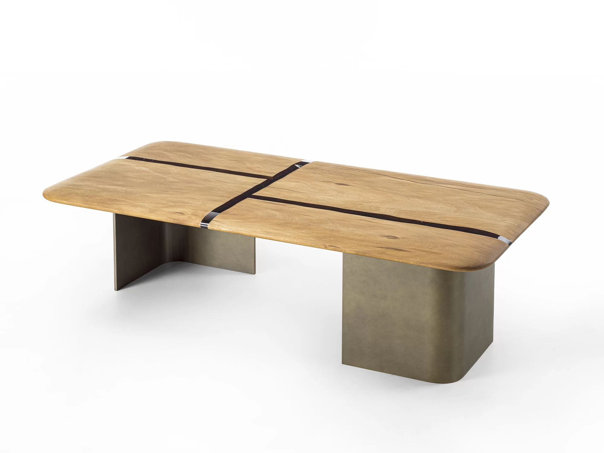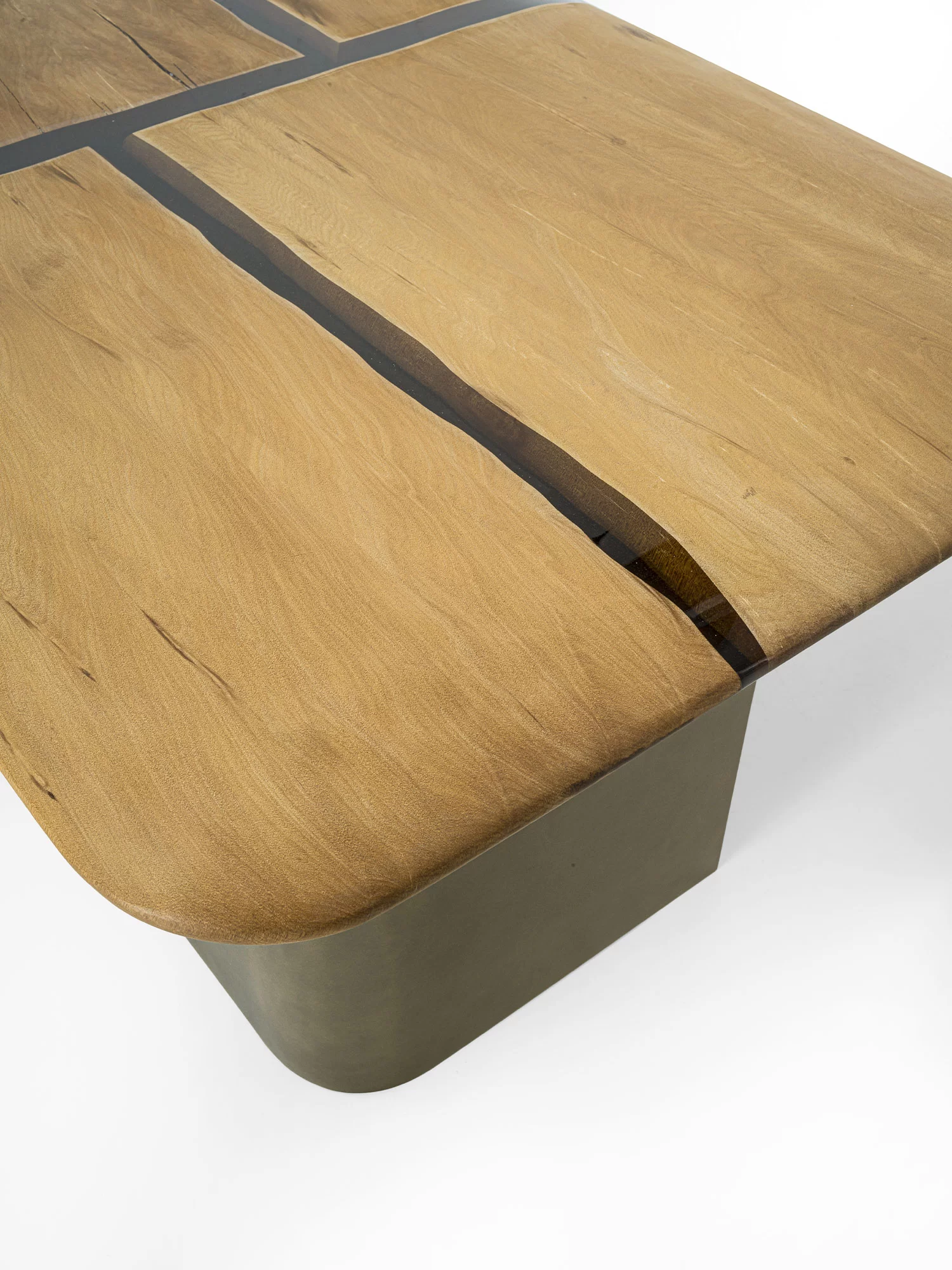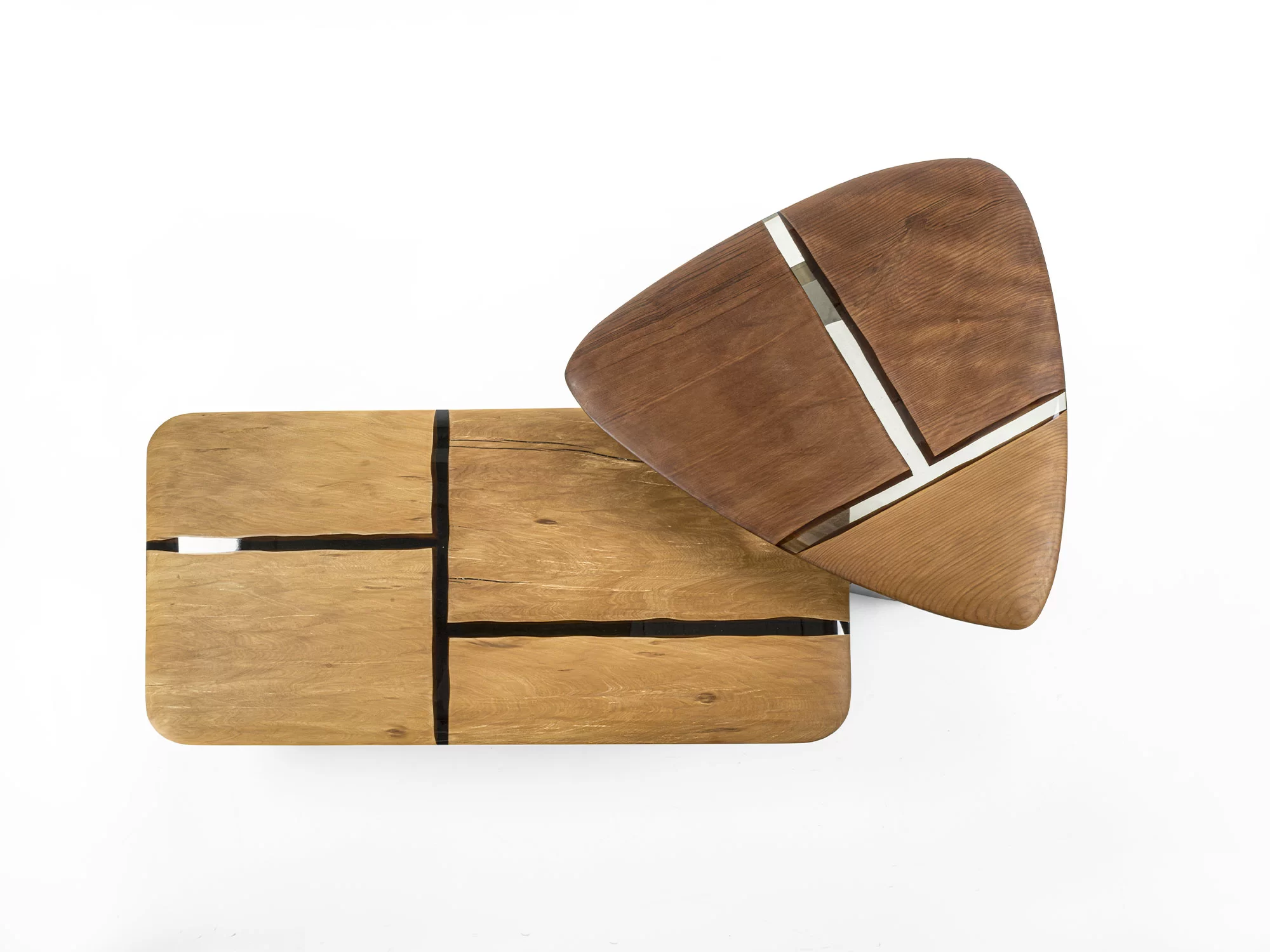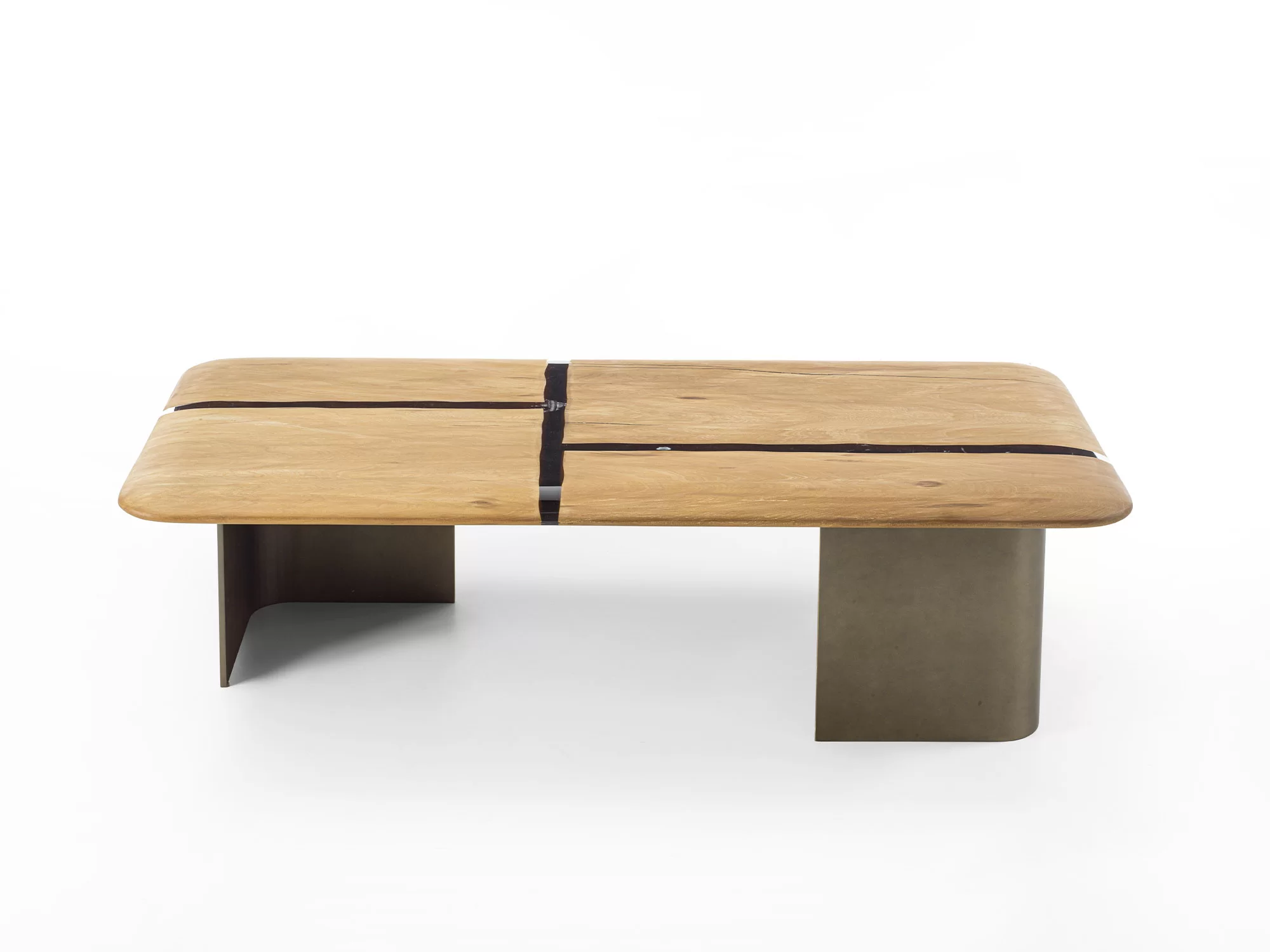 Couchtische, deren Platte aus der Kombination von Kauri-Holzteilen mit Harzeinsätzen entsteht, die zusammen dynamische und raffinierte Geometrien ergeben. Mit Eisengestell, erhältlich in zwei Höhen. Die dünne Platte verleiht Leichtigkeit.