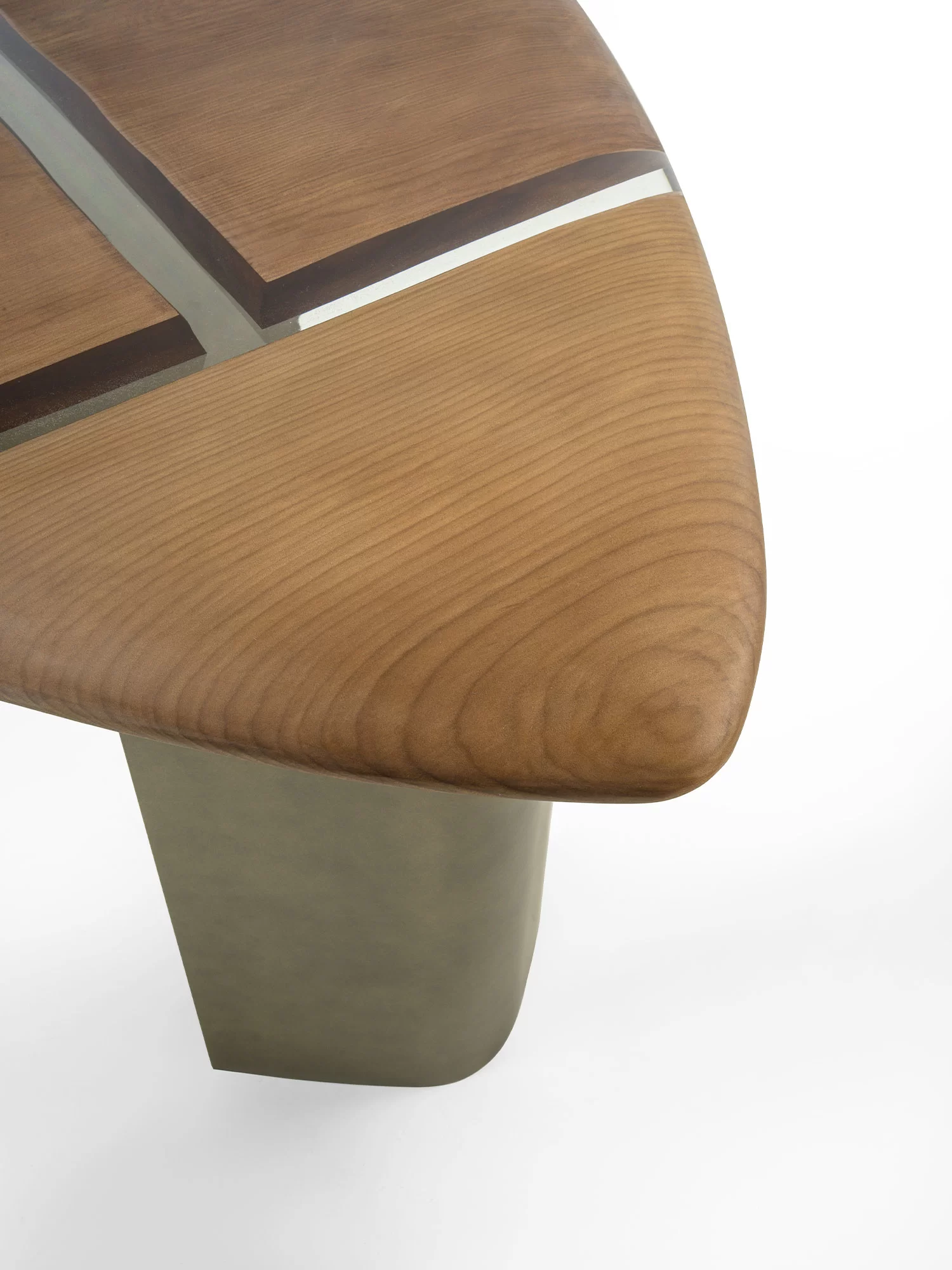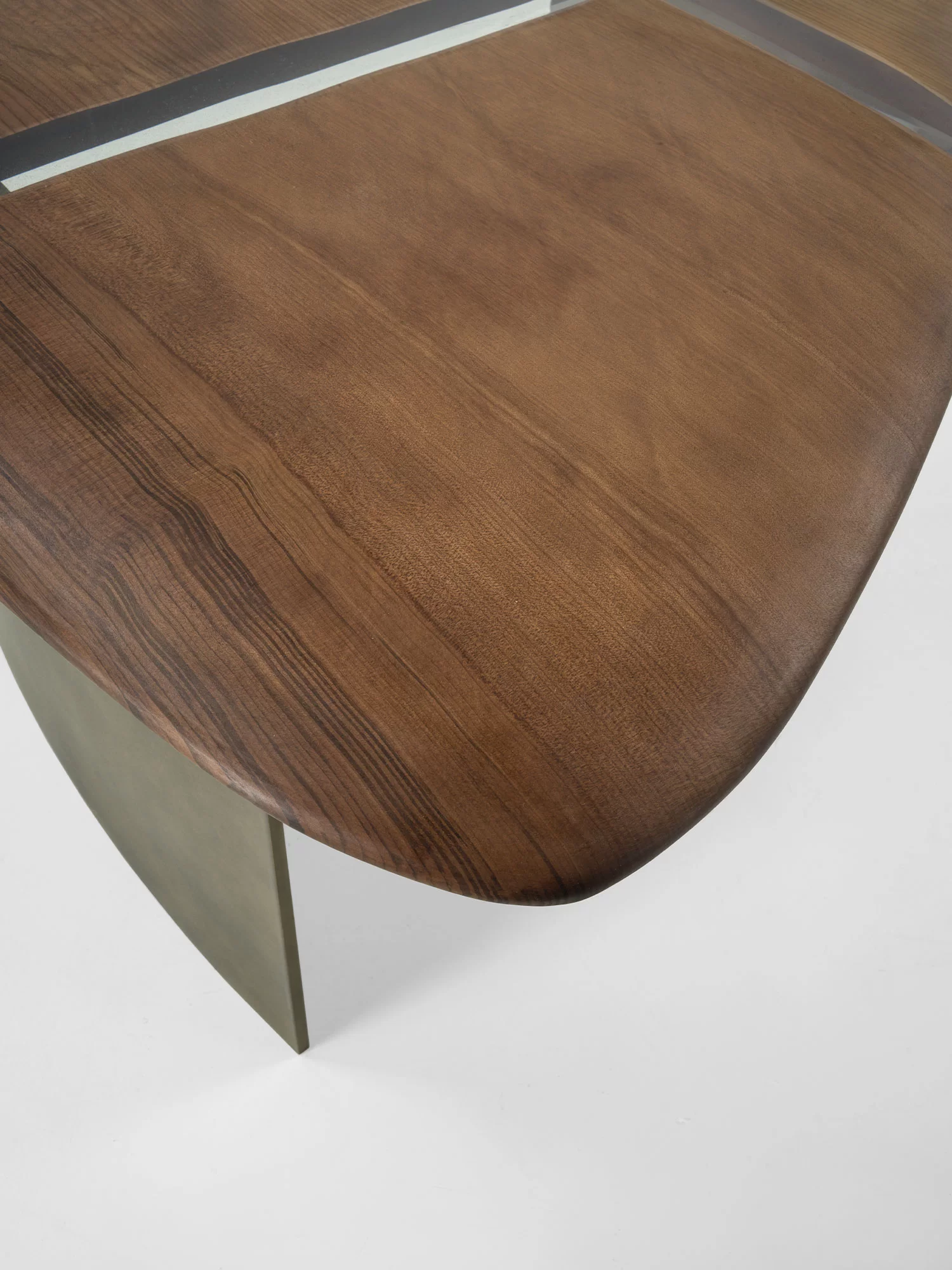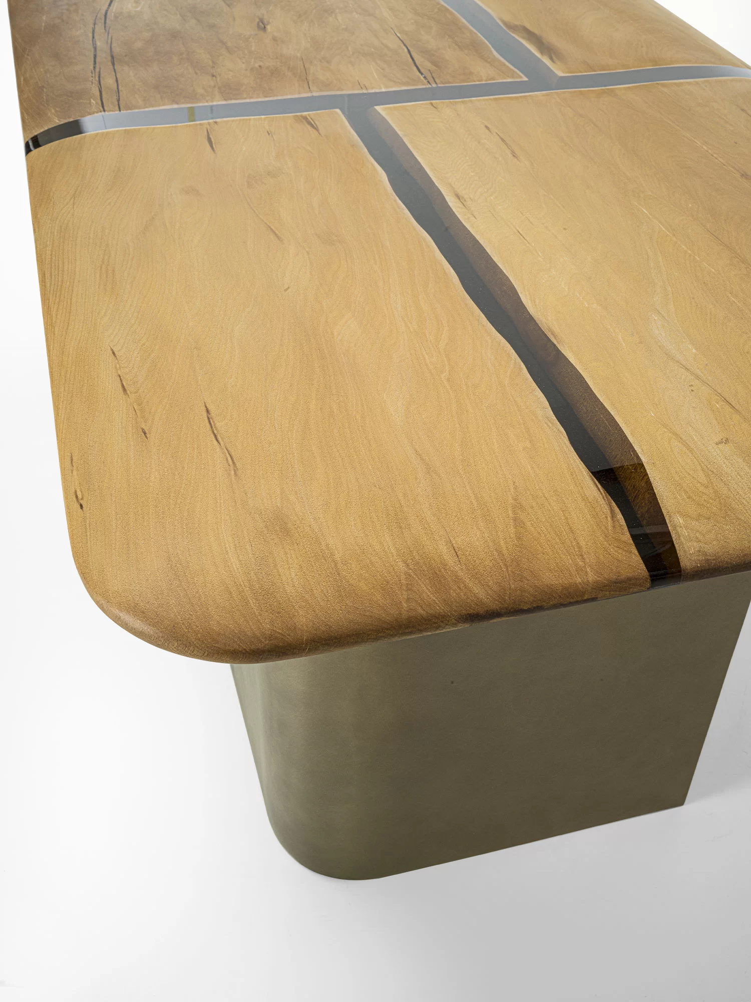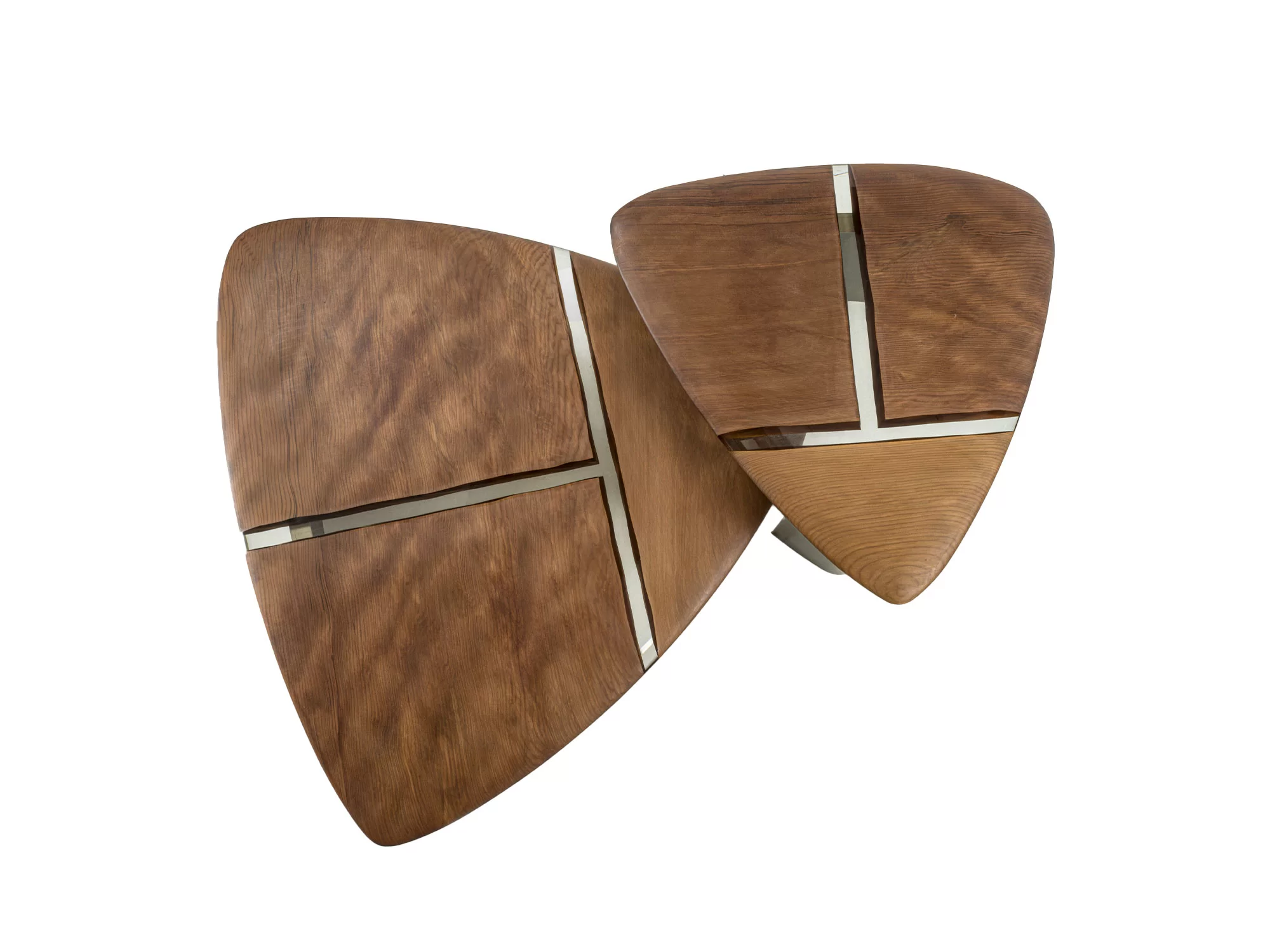 Couchtische, deren Platte aus der Kombination von Kauri-Holzteilen mit Harzeinsätzen entsteht, die zusammen dynamische und raffinierte Geometrien ergeben. Mit Eisengestell, erhältlich in zwei Höhen. Die dünne Platte verleiht Leichtigkeit.