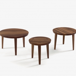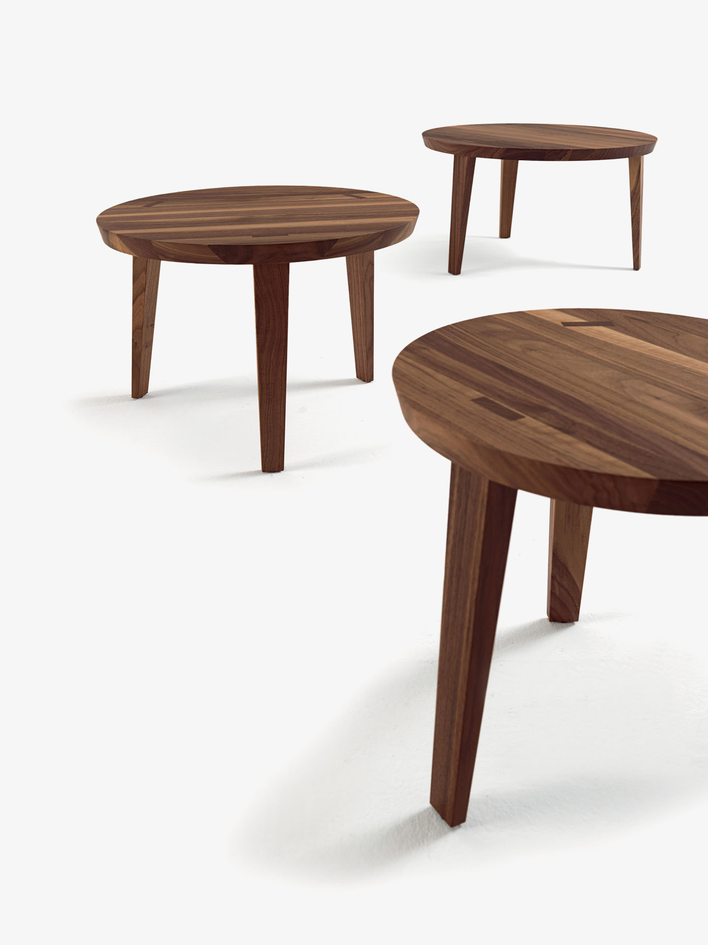 3 Satz-Couchtischen in verschiedenen Durchmessern und Höhen erhältlich und völlig aus Massivholz gefertigt. Sie können ineinander geschoben werden. Die Beine sind durch die Platte durchstossend und auf der Oberfläche sichtbar.