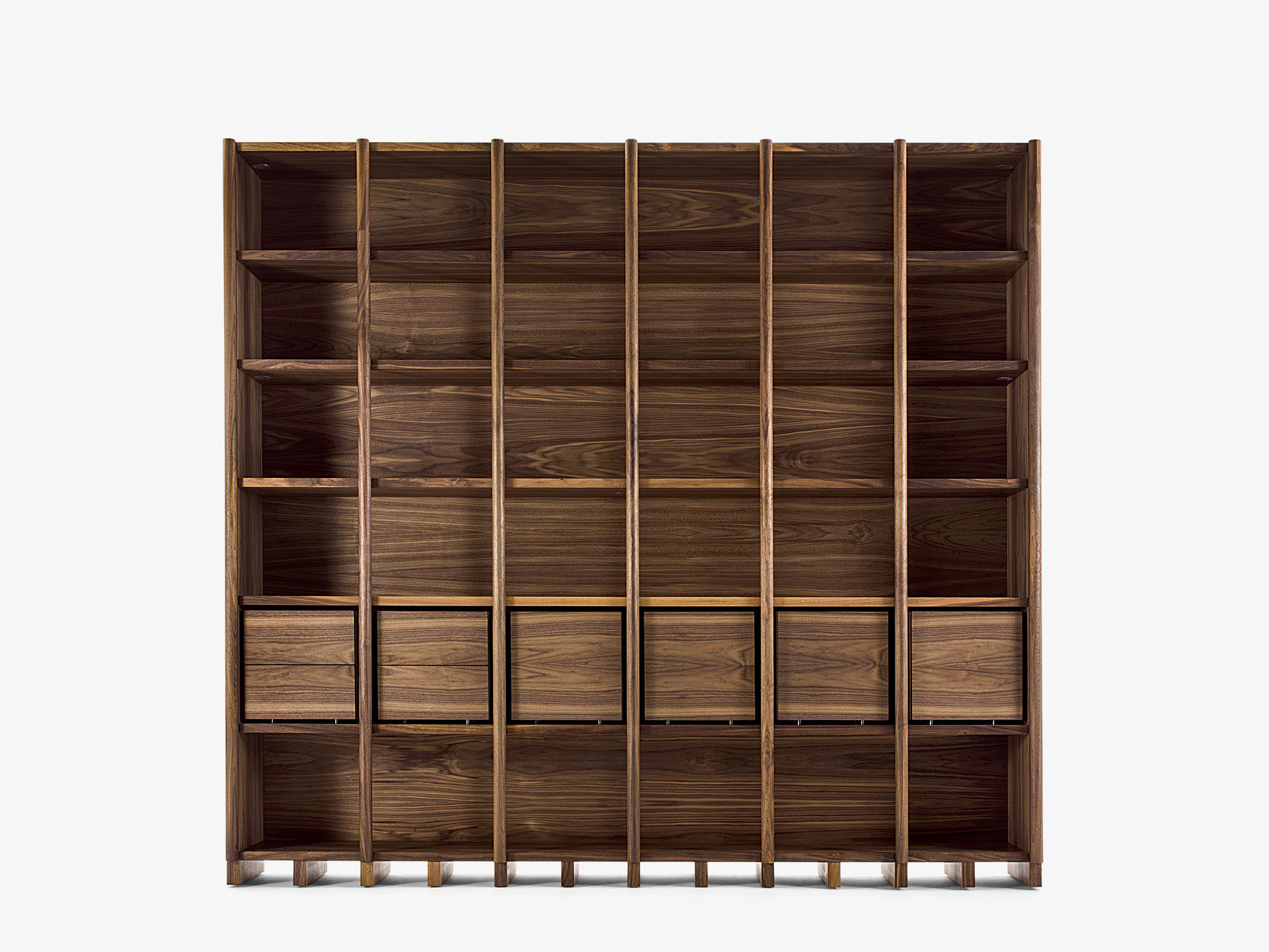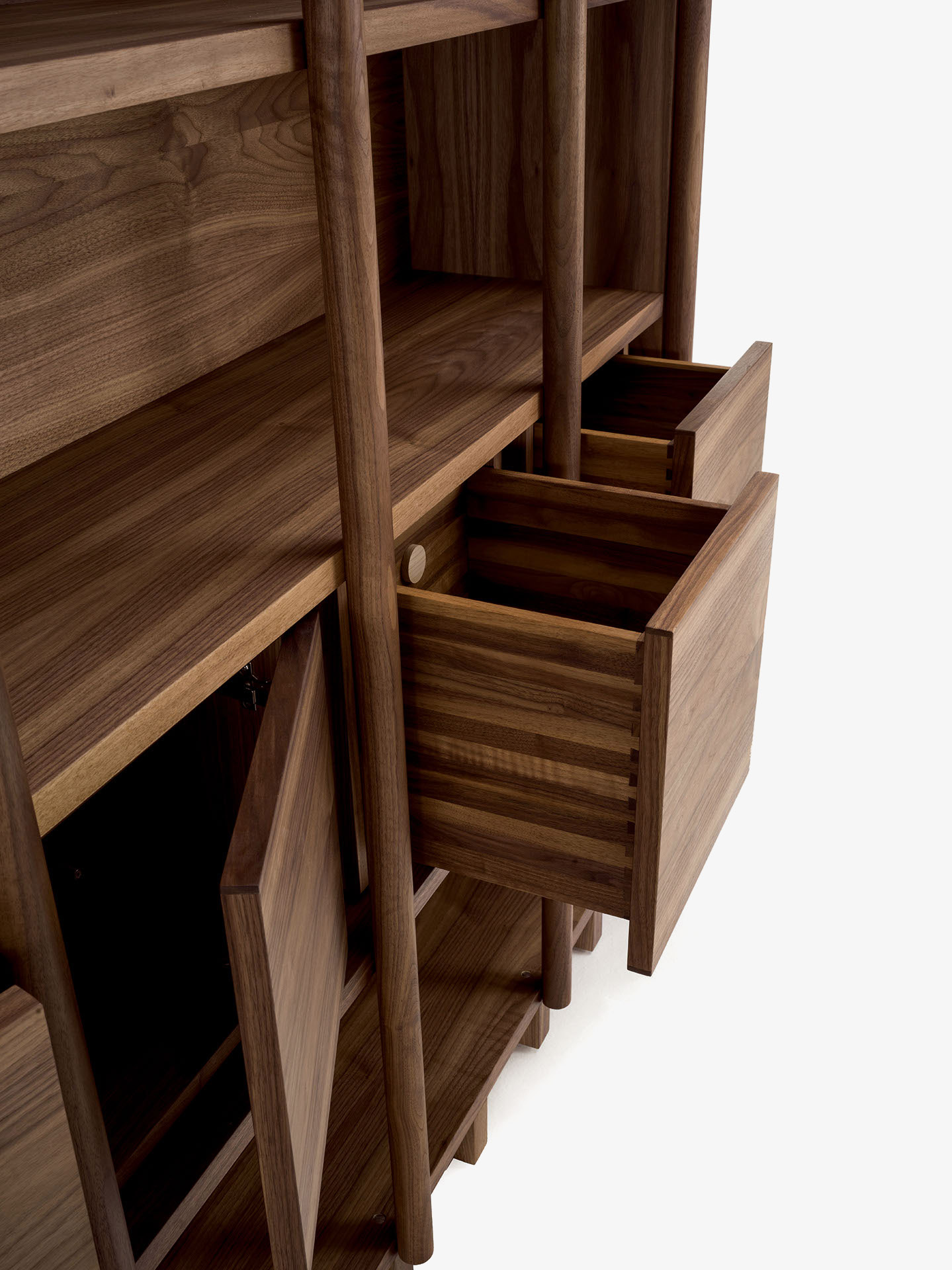 Bücherregal aus Massiv- und Furnierschichtholz, gekennzeichnet durch ein System von Seiten und Einlegeböden mit Sockel. Es kann an verschiedene Einrichtungsbedürfnisse angepasst werden und kann mit Doppeltüren und Schubladen mit Schwalbenschwanzverbindung und mit Push-Pull-Öffnungssystem geliefert werden.