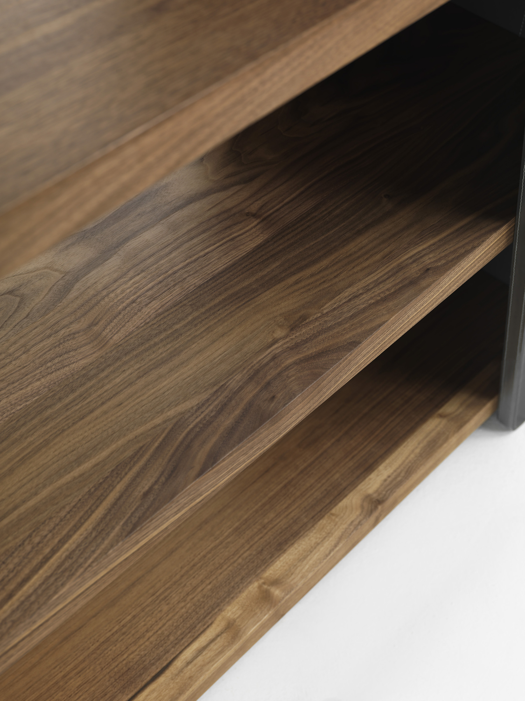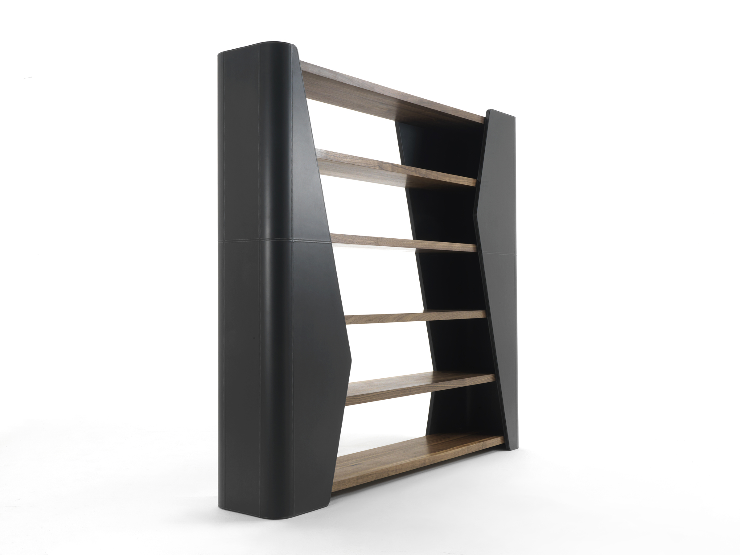 Bücherregal das sich durch asymmetrische Stützen aus gebogenem und geformtem Schichtholz auszeichnet, die entweder furniert oder mit Leder überzogen sind und in die 6 Einlegeböden aus furniertem Schichtholz mit einer Stärke von 5 cm eingefügt werden.