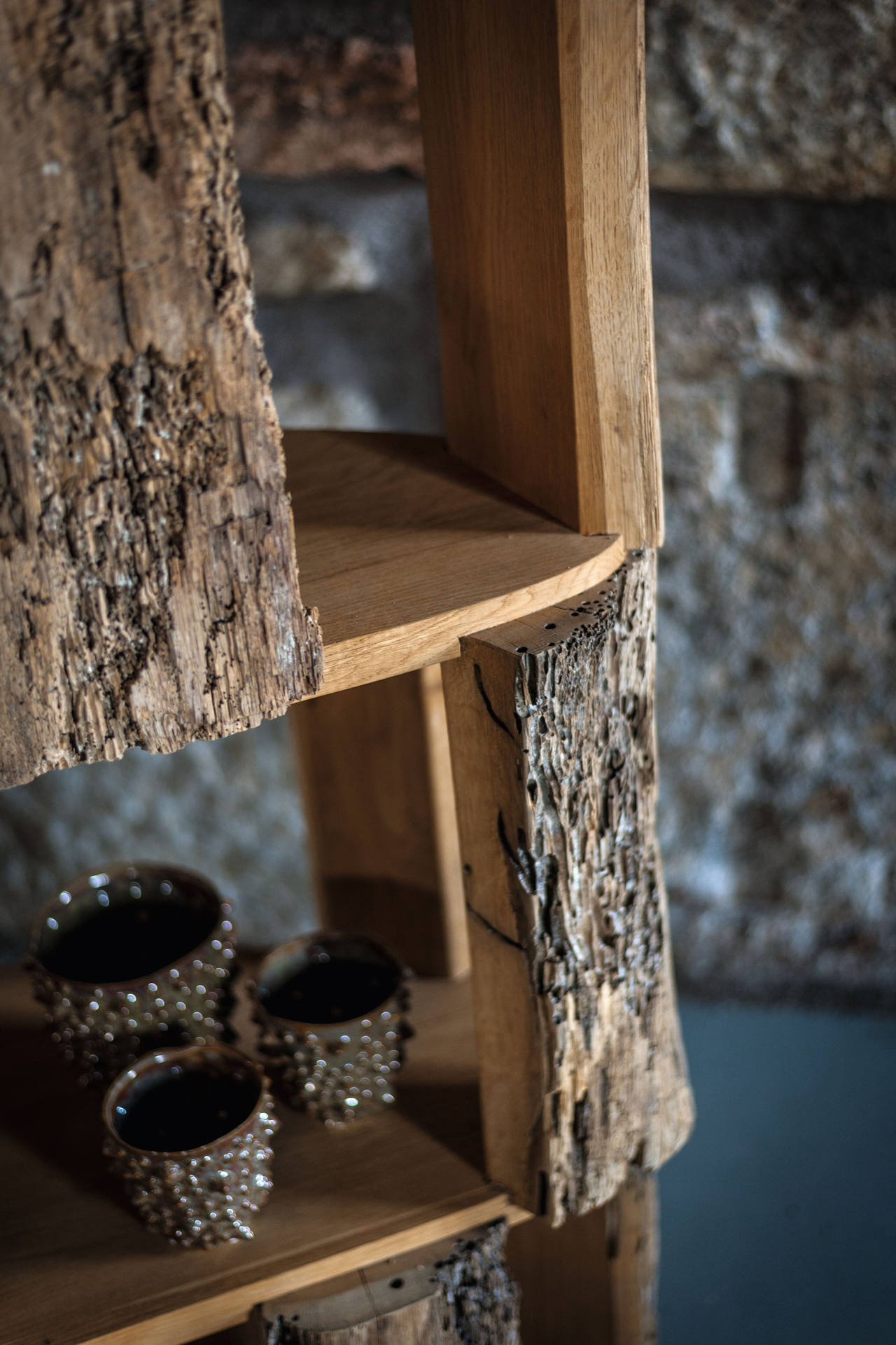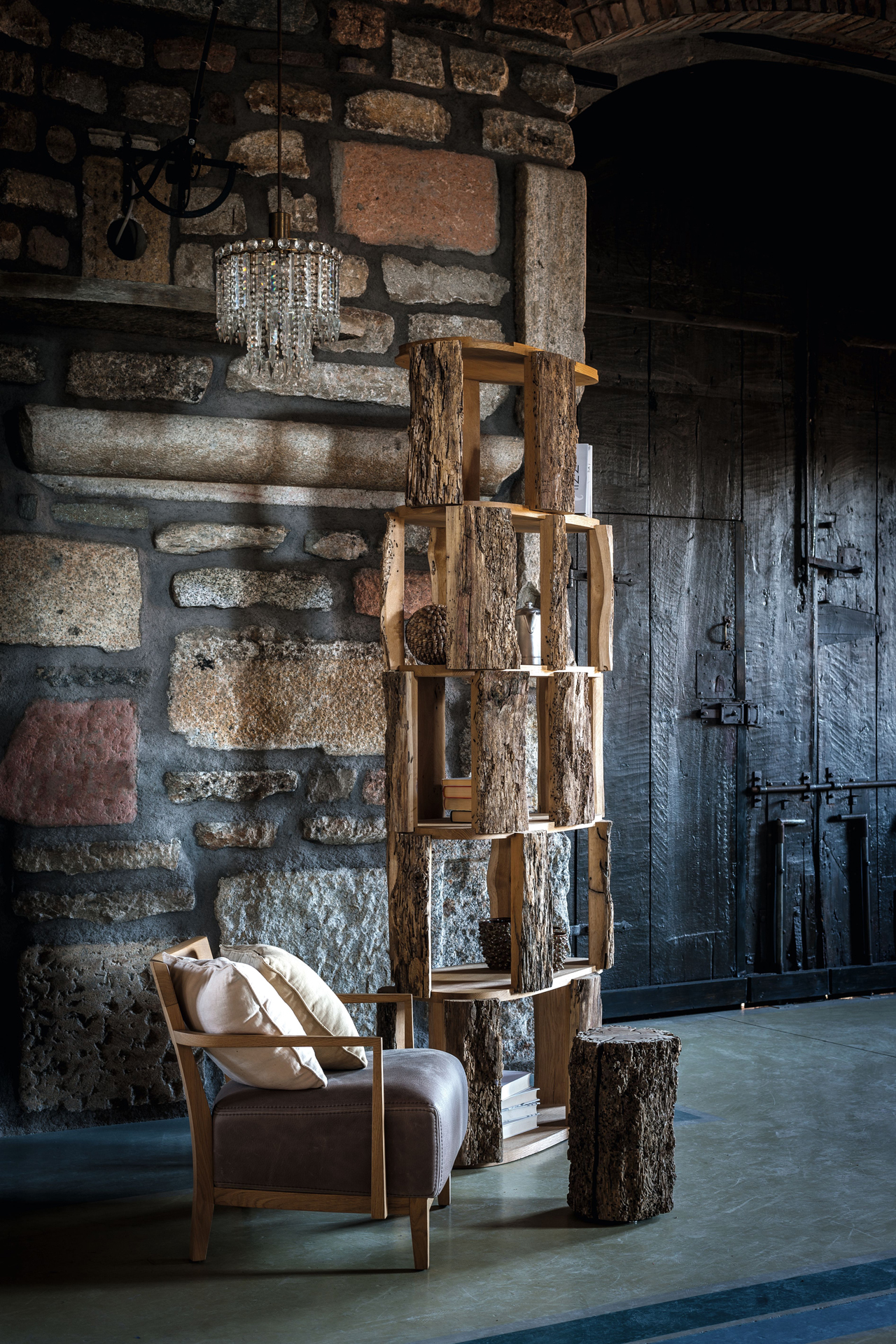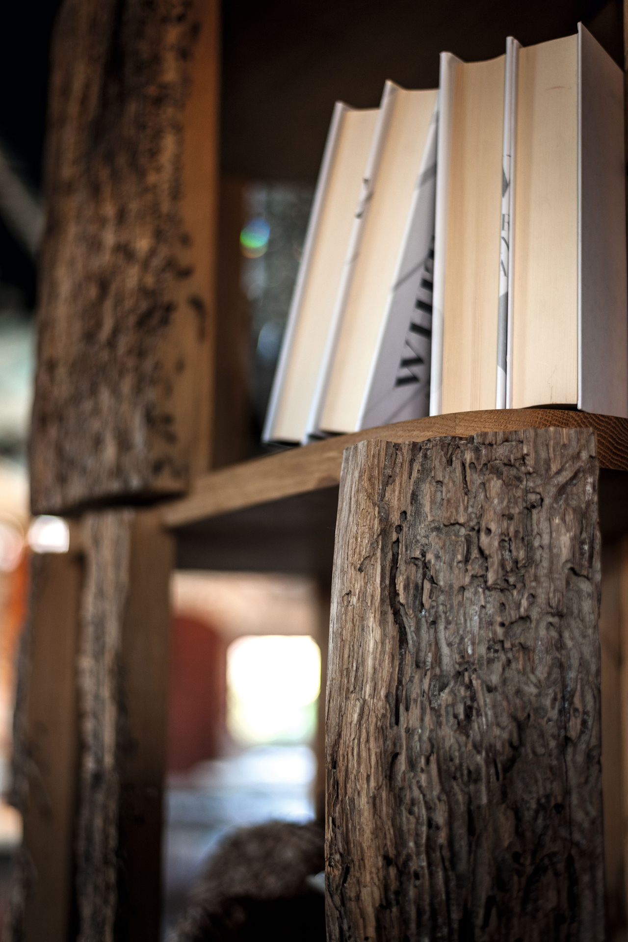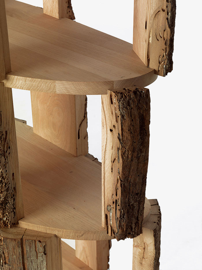 Bücherregal aus Briccola Massivholz; die Regalböden sind aus Eiche. Schlichte Säuleform mit verschiedenen Regalbrettern, um nützliche offene Fächer zu erschaffen. Aussen sind Briccola-Stücke mit belassenen Baumrinden.