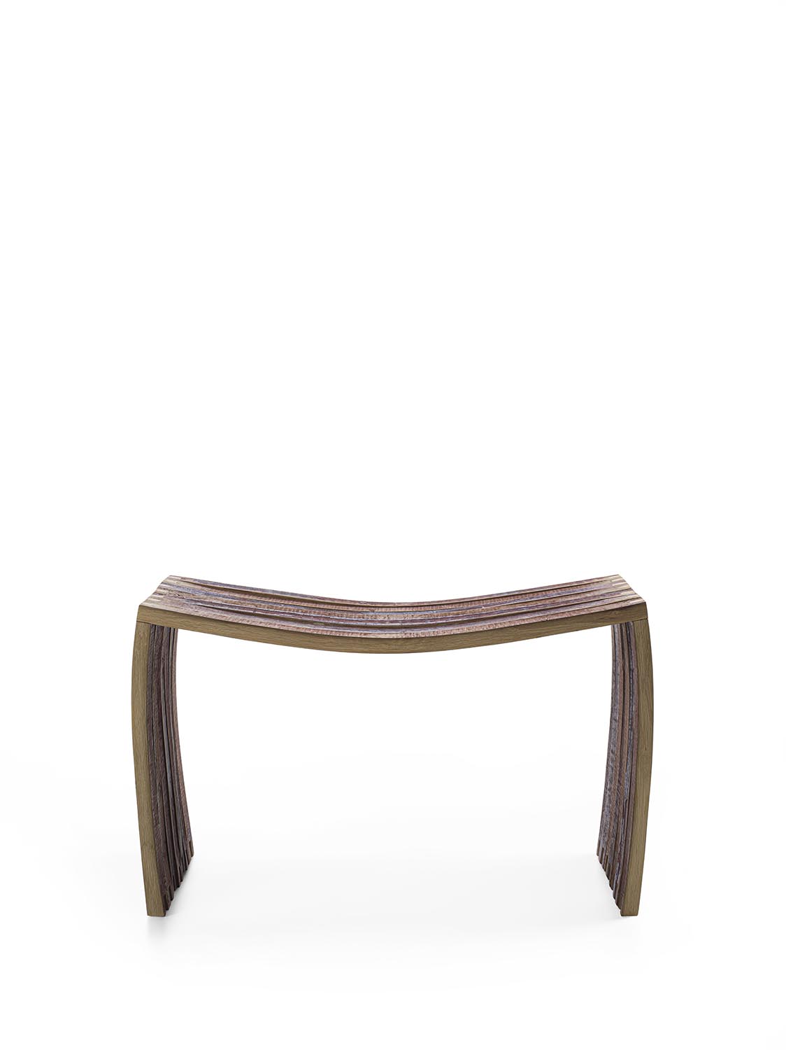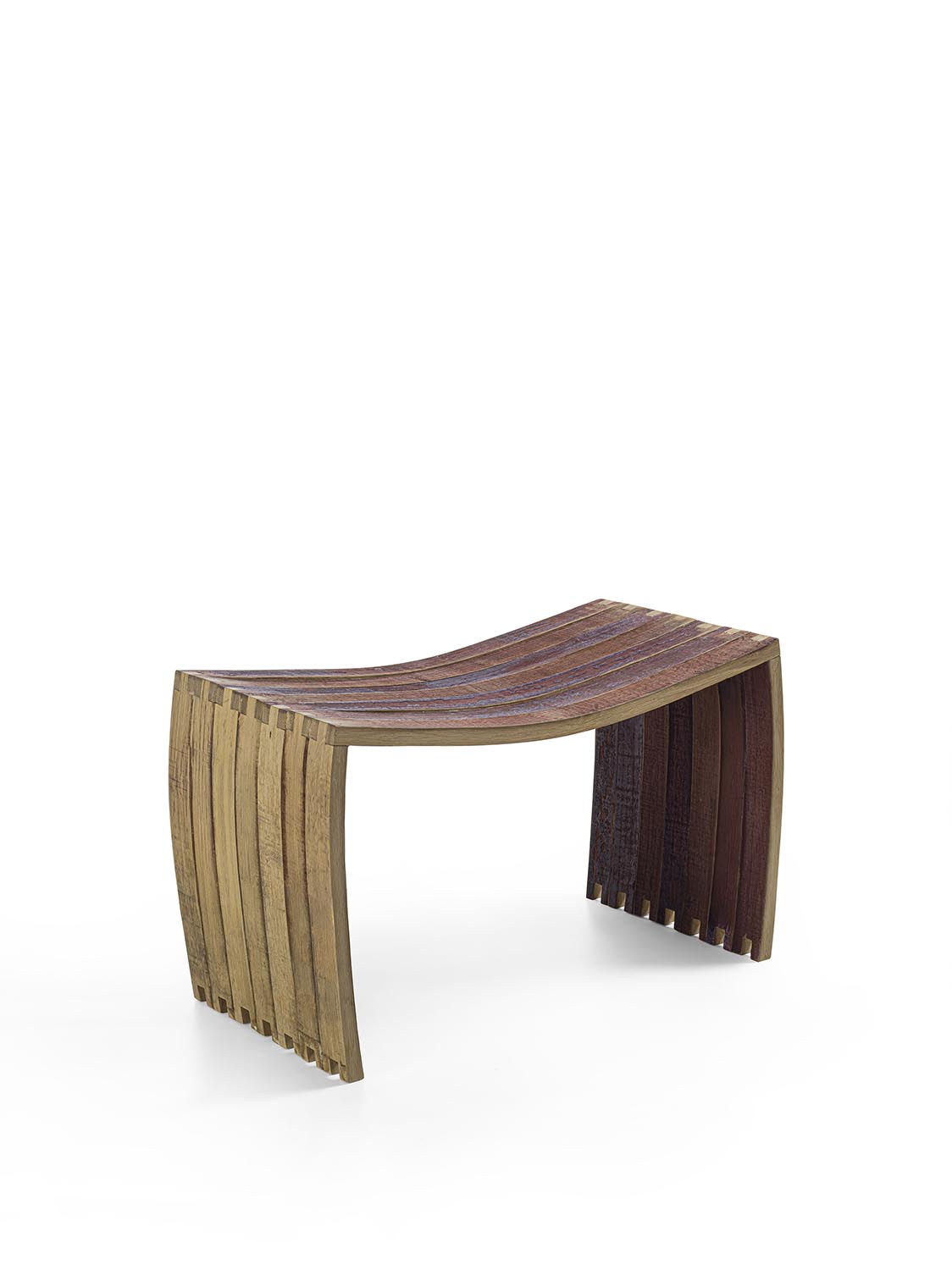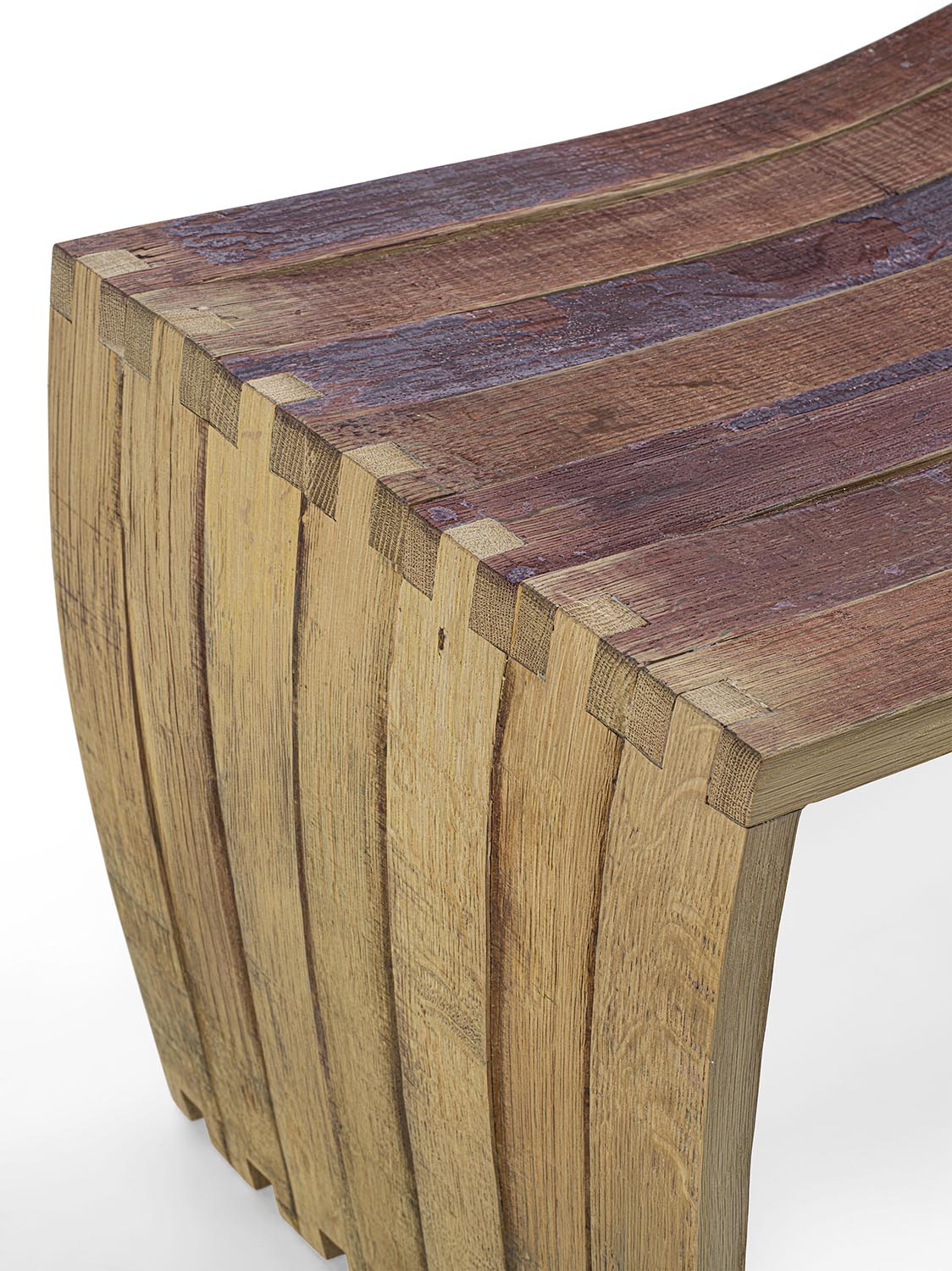 Bank komplett aus Eichenholz aus den Barrique-Fässern gefertigt. Die Sitzfläche ist aus verleimten Dauben, deren geschwungener Querschnitt den Komfort bestimmt. Die vertikalen Teile sind durch Schwalbenschwanzverbindungen gekennzeichnet.