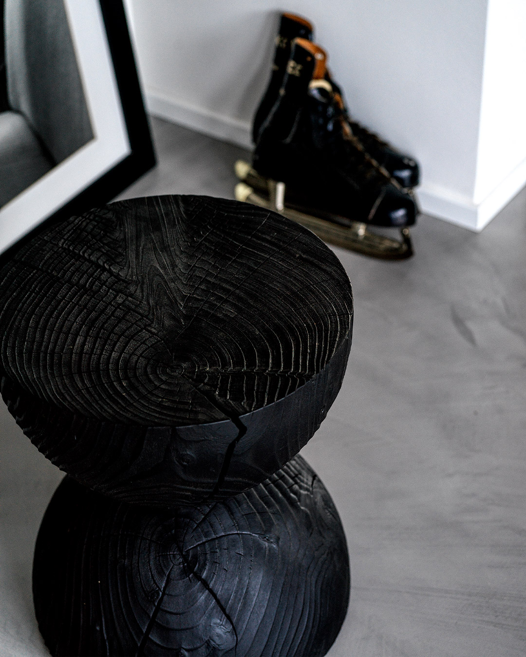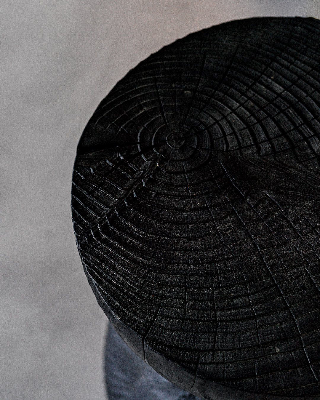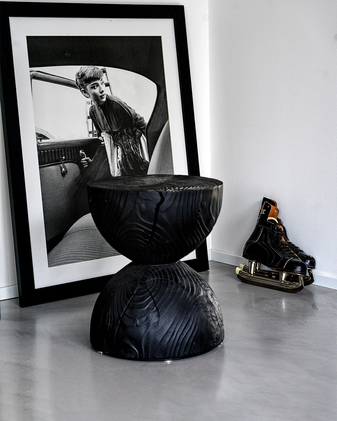 Hocker aus einem einzigen massiven Block duftendes Zedernholzes gewonnen. Bestehend aus zwei Halbkugeln übereinander gestellt in Form einer Sanduhr.