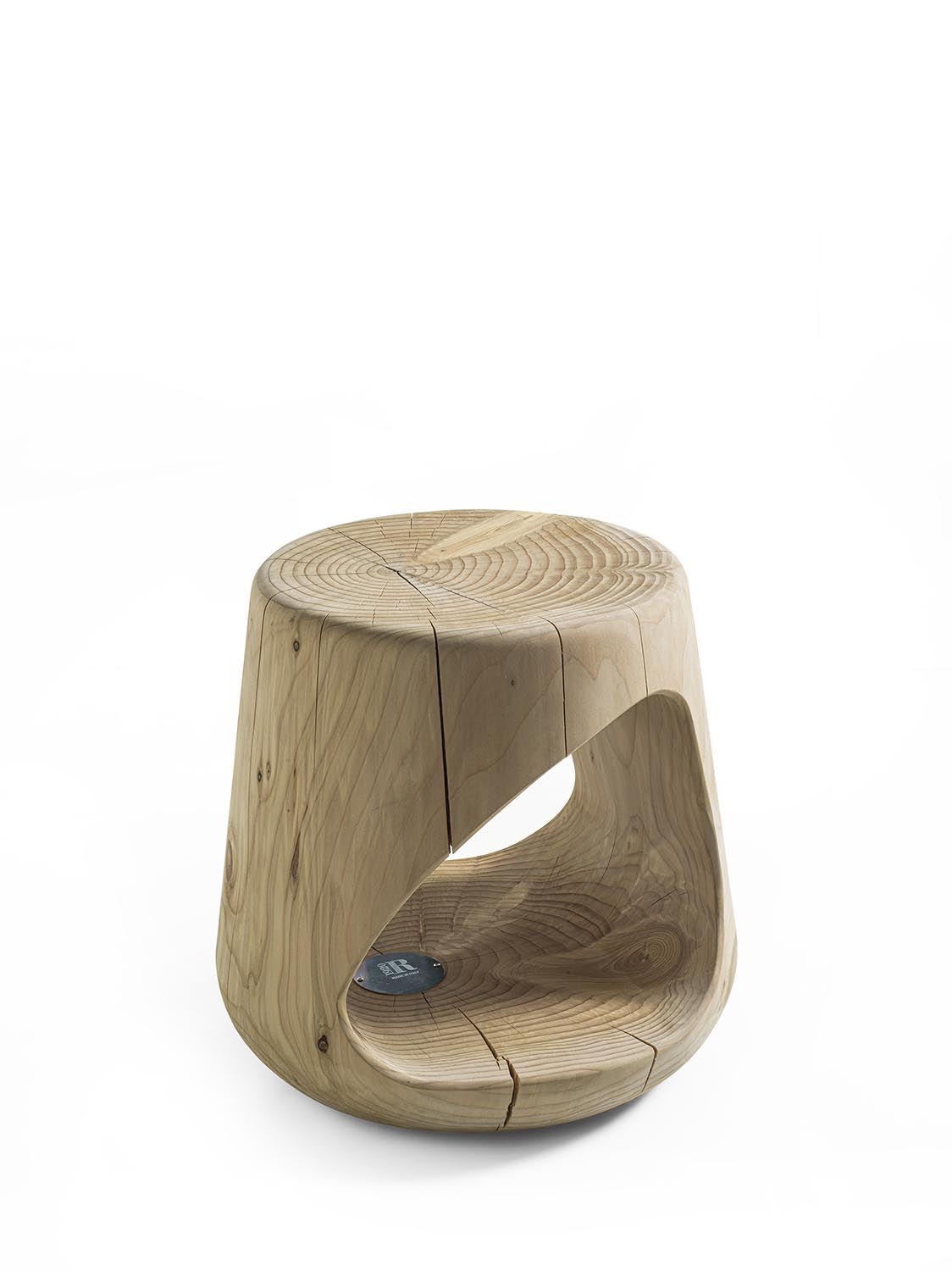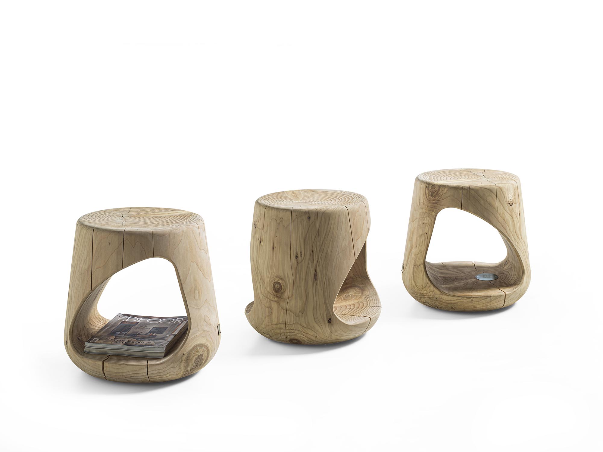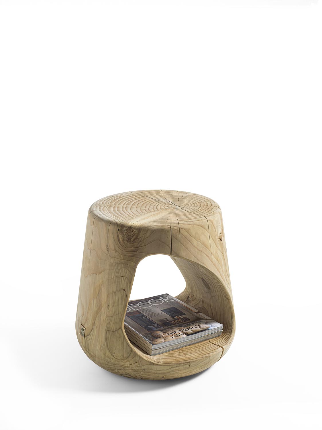 Hocker aus einem einzigen massiven Block duftendes Zedernholz gewonnen. Er zeichnet sich durch seine “weiche” und kurvige Linie aus. Seiner offene Raum ist für Gegenständen, Büchern usw. geeignet. Dank seiner Form kann der Hocker als Salon- oder Nachttisch verwendet werden.