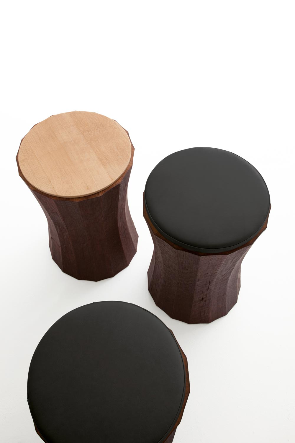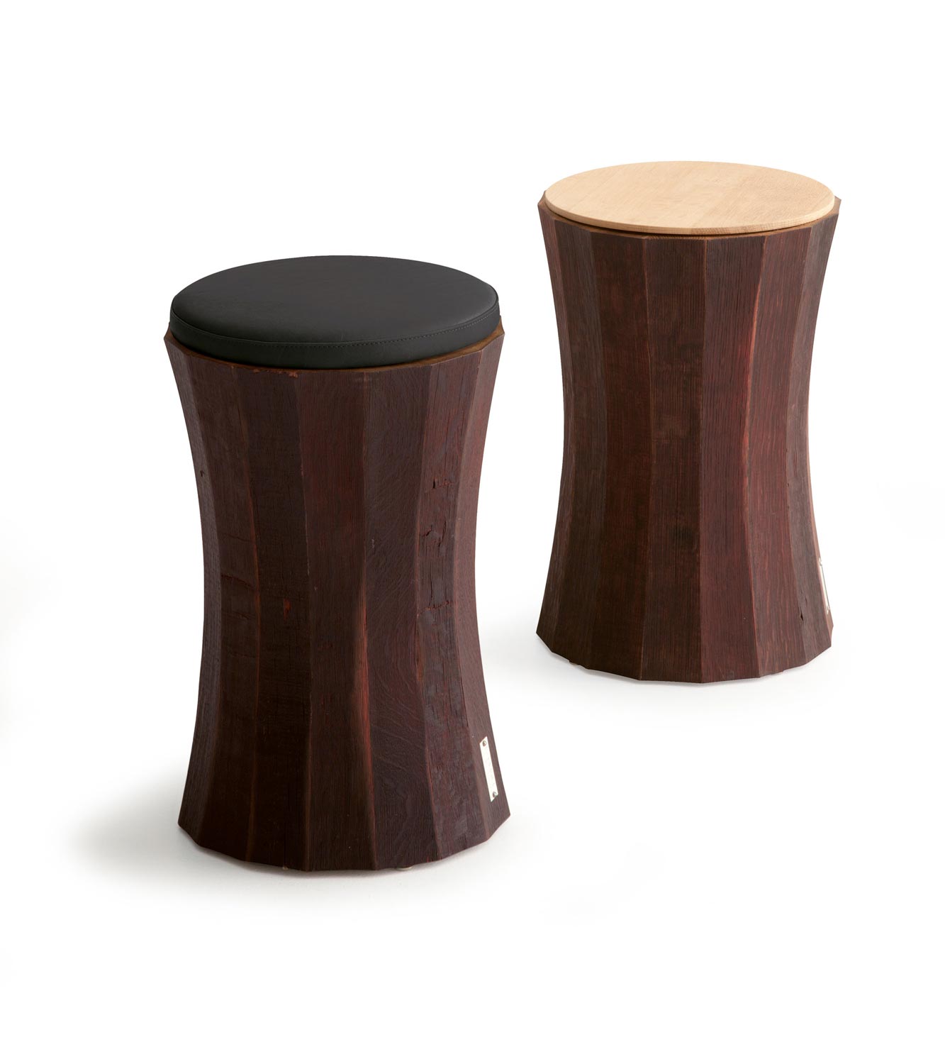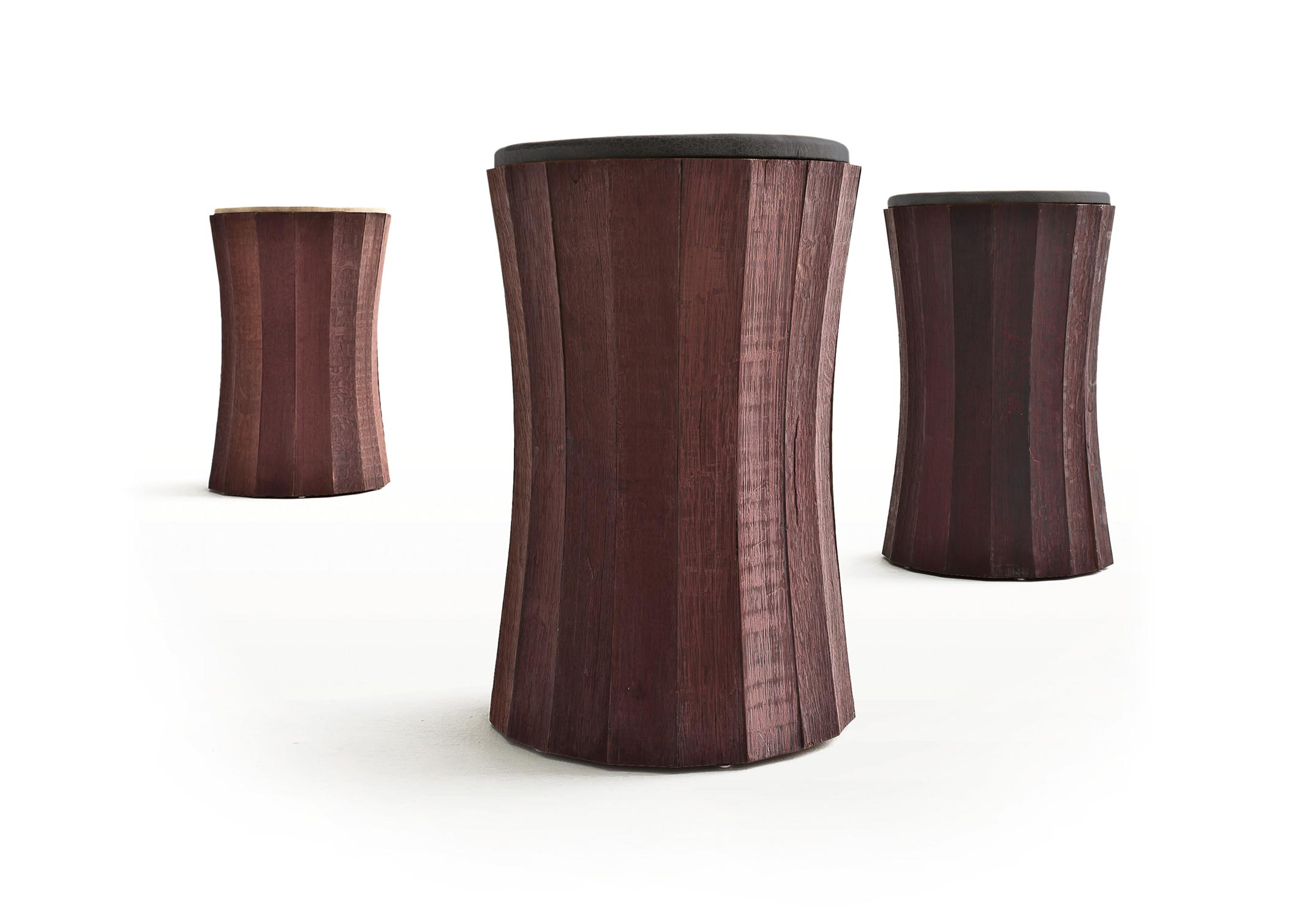 Hocker, dessen Form durch die radiale Anordnung der Dauben, die aus den Barrique-Fässern stammen und durch die typische bordeauxrote Farbe gekennzeichnet ist. Sitz aus Holz oder gepolstert und mit Leder bezogen.