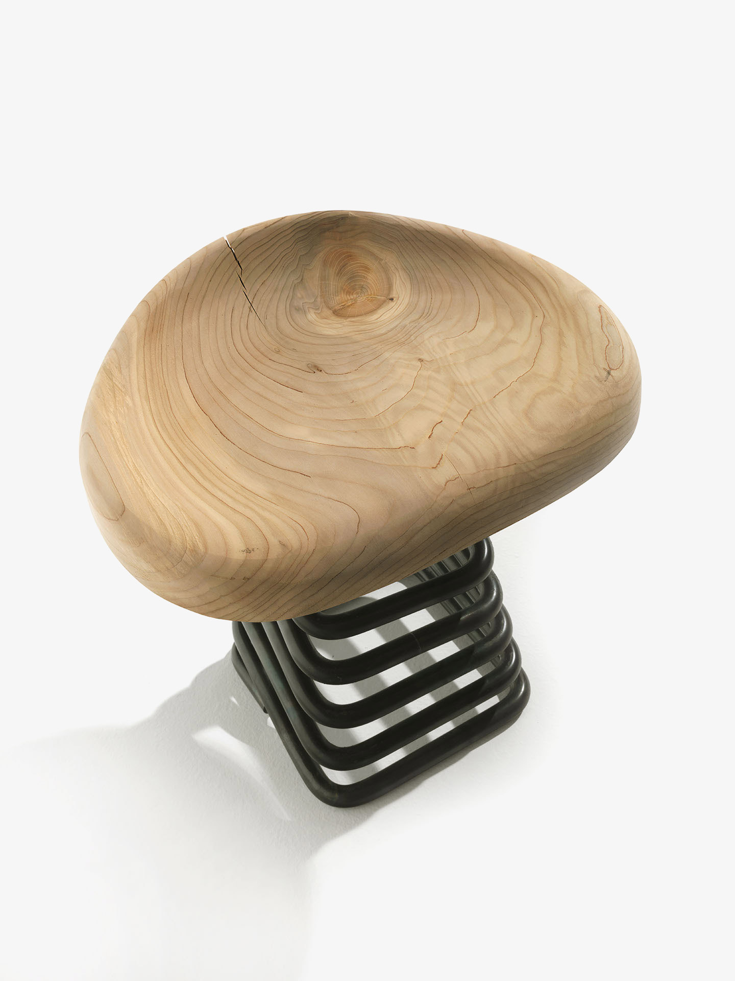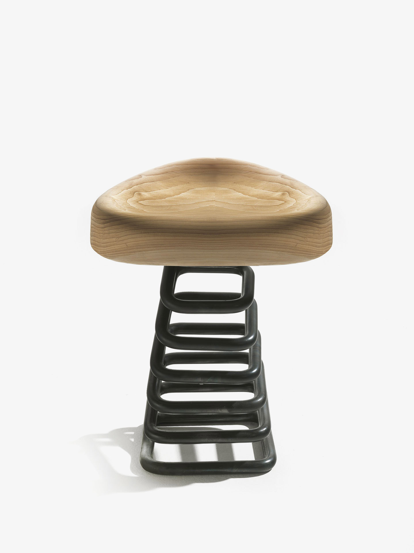 Hocker mit Sitzfläche aus Massivholz auf einer quadratischen Feder befestigt, die Schwingbewegung in den unterschiedlichen Richtungen erlaubt.