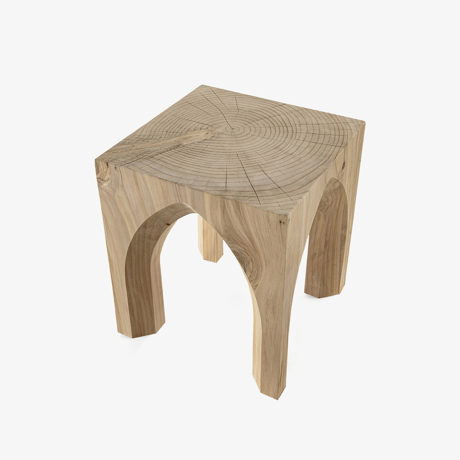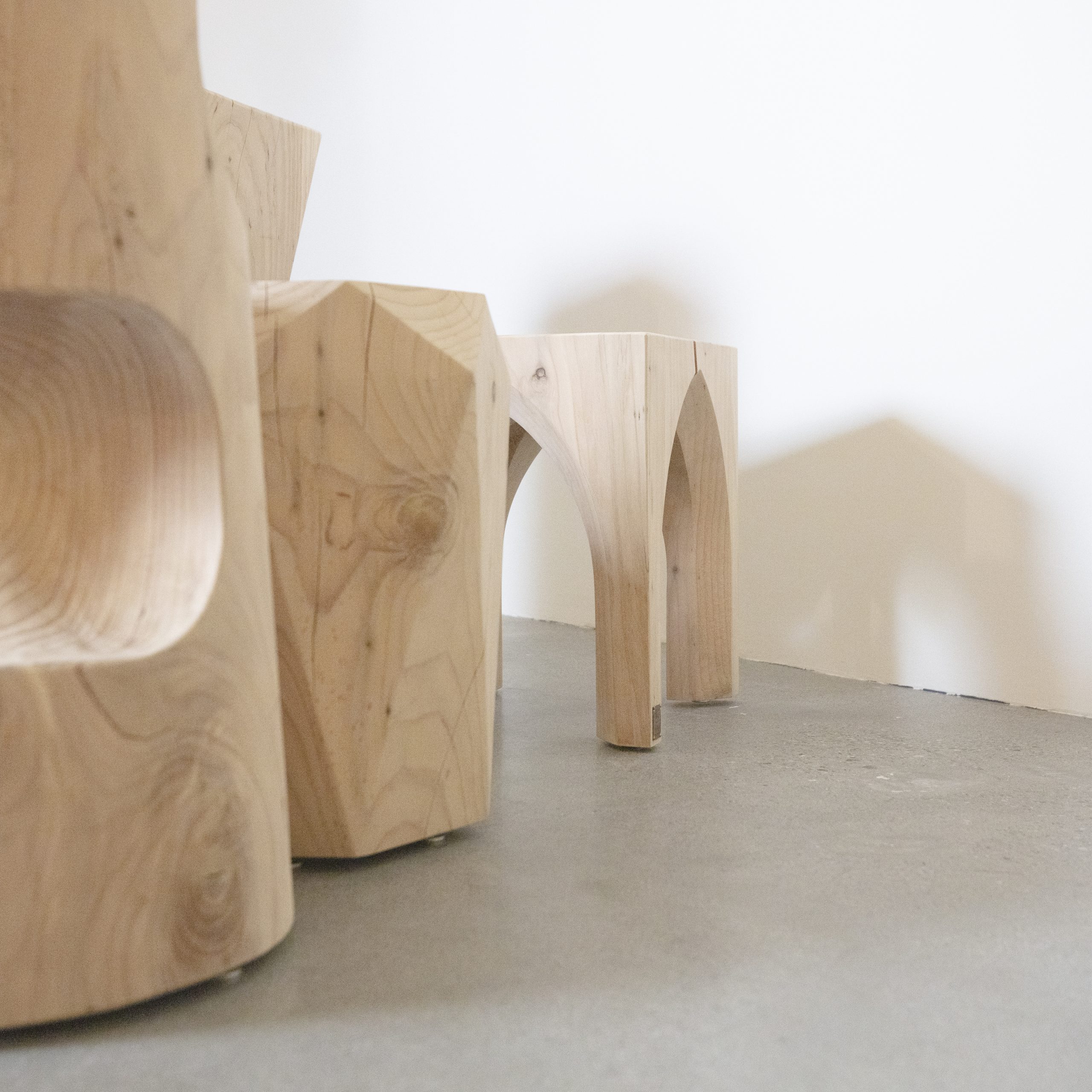 Von der gotischen Architektur inspiriert, dieser Hocker aus einem einzigen massiven Block duftendes Zedernholzes erinnert an die Spitzbogen eines gotischen Doms.