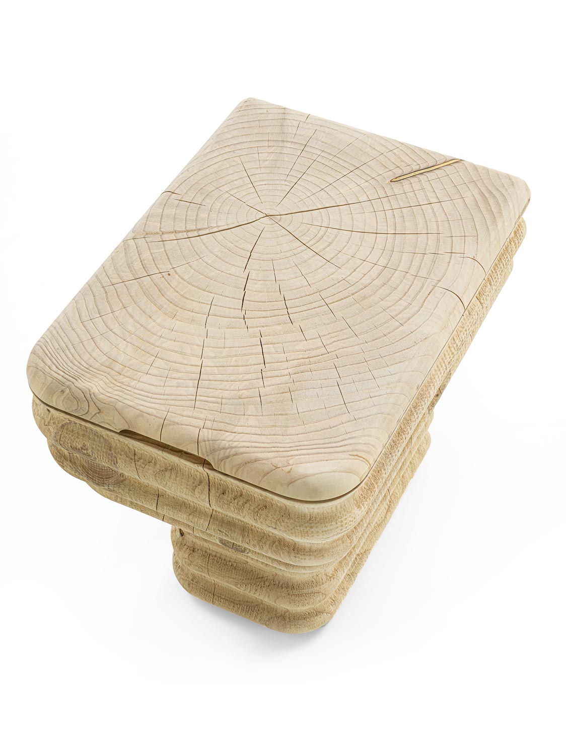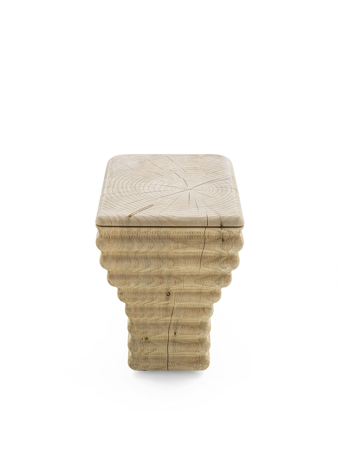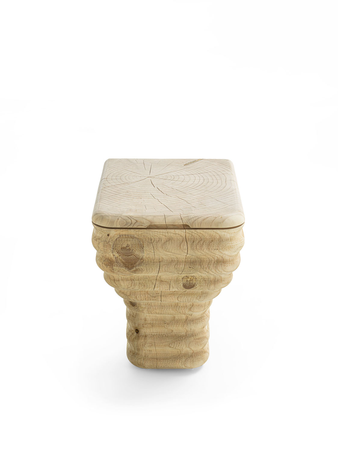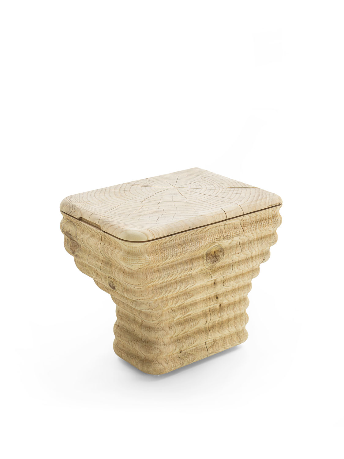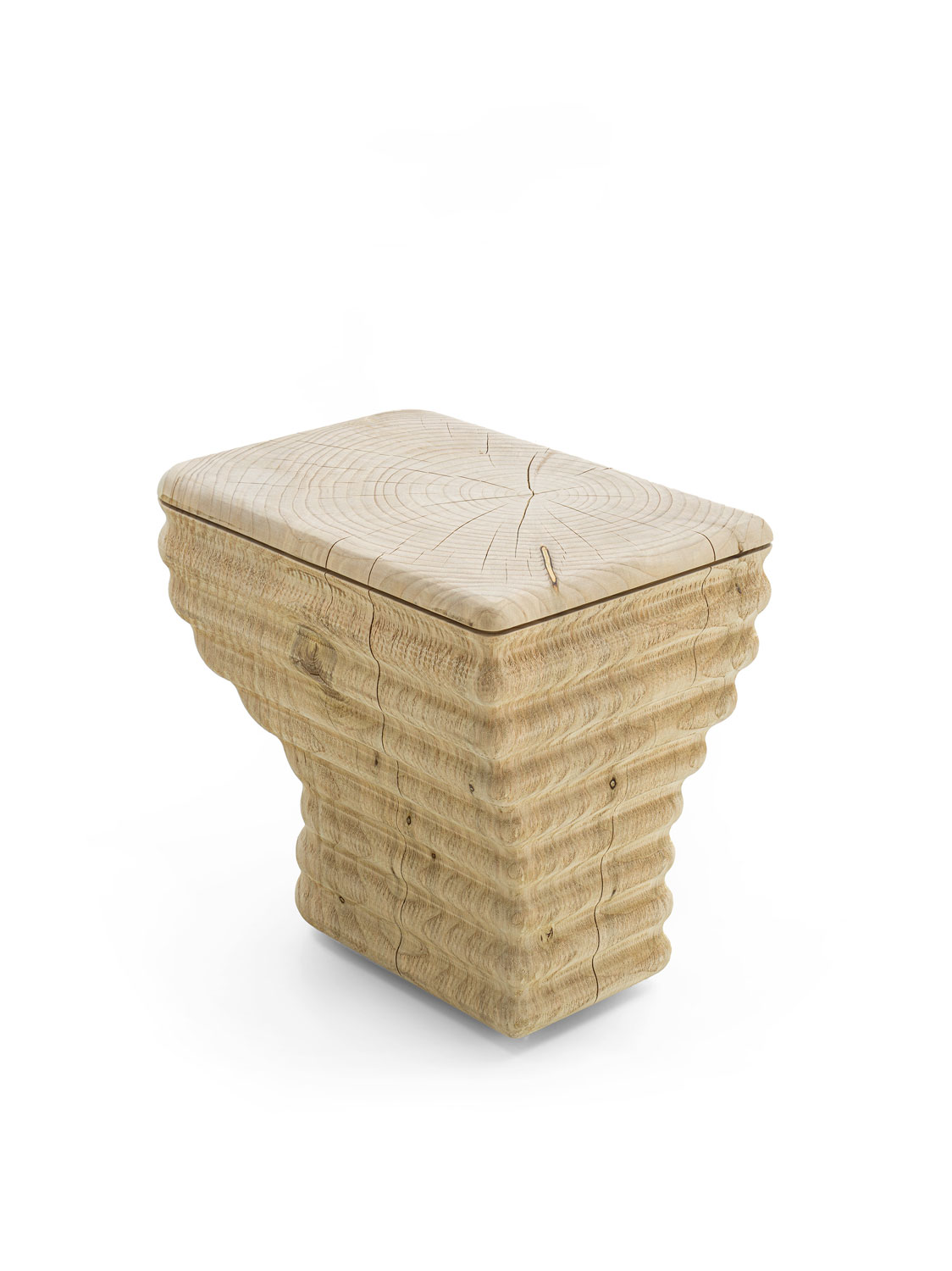 Aus einem einzigen Block massiven, duftenden Zedernholzes gefertigter Sessel in einem originellen Wellendesign. Die Sitzfläche ist glatt, während die Seiten eine raue Oberfläche behalten. Dieser Hocker inspiriert sich an der Form einer Toilettenschüssel in einer innovativen Neuinterpretation: durch die Holzverarbeitung entstehen weiche Wellen, ein Effekt, der mit der Keramik, die gewöhnlich für Toilettenschüsseln verwendet werden, nicht erreicht werden kann.