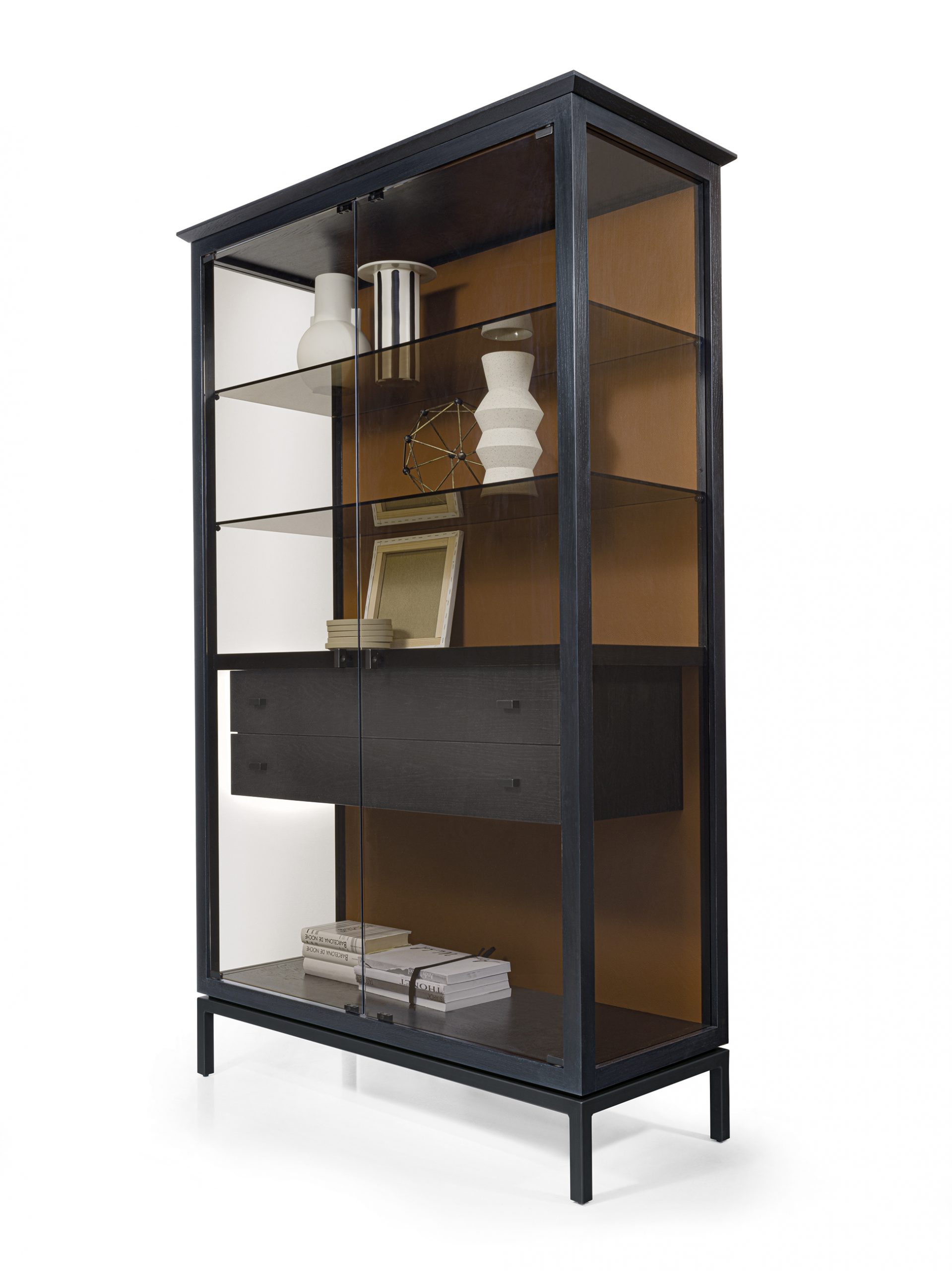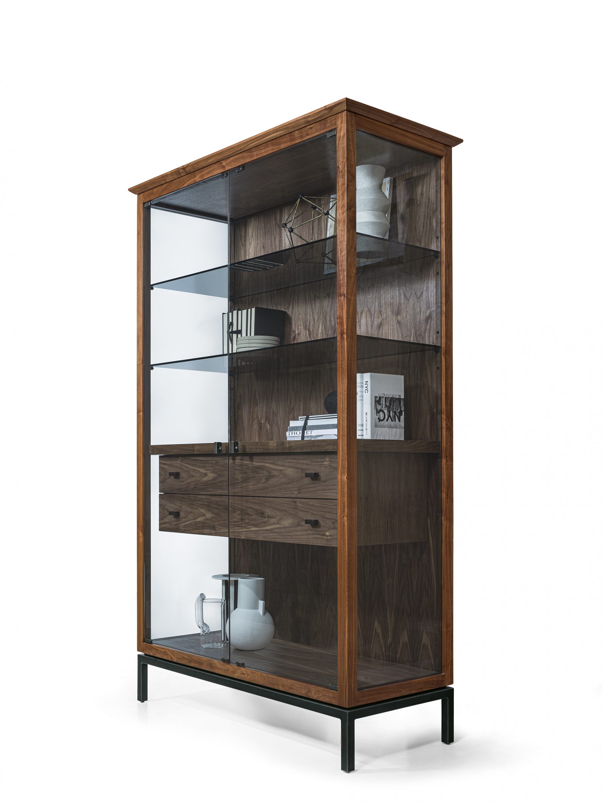 Vitrine mit Struktur bestehend aus Massivholz, Türen, Seiten und Einlegeböden aus Glas. Fester Mittelboden aus Holz. Mit 2 oder 4 Türen, mit inneren Schubladen und Außenschubladen erhältlich, und Untergestell aus Eisen. Innovatives LED-System durch Spotlights mit unabhängiger Einschaltung und kabellosem Laden.