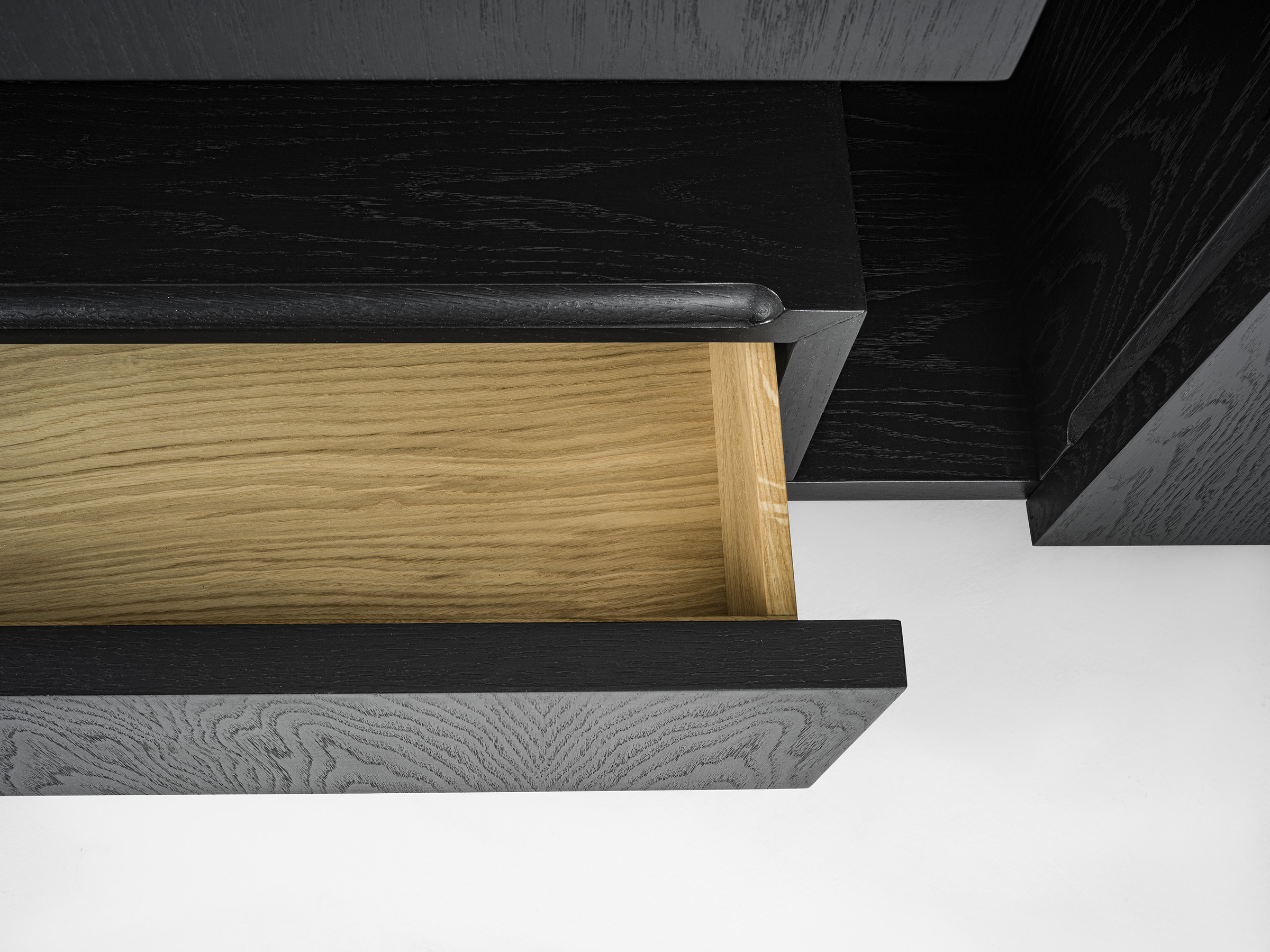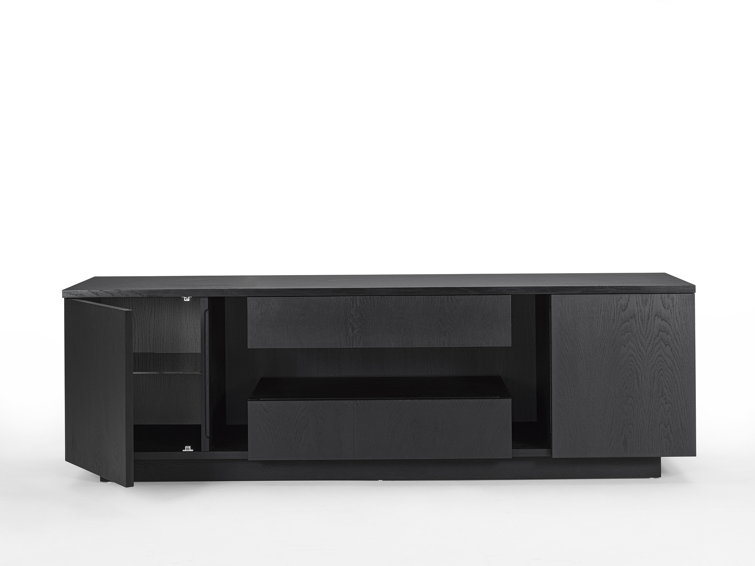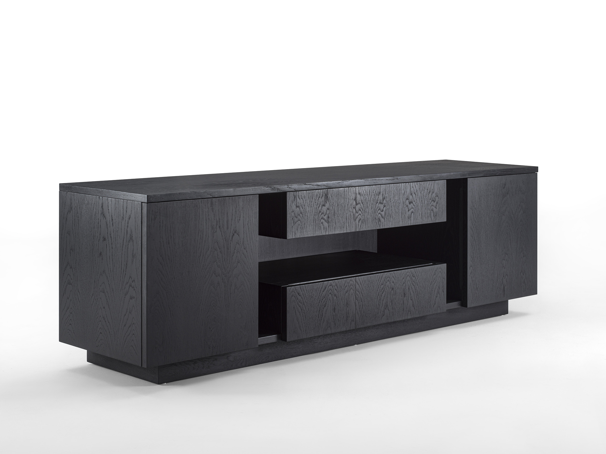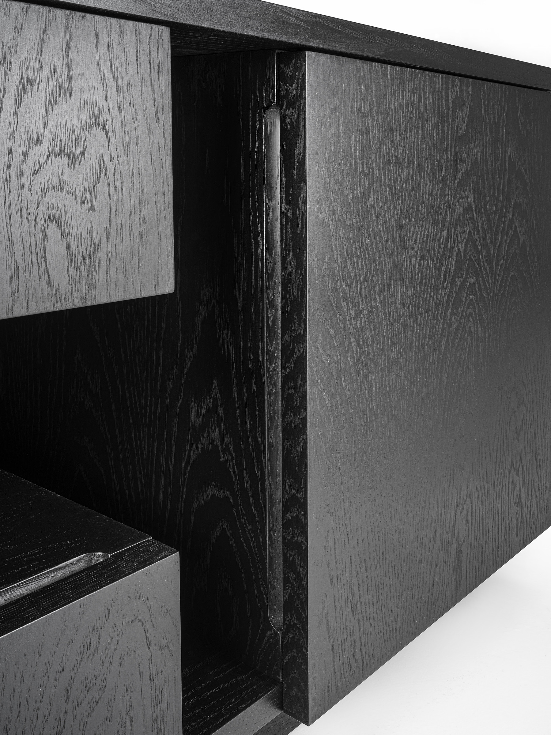 Sideboard aus Massivholz und Tischlerplatte, mit Türen und Schubladen, die mit Schwalbenschwanzverbindungen zusammengefügt sind, mit zentralem, offenem Fach. Sideboard aus Massivholz und Tischlerplatte, mit Türen und Schubladen, die mit Schwalbenschwanzverbindungen zusammengefügt sind, mit zentralem, offenem Fach.
