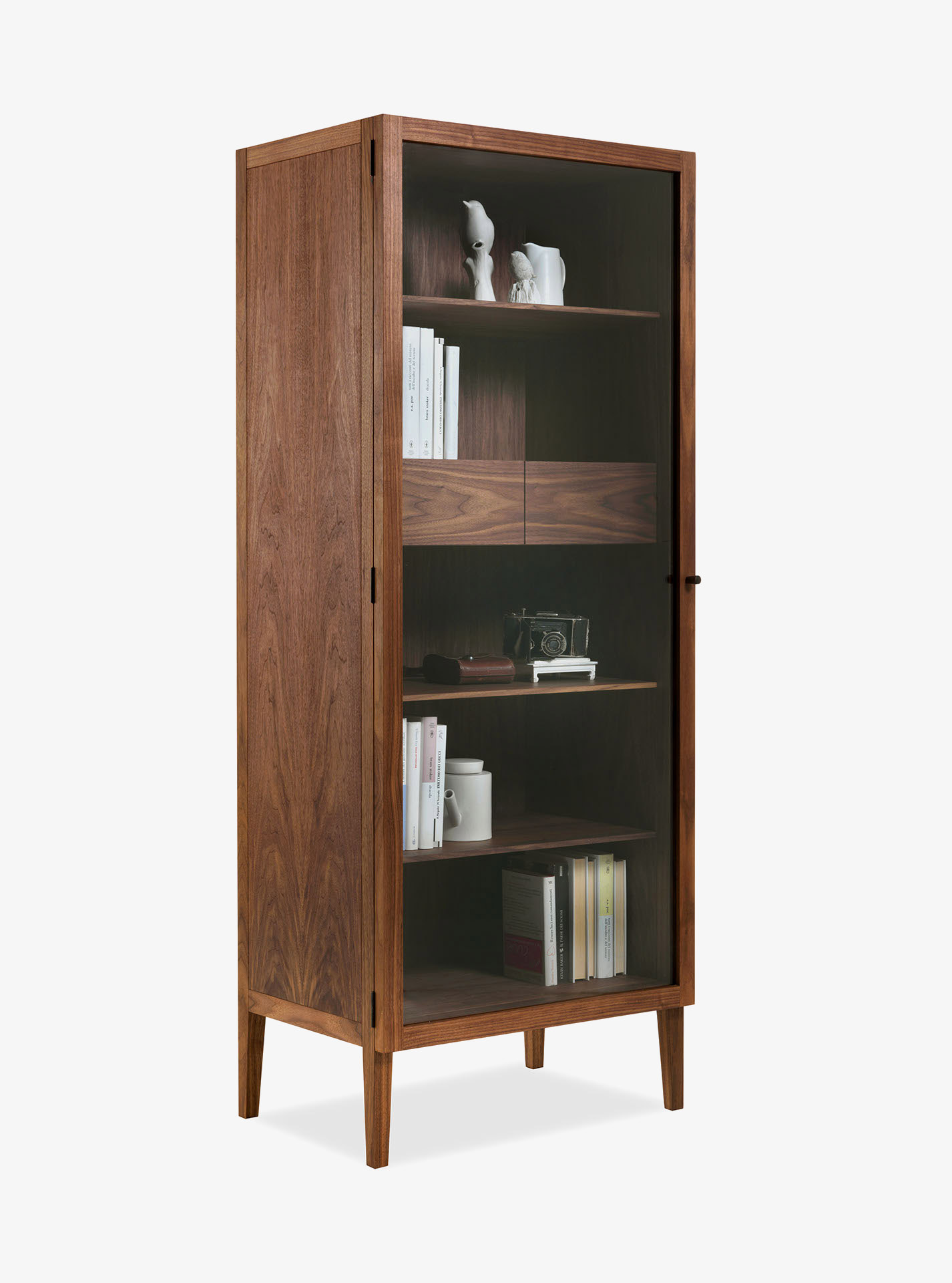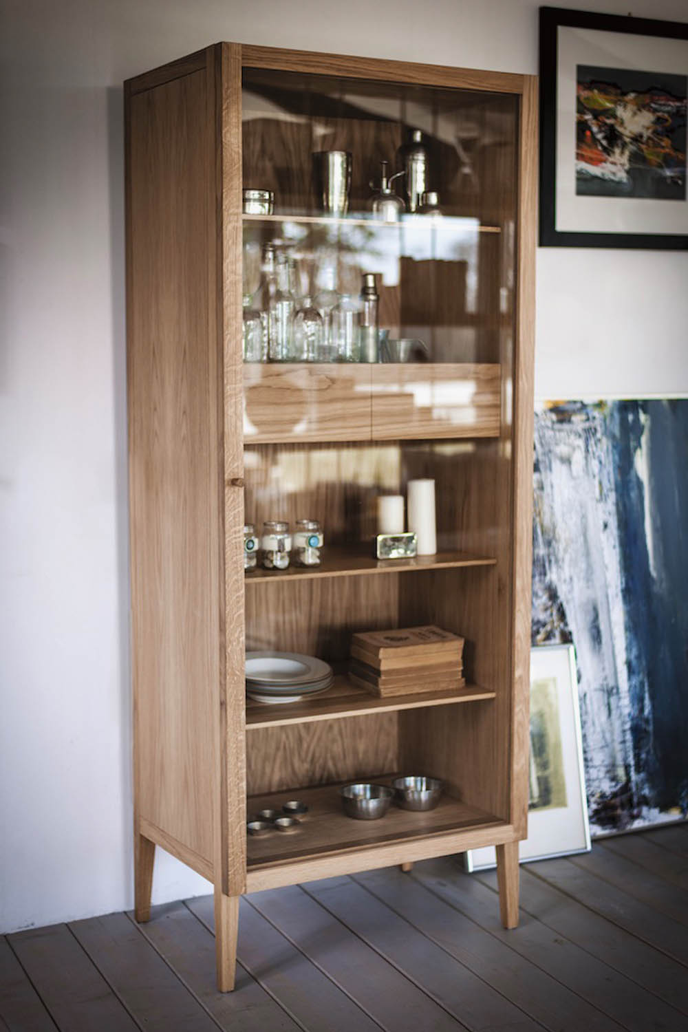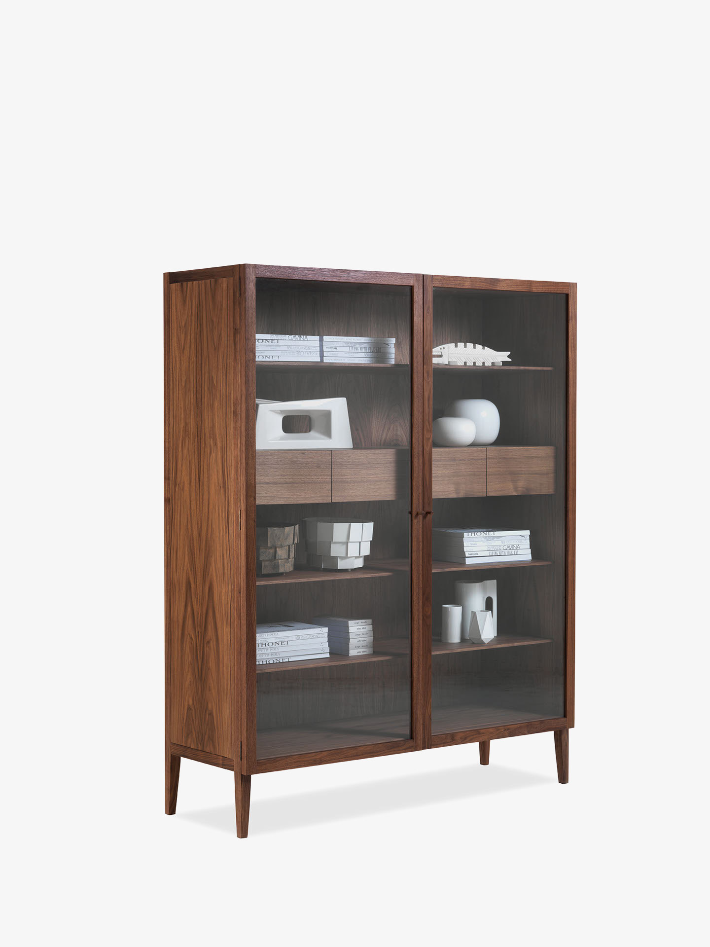 Vitrine mit Korpus aus Massiv- und Furnierschichtholz und Klarglastüren mit Holzknöpfen, verfügt über Innenschubladen mit Schwalbenschwanzverbindungen und steht auf dünnen Holzfüßchen. In zwei Versionen verfügbar: mit einer Tür oder mit zwei Türen.