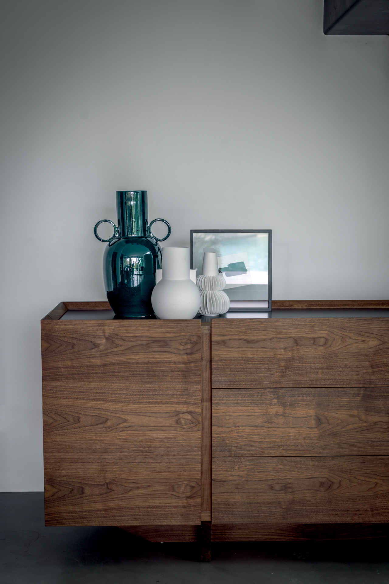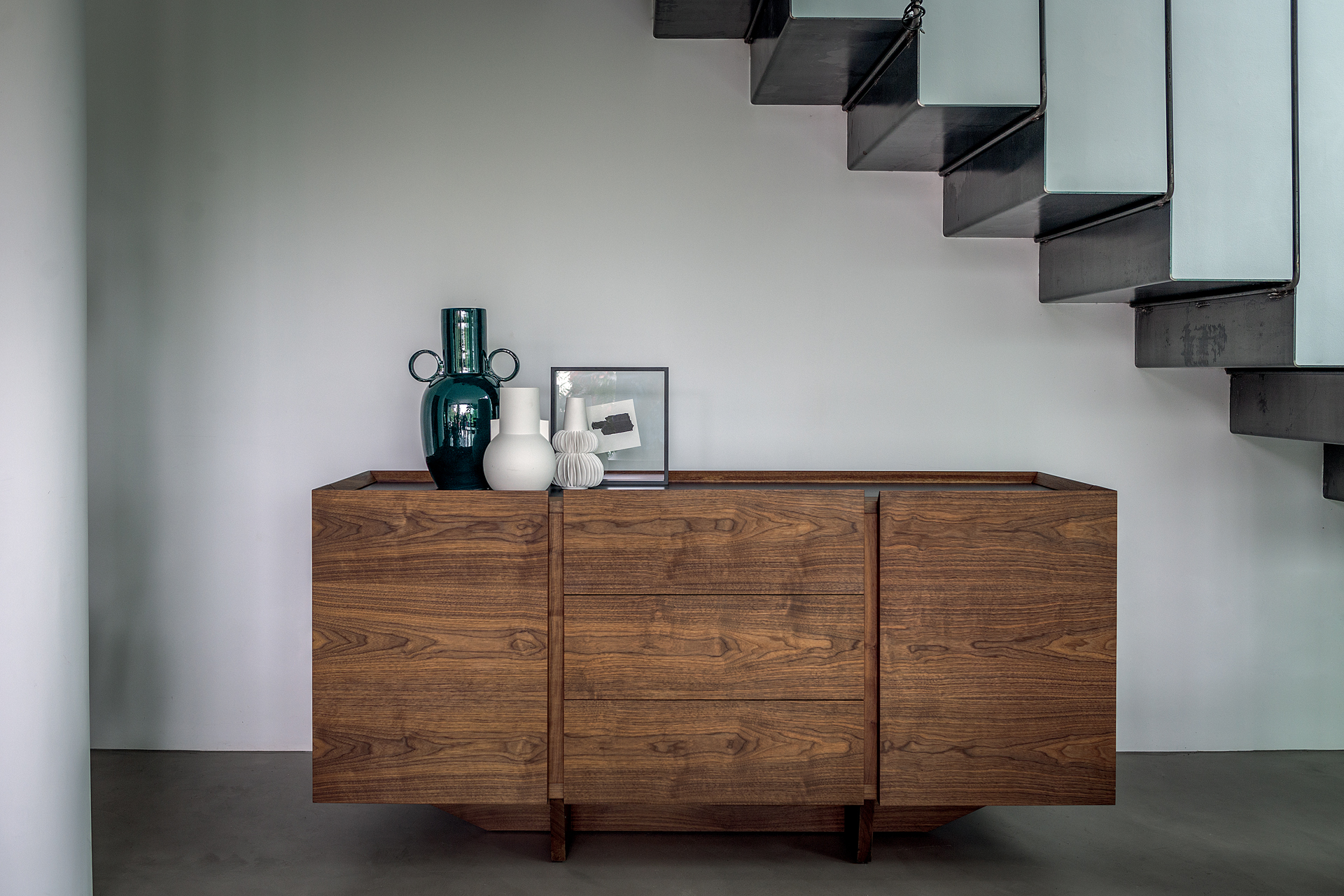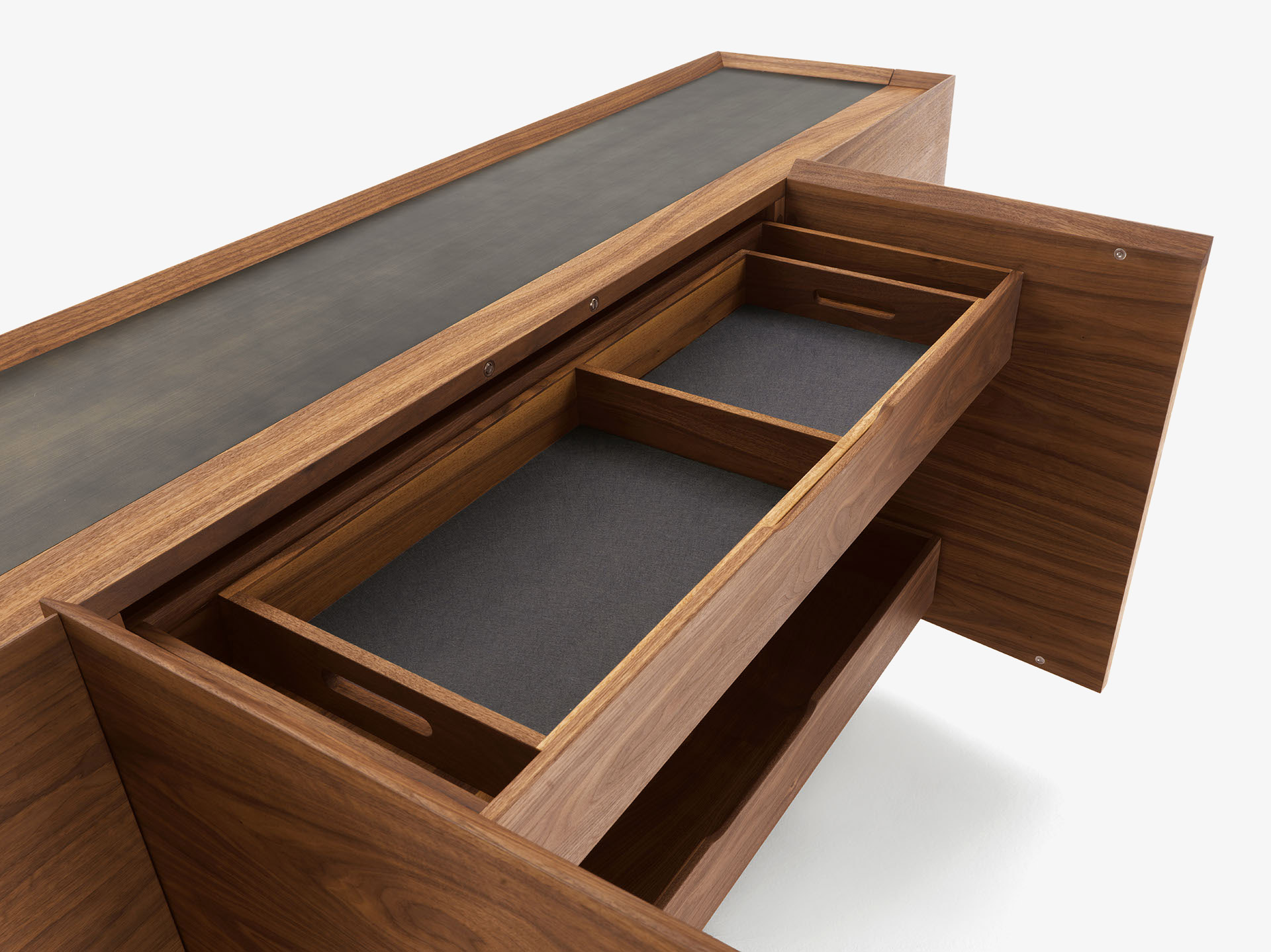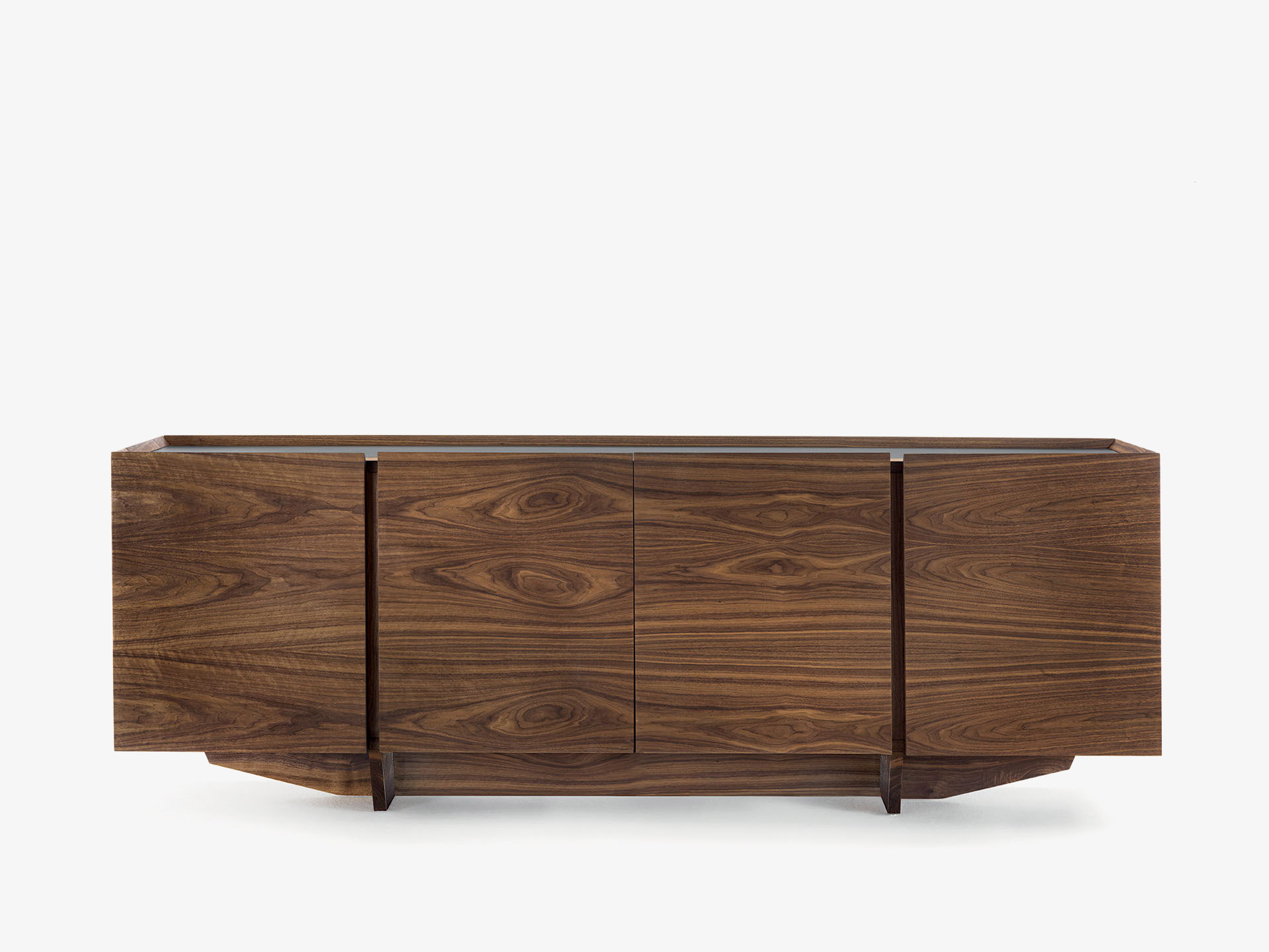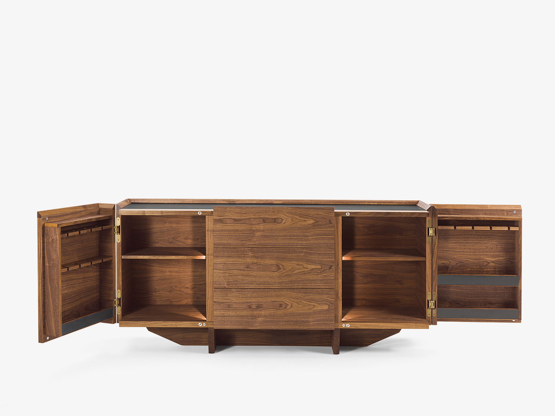 Mehrzwecksideboard aus Furnierschichtholz, optional mit Deko aus Metall oder Kernleder an der Abdeckplatte sowie an den inneren Regalen der Türen erhältlich. Die zwei seitlichen Türen sind an der Innenseite mit Regalen bzw. mit Weinglas Hängeleisten bestückt und haben einen Öffnungswinkel von 180 Grad. Bei der Version in der Länge von 247 cm befinden sich drei Auszüge hinter den zwei Mitteltüren. Die zwei seitlichen Fächer sind mittels eingelassener LED-Lichtleisten beleuchtet und dank eines Sensors geht das Licht beim Öffnen der Türen automatisch an.