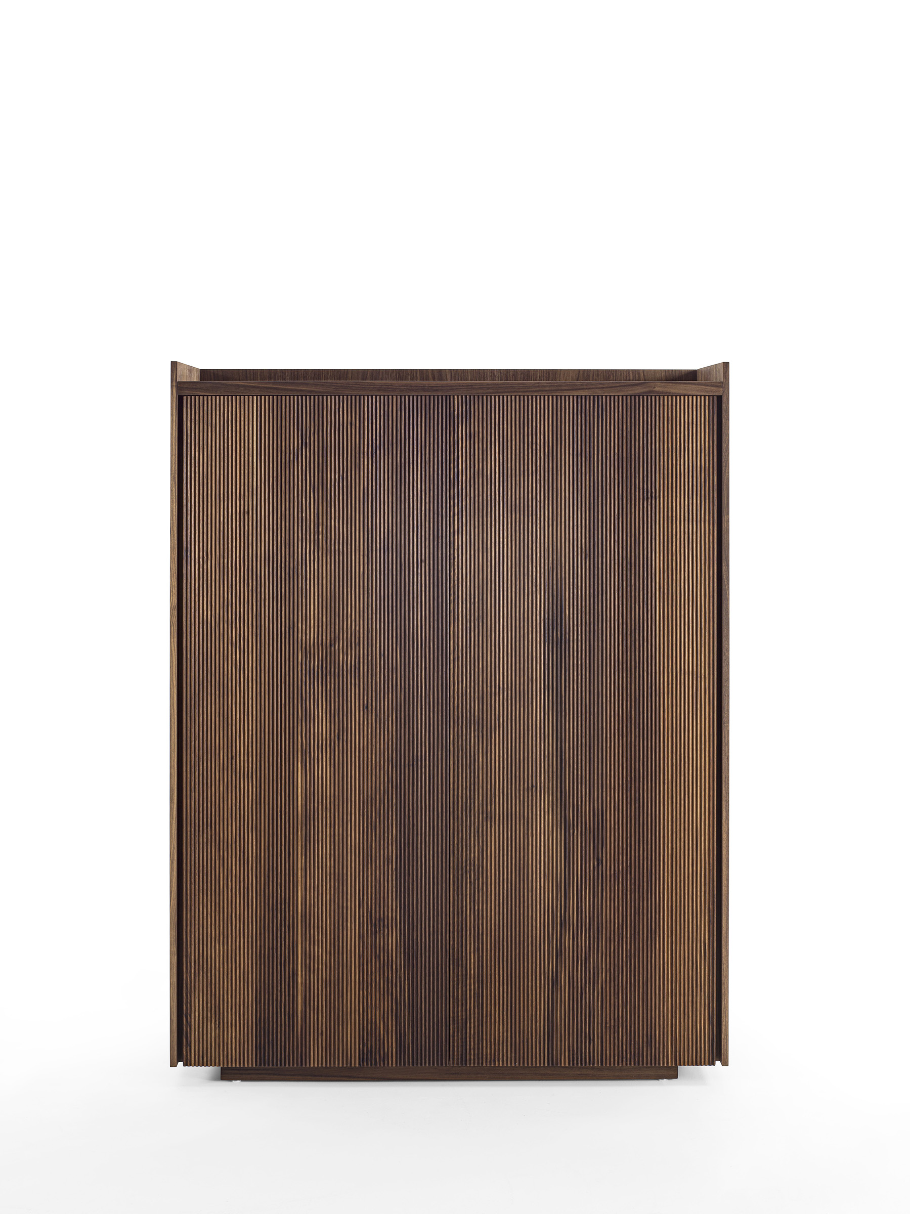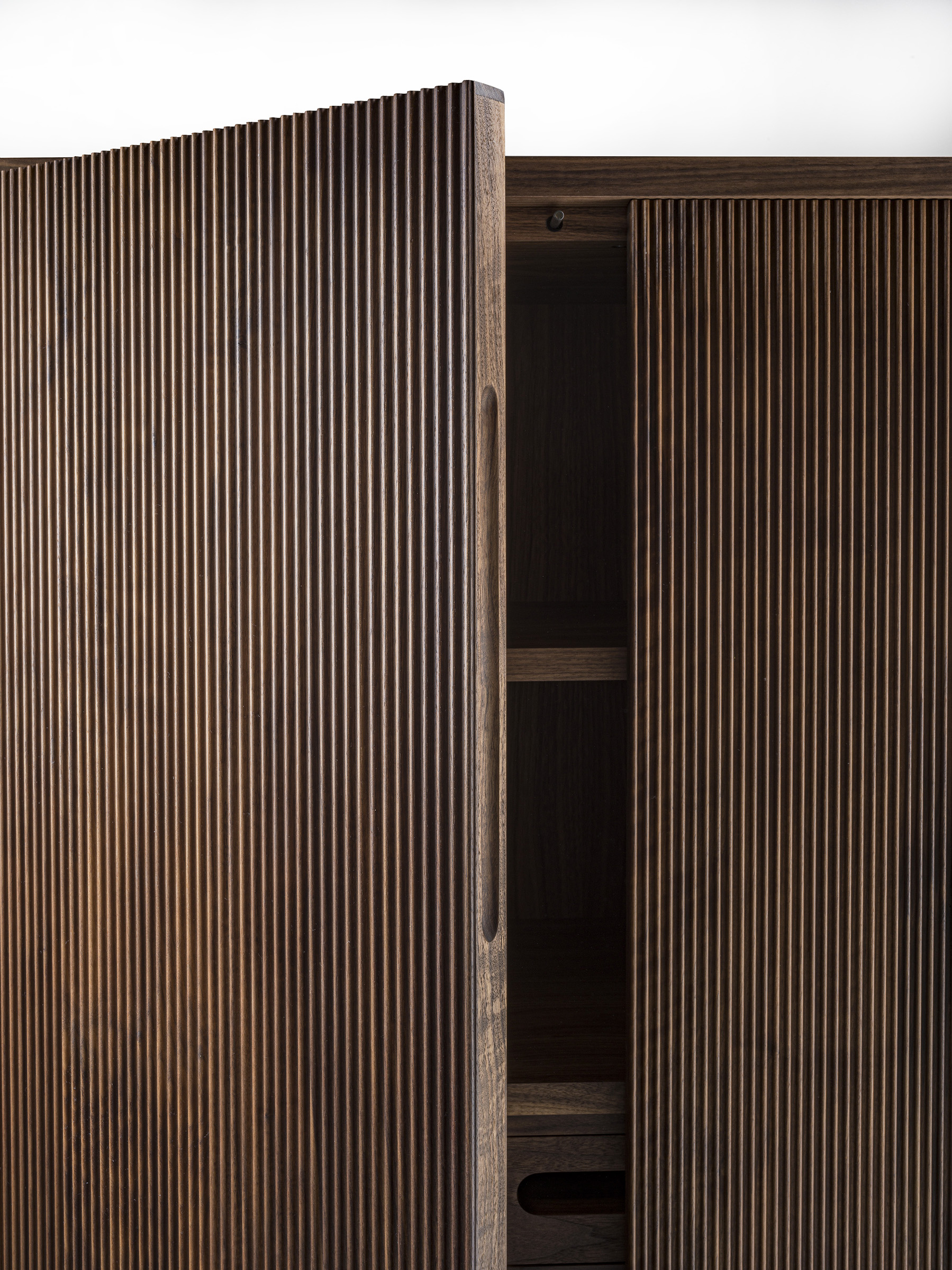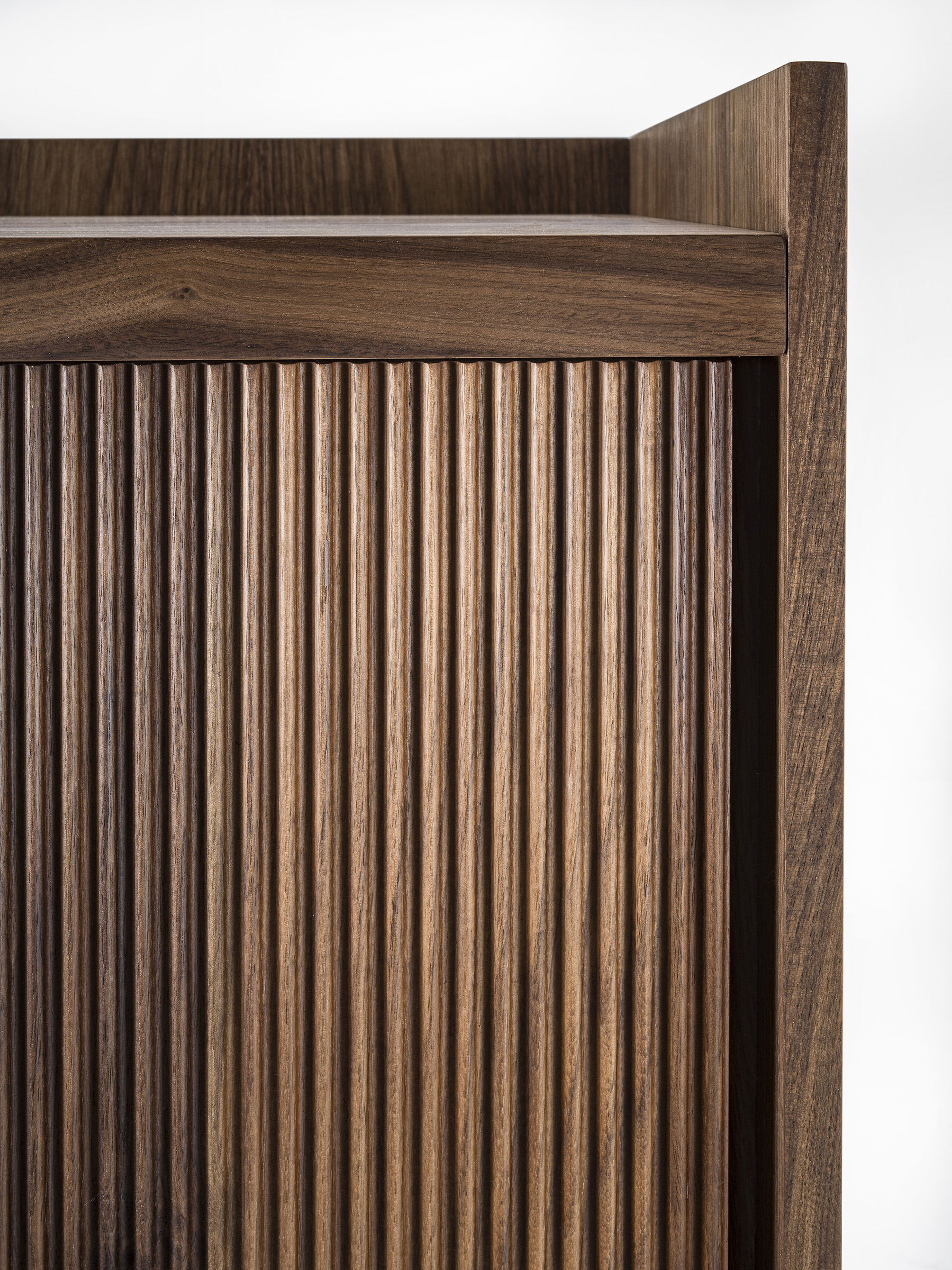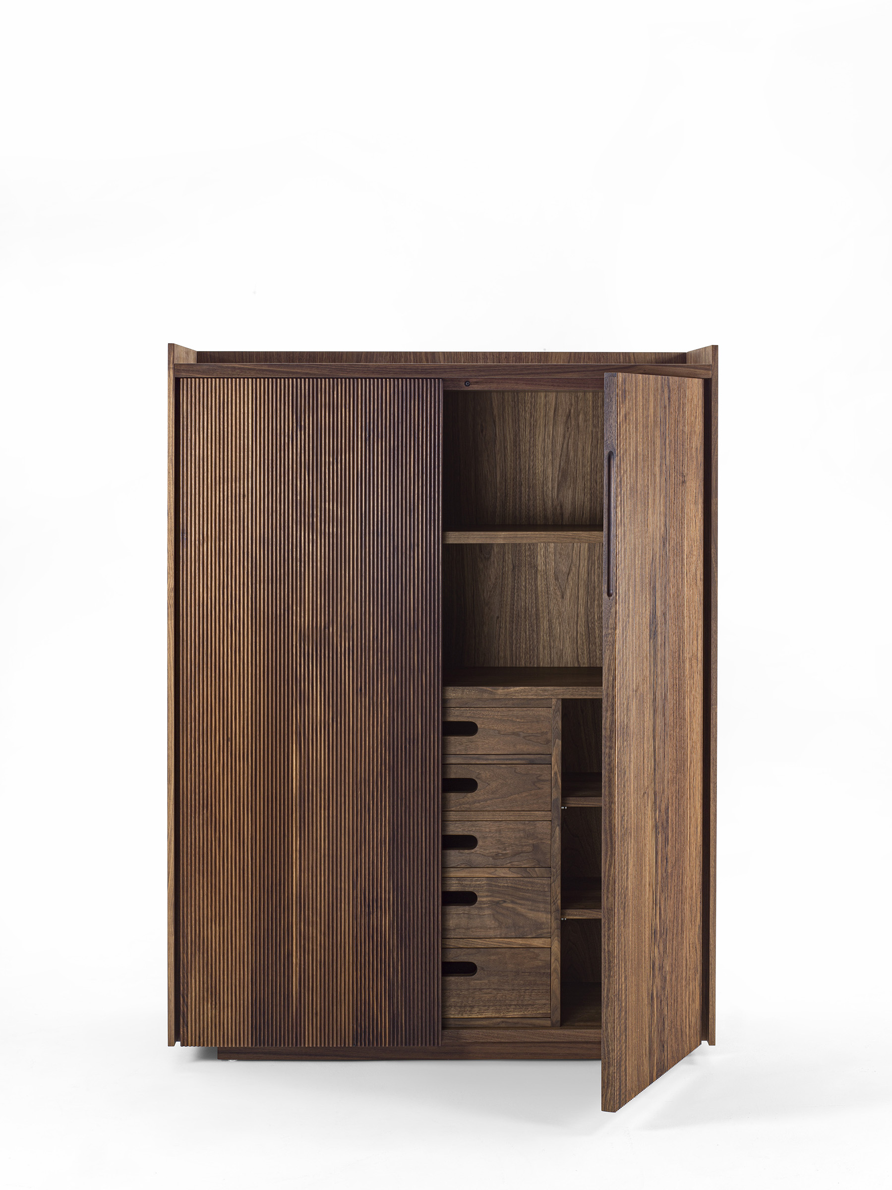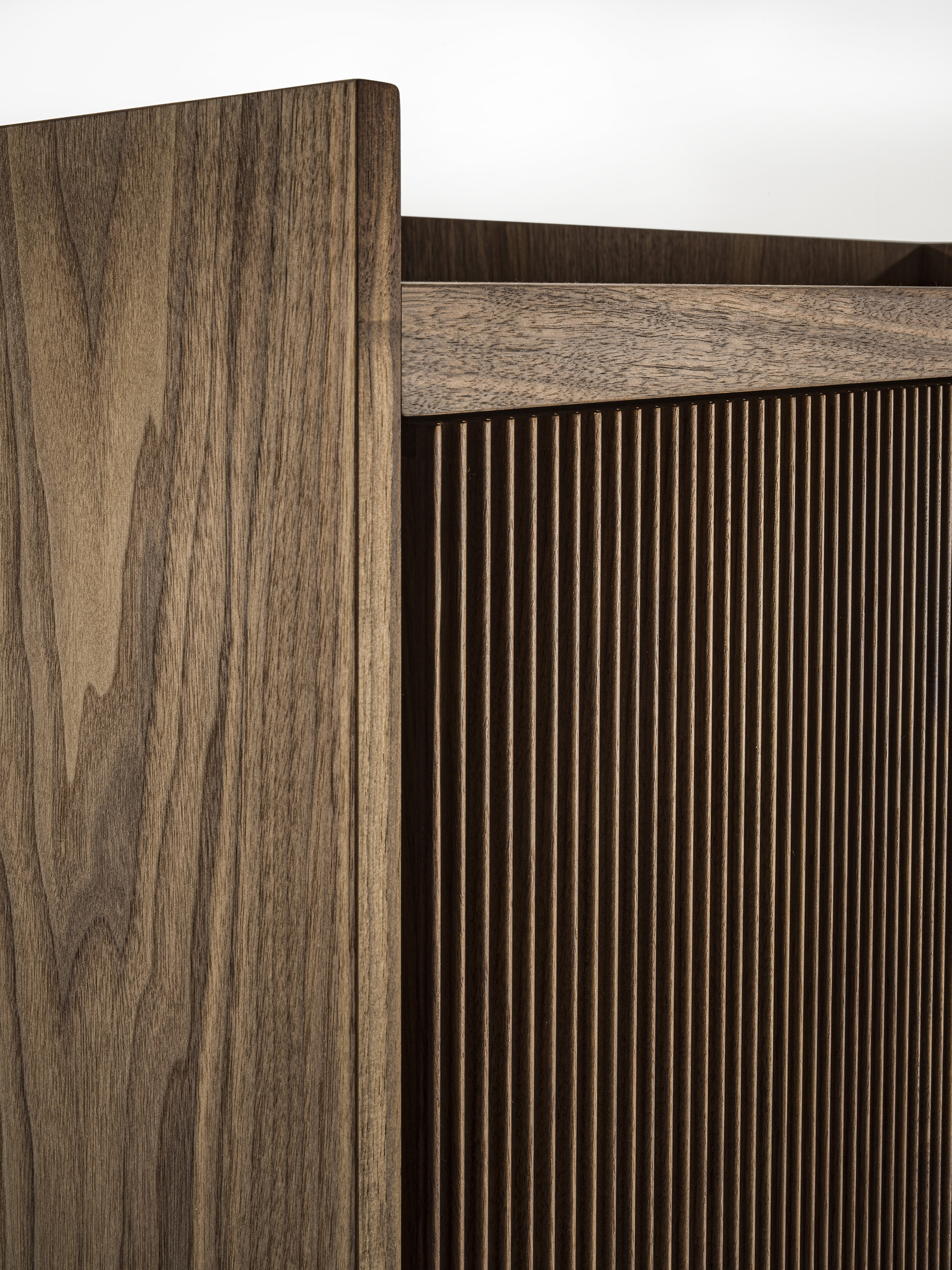 Hohe Anrichte aus Massivholz und Tischlerplatte, die sich durch einen Rahmen auszeichnet, der die Platte einschließt, mit Einlegeböden und Schubladen im Inneren, die mit traditionellen Schwalbenschwanzverbindungen und einem durchgefrästen Griff versehen sind. Ausgestattet mit zwei Türen mit Push-Pull-Öffnung; die spezielle vertikale Bearbeitung der Türen, Fresart, erzeugt einen modernen und dynamischen geometrischen Effekt. Hohe Anrichte aus Massivholz und Tischlerplatte, die sich durch einen Rahmen auszeichnet, der die Platte einschließt, mit Einlegeböden und Schubladen im Inneren, die mit traditionellen Schwalbenschwanzverbindungen und einem durchgefrästen Griff versehen sind. Ausgestattet mit zwei Türen mit Push-Pull-Öffnung; die spezielle vertikale Bearbeitung der Türen, Fresart, erzeugt einen modernen und dynamischen geometrischen Effekt.