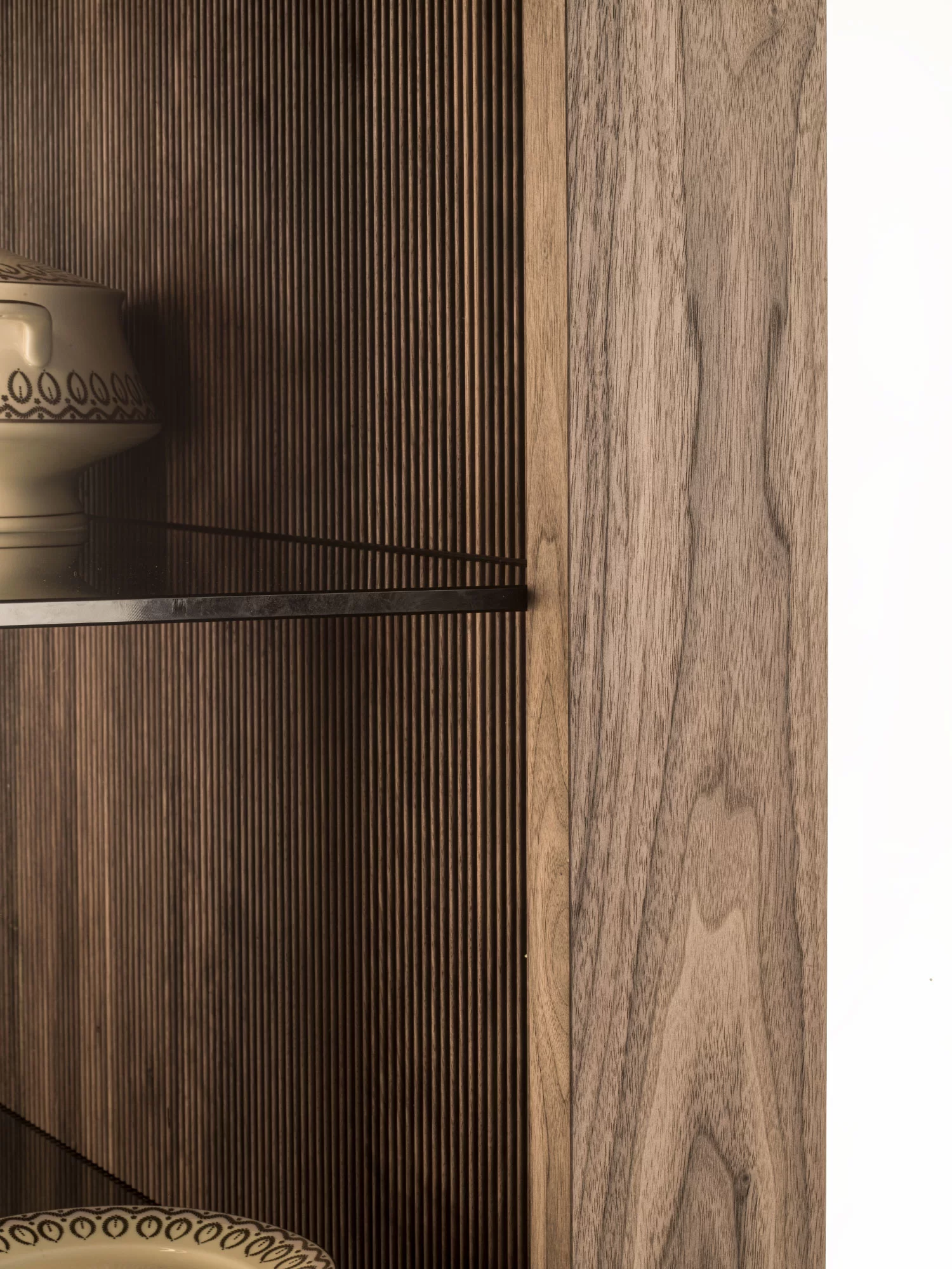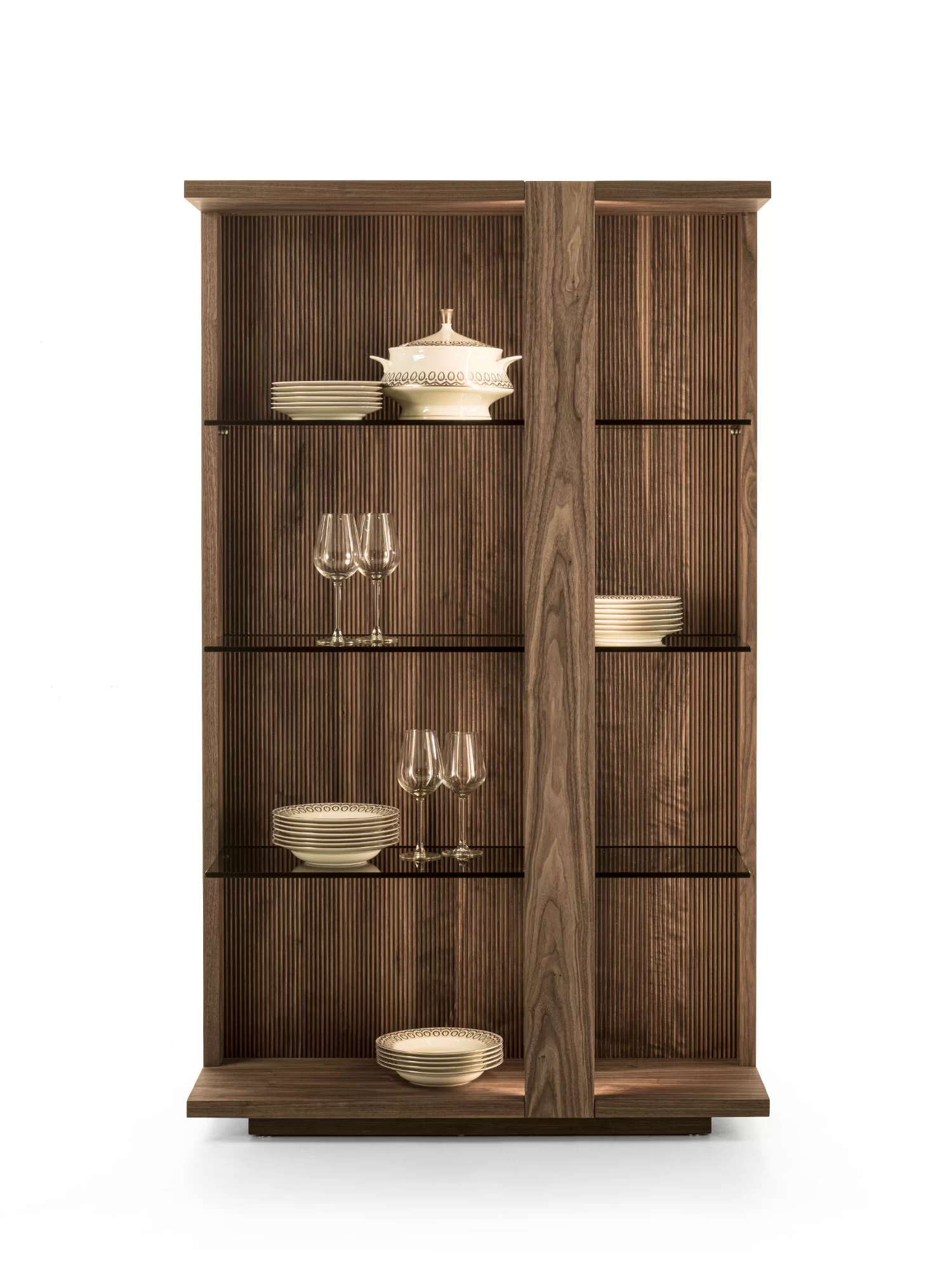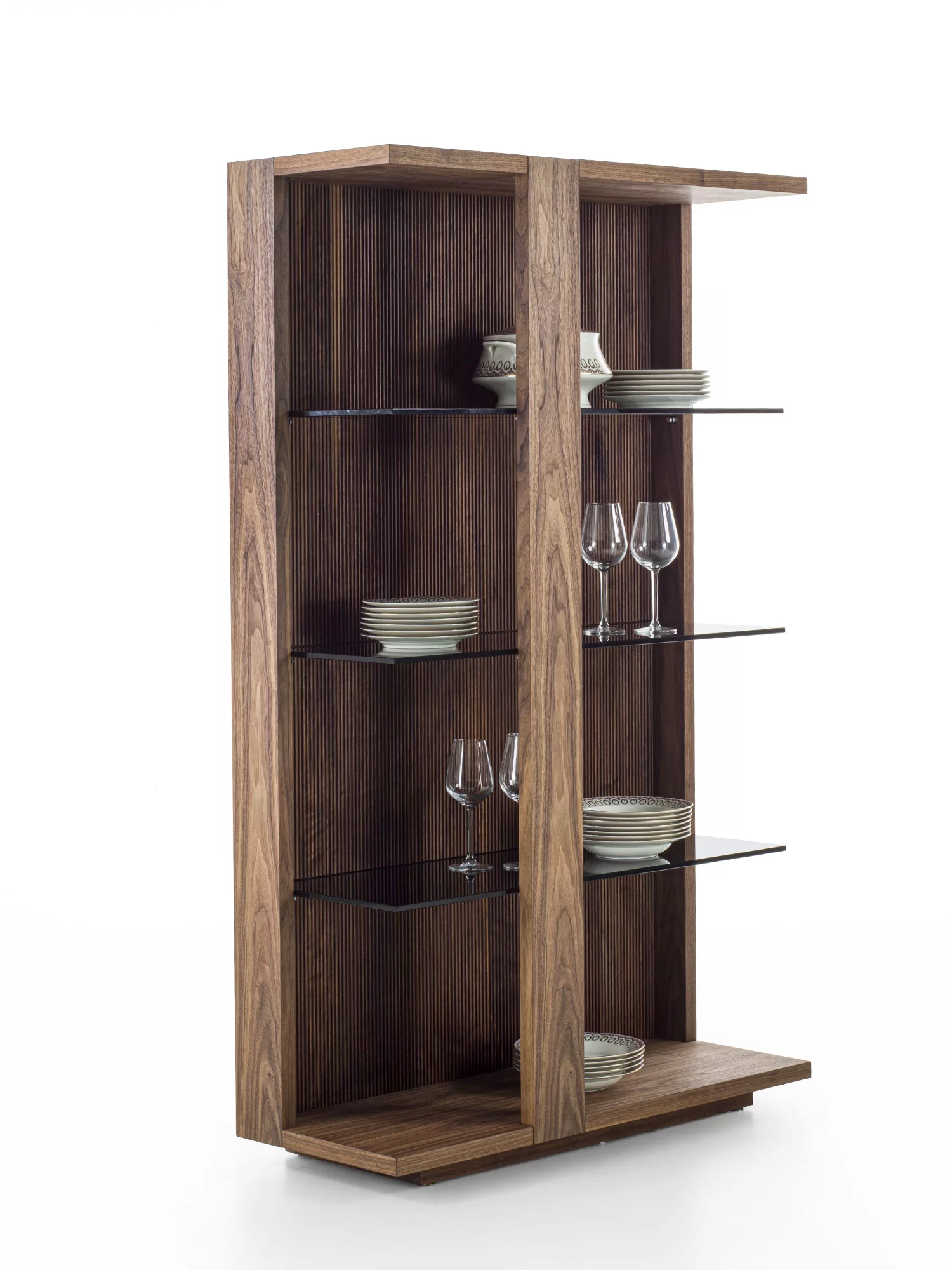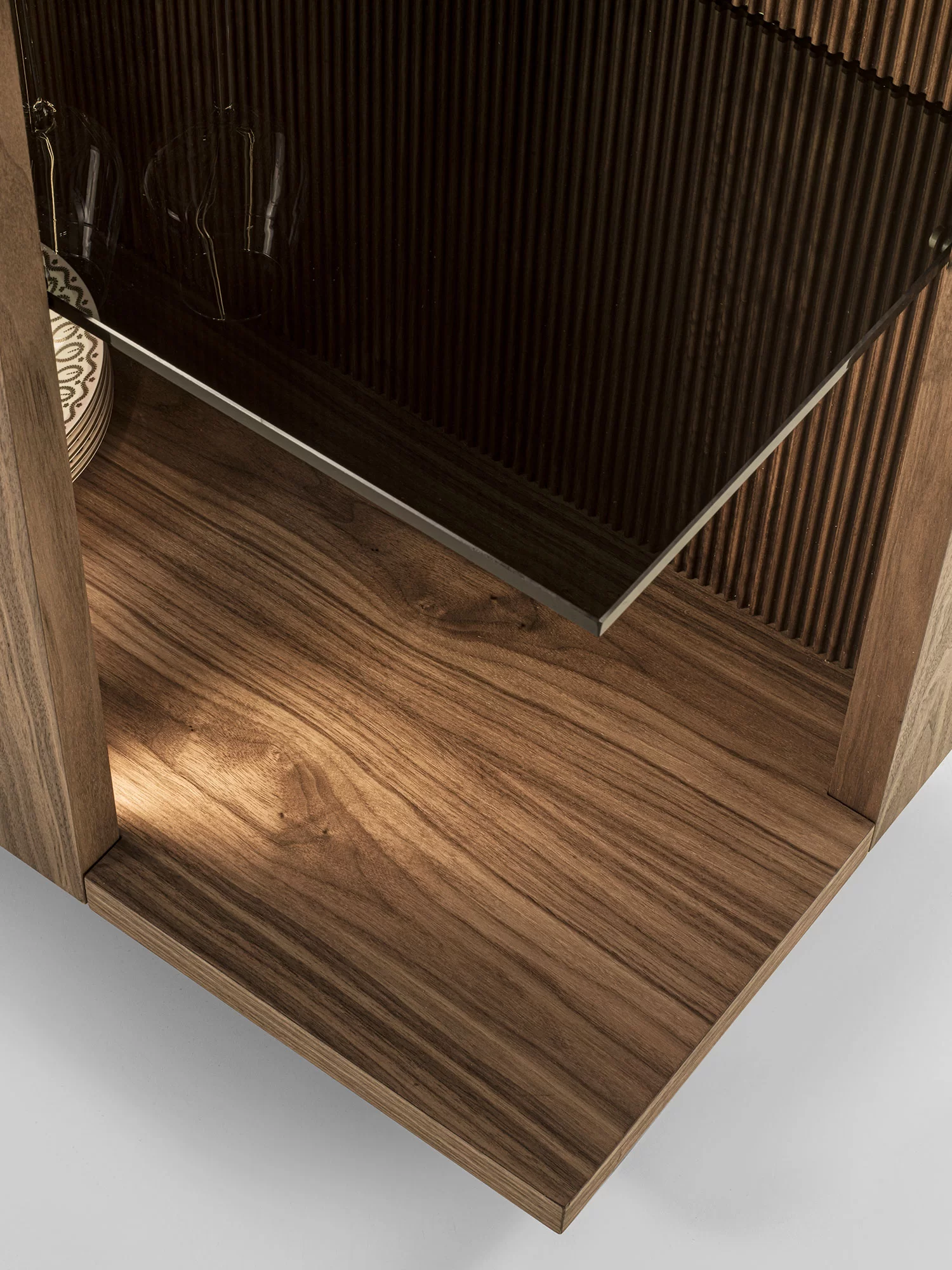 Die Kollektion Revo wird durch ein hohes, offenes Sideboard aus Massivholz und Tischlerplatte mit drei 10 mm starken Glasböden ergänzt. Abdeckplatte und Sockel aus Holz. Erhältlich in zwei Varianten: mit Fresart Verarbeitung auf der Rückwand oder auf den drei vertikalen Strukturpaneele. Diese Verarbeitung erzeugt einen modernen und dynamischen geometrischen Effekt. Beleuchtet mit einem LED-Lichtsystem mit Fernbedienung.