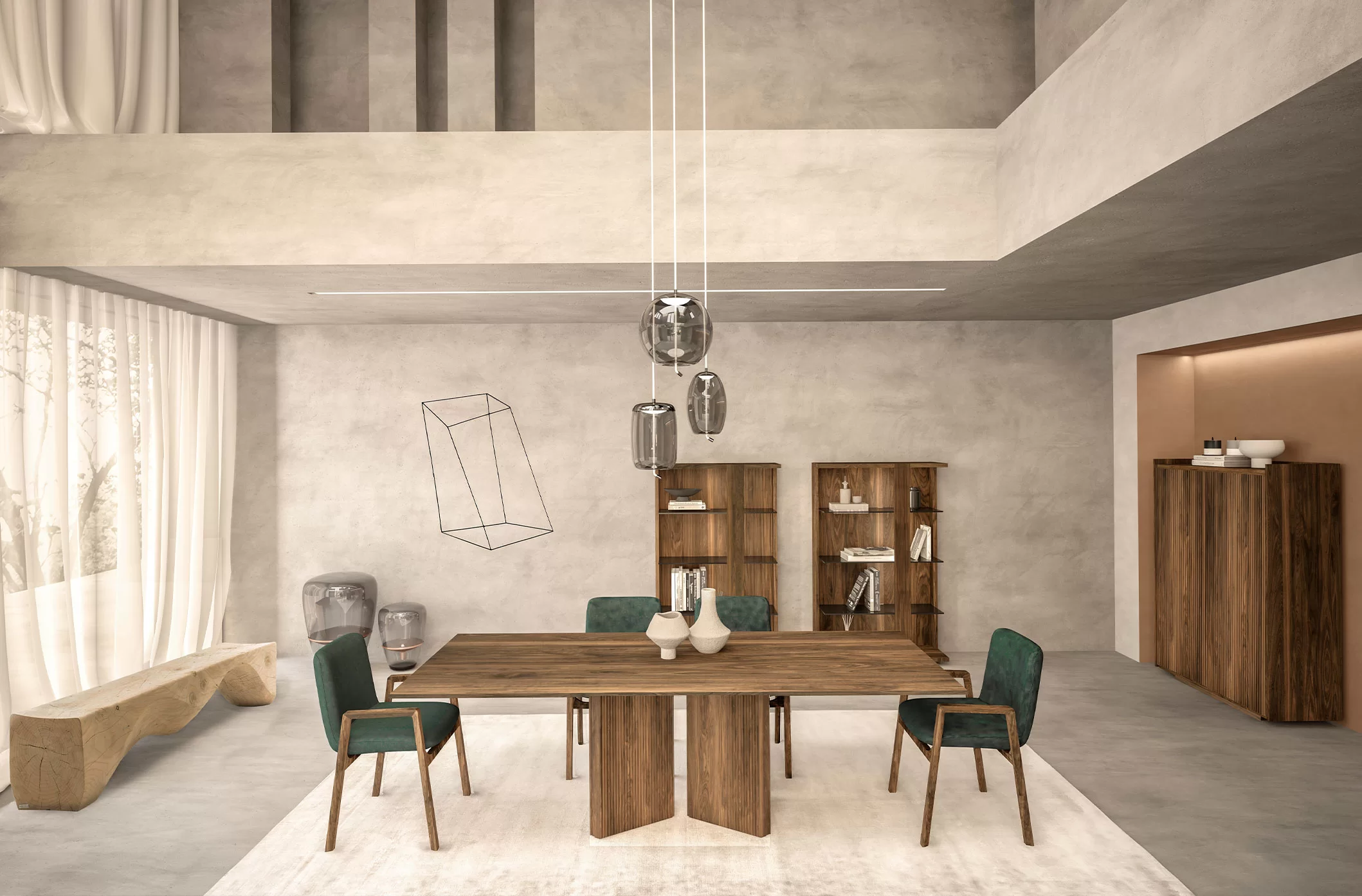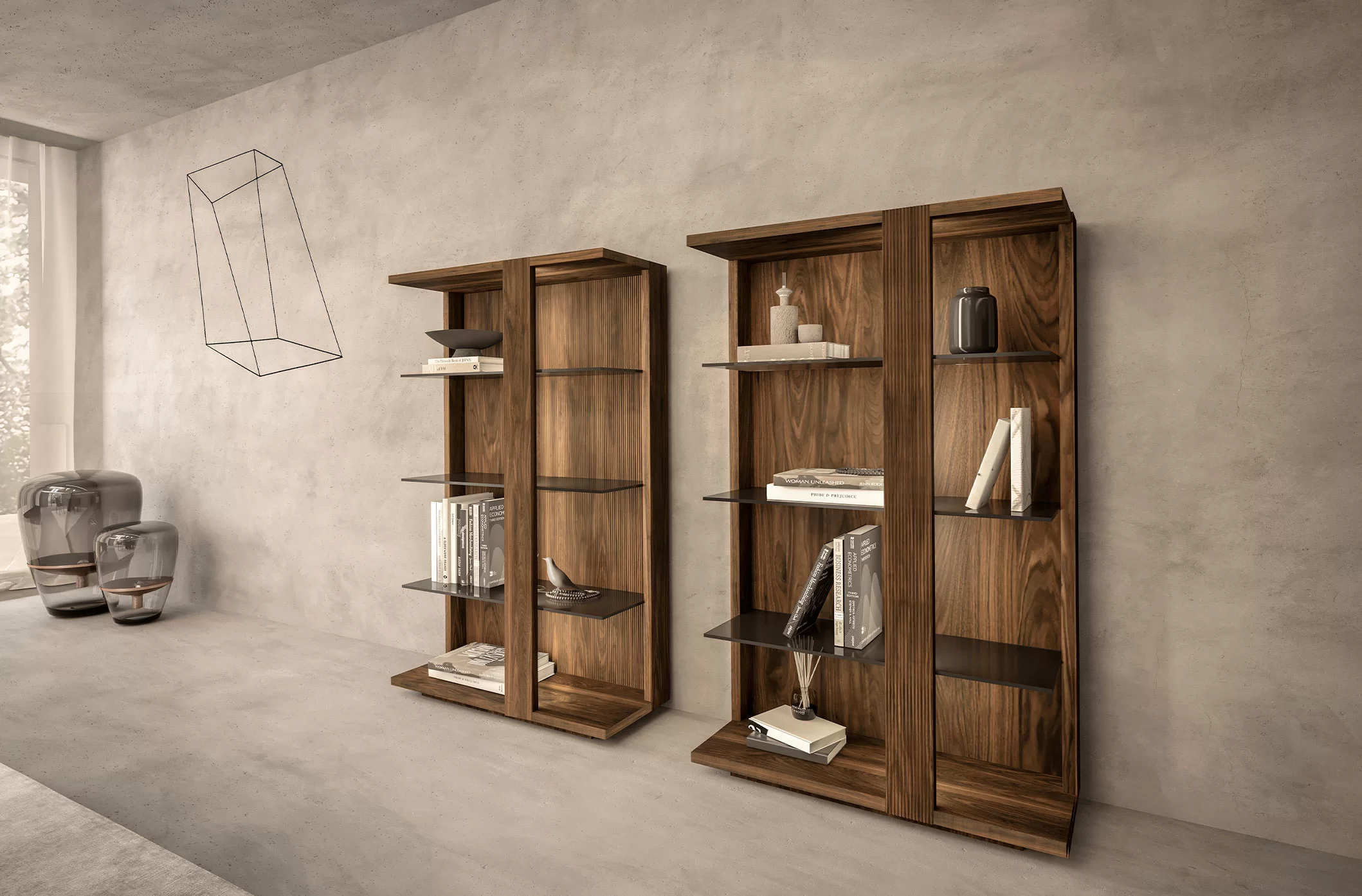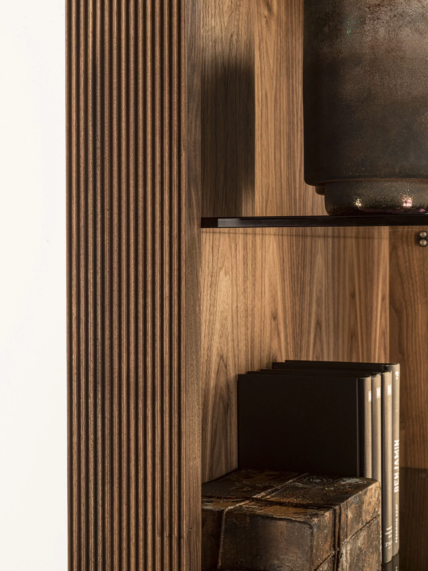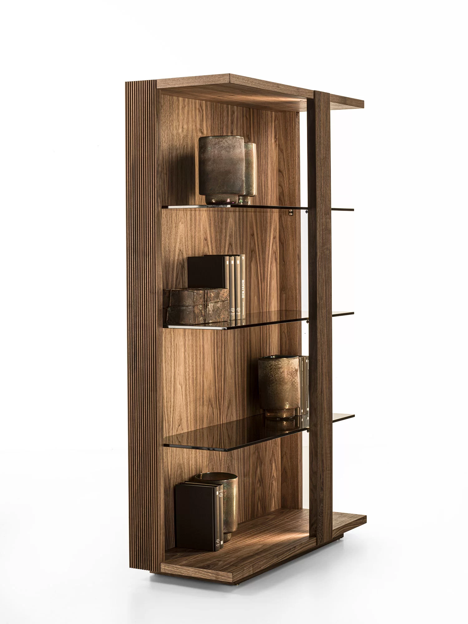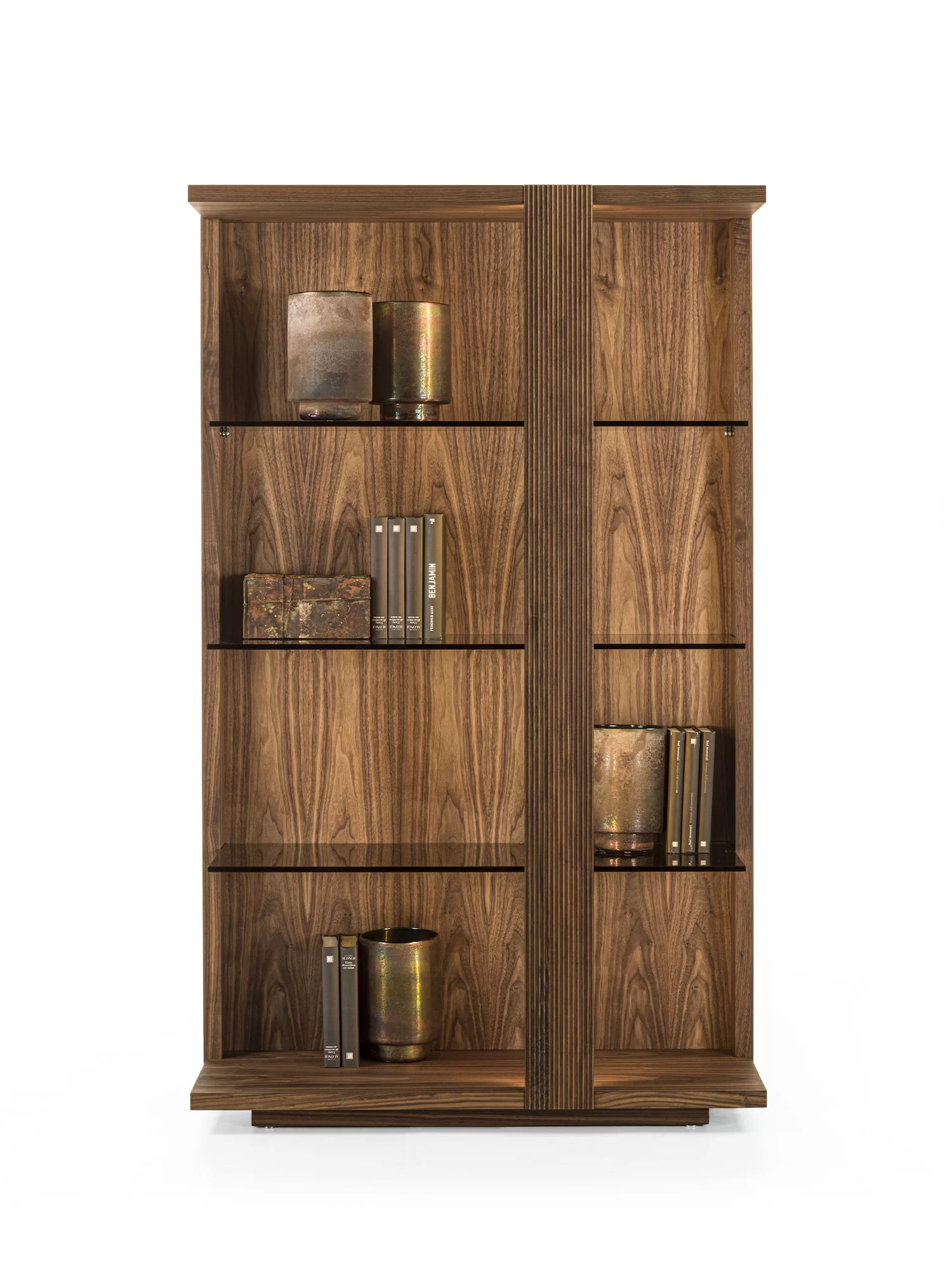 Die Kollektion Revo wird durch ein hohes, offenes Sideboard aus Massivholz und Tischlerplatte mit drei 10 mm starken Glasböden ergänzt. Abdeckplatte und Sockel aus Holz. Erhältlich in zwei Varianten: mit Fresart Verarbeitung auf der Rückwand oder auf den drei vertikalen Strukturpaneele. Diese Verarbeitung erzeugt einen modernen und dynamischen geometrischen Effekt. Beleuchtet mit einem LED-Lichtsystem mit Fernbedienung.