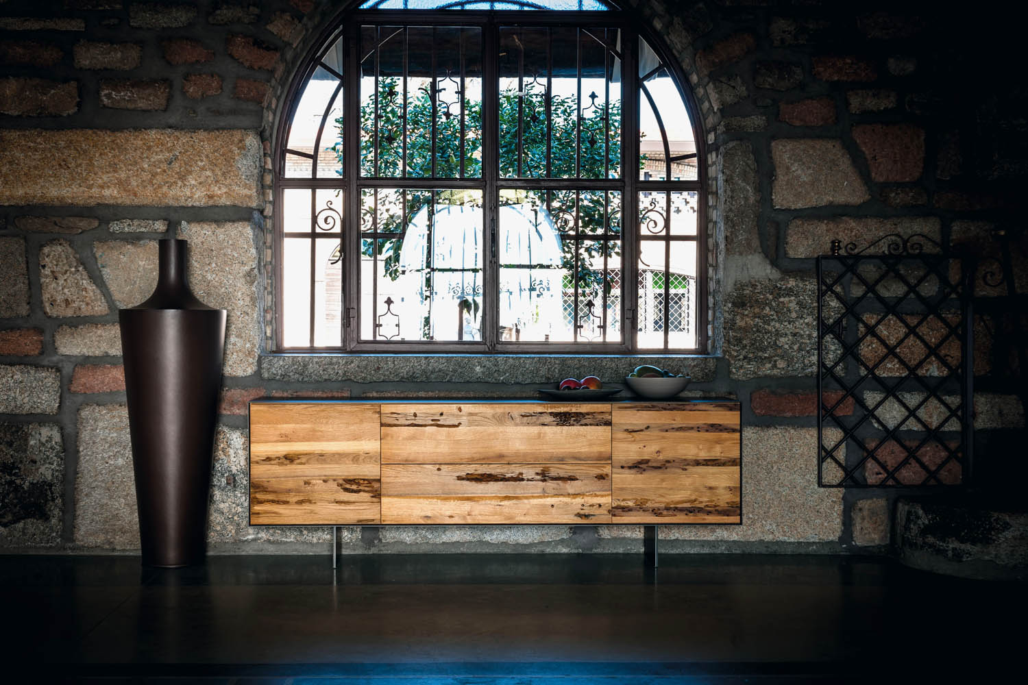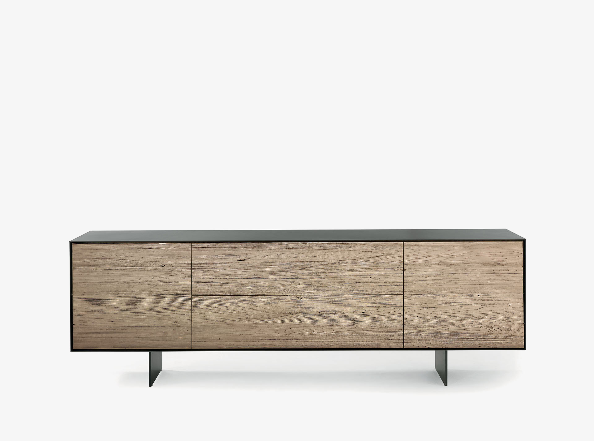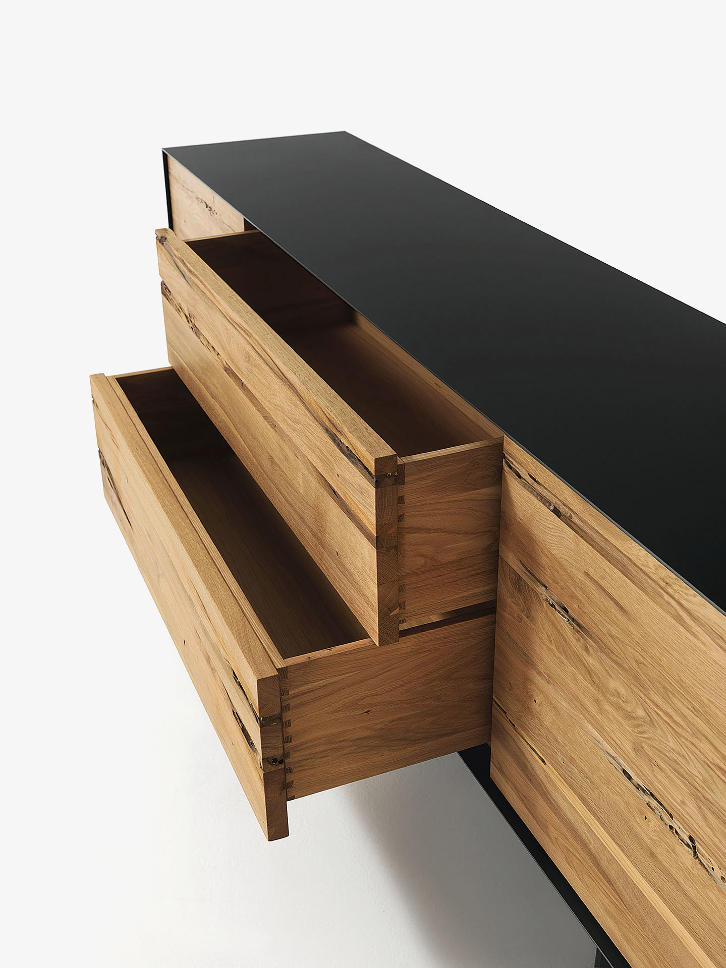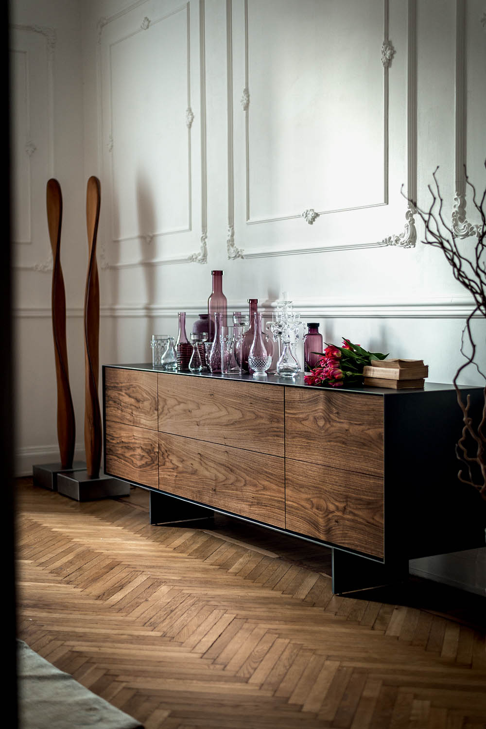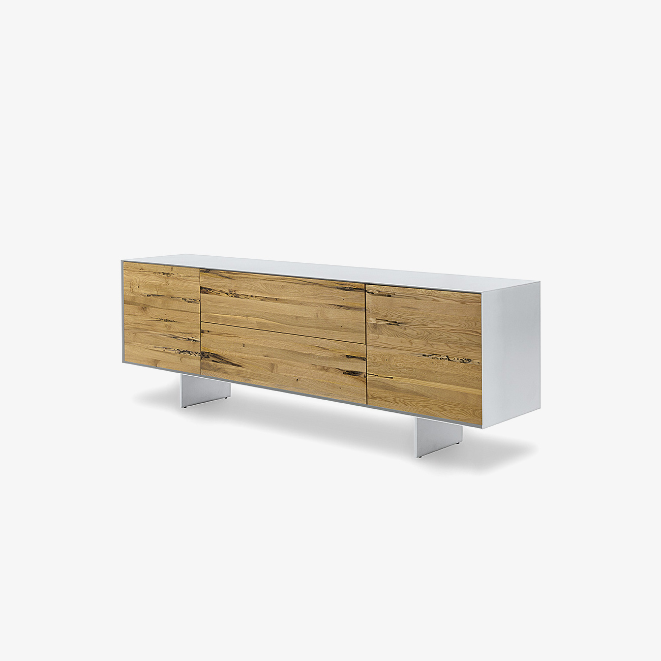 Sideboard aus Massiv- und Furnierschichtholz, mit Außenrahmen wahlweise aus Holz oder Metall erhältlich. Dies Sideboard verfügt über Drehtüren und Schubladen mit Schwalbenschwanzverbindungen. Der Möbelkorpus steht auf dünnen Eisen-Fußwangen.