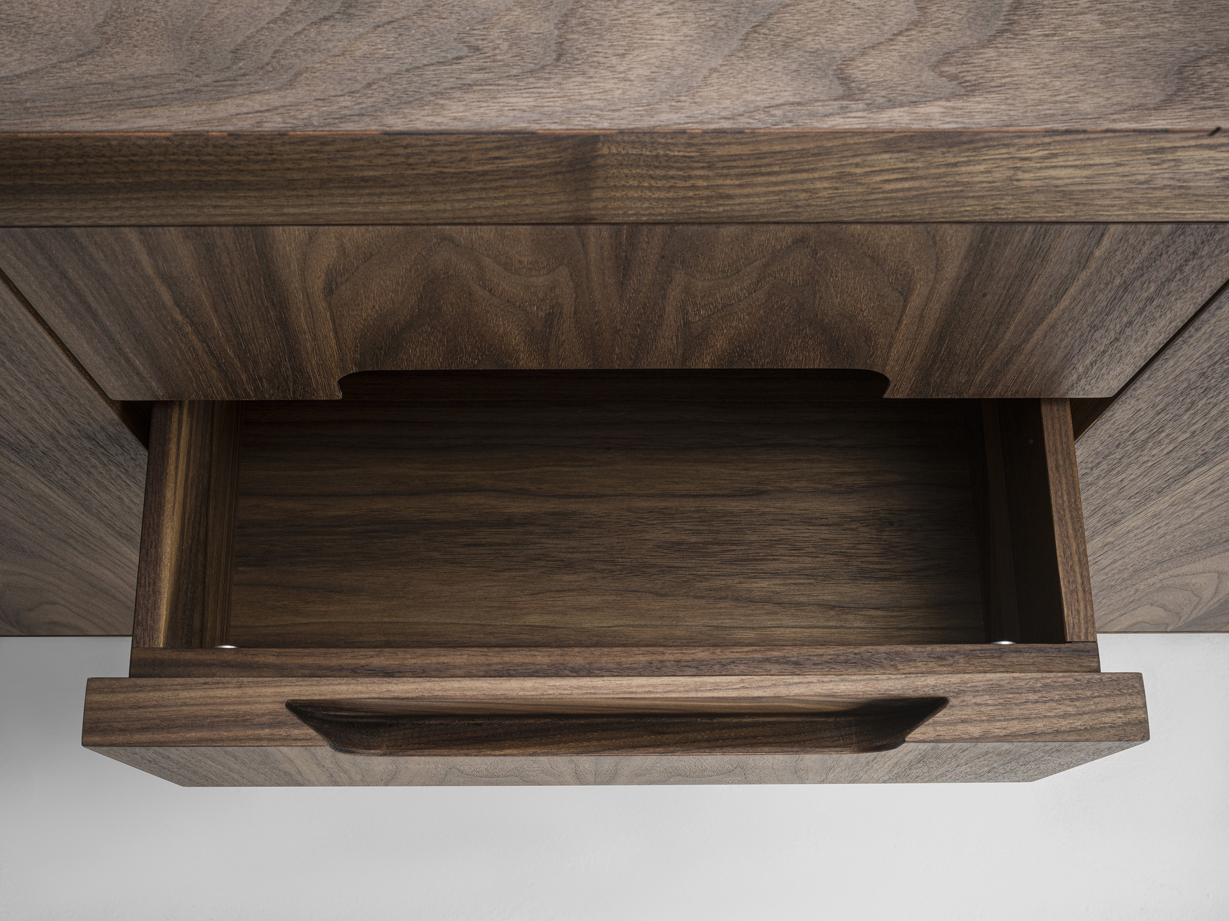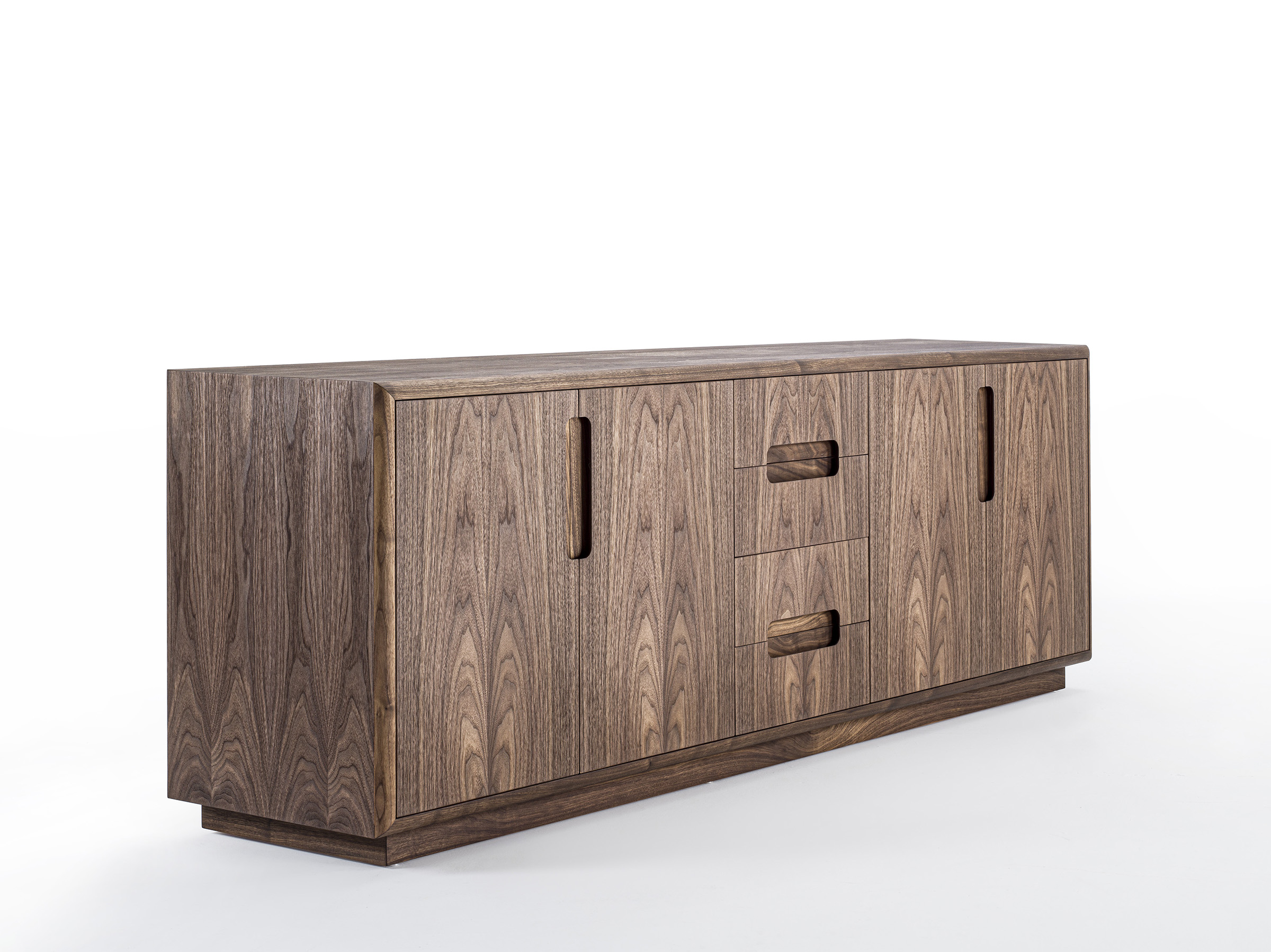 Sideboard aus Massivholz und Tischlerplatte. Ausgestattet mit vier Türen und vier Schubladen mit versenkten, geformten Griffen. Die Schubladen sind mit Schwalbenschwanzverbindungen montiert. Struktur mit abgerundeten Kanten.