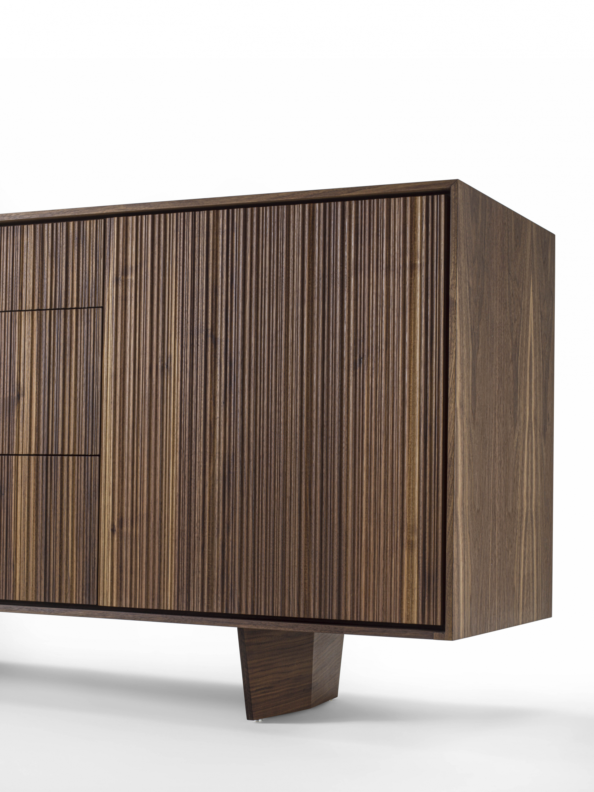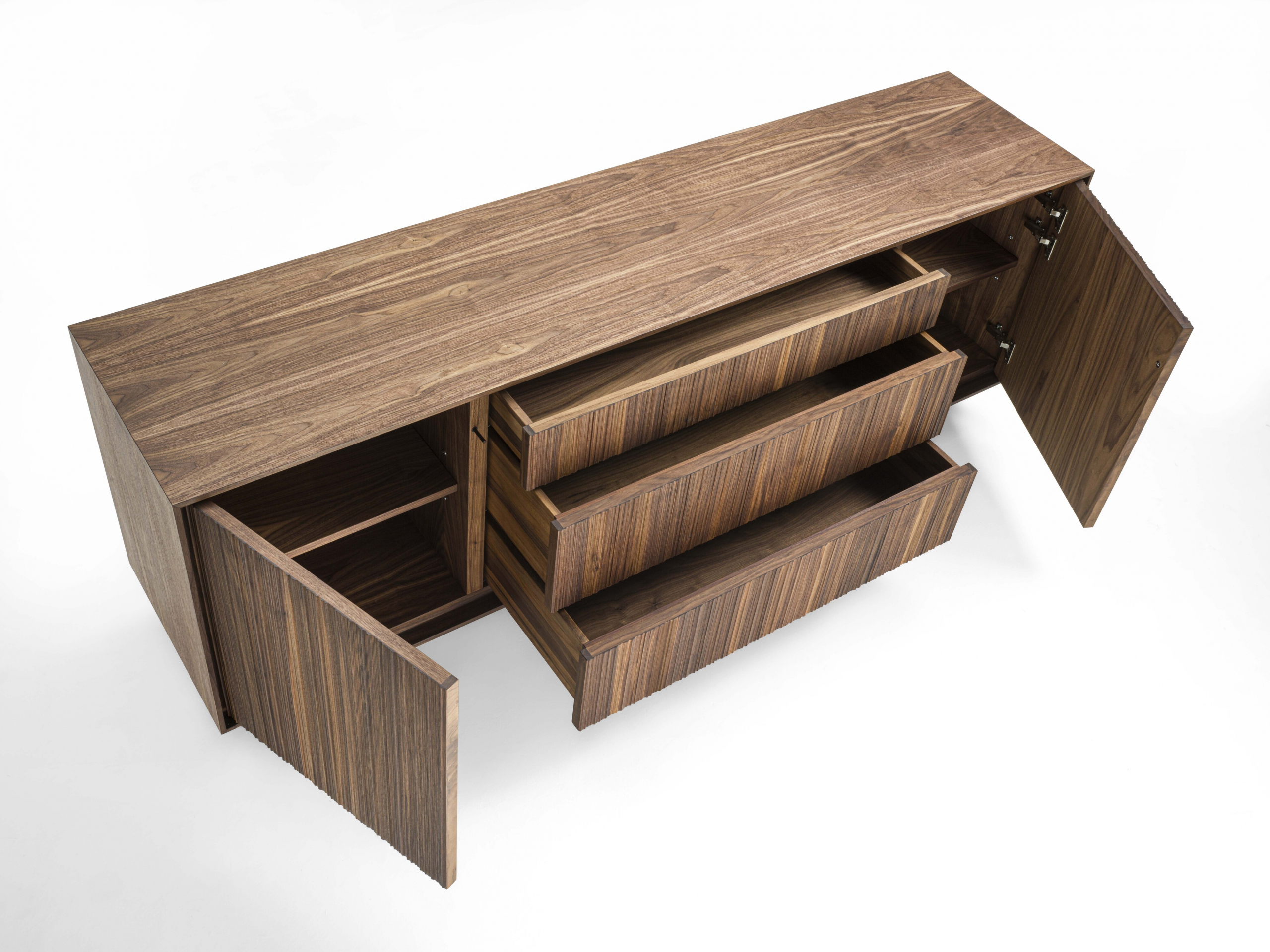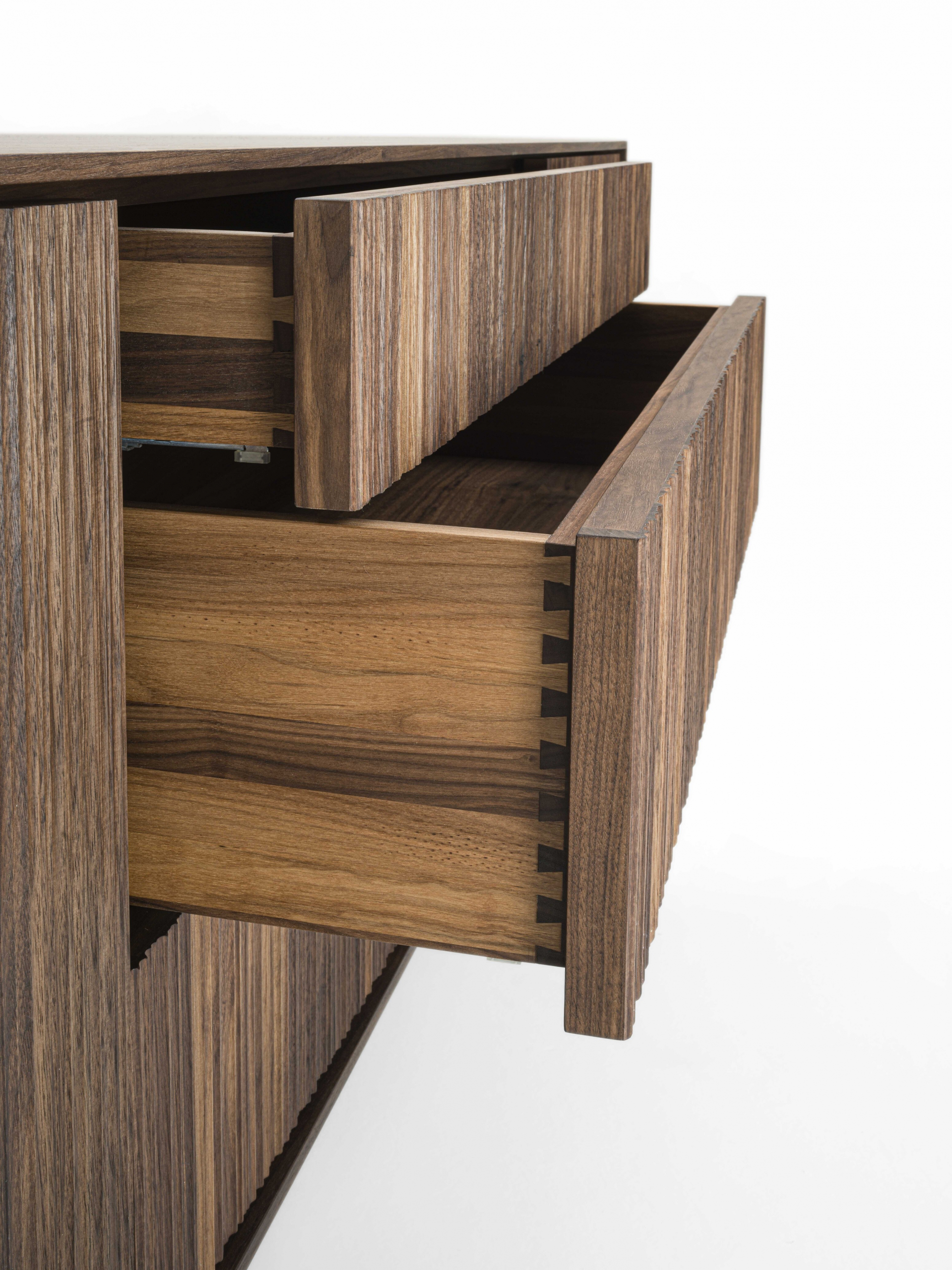 Sideboard aus Massivholz und Tischlerplatte, gekennzeichnet durch eine besondere vertikale Verarbeitung von Türen und Schubladenfronten, die einen modernen und dynamischen geometrischen Effekt erzeugt. Schubladen mit Schwalbenschwanzverbindung montiert.
