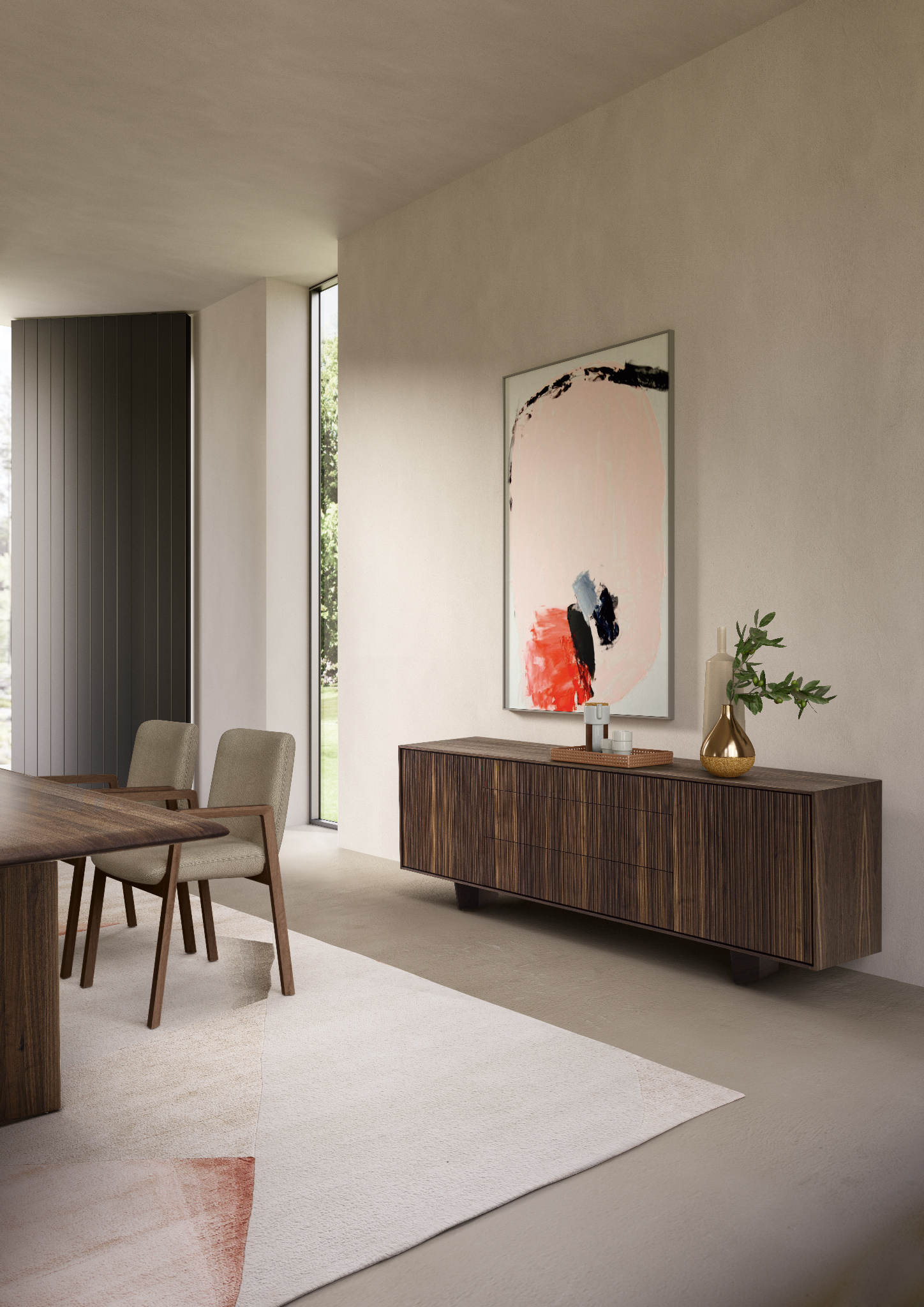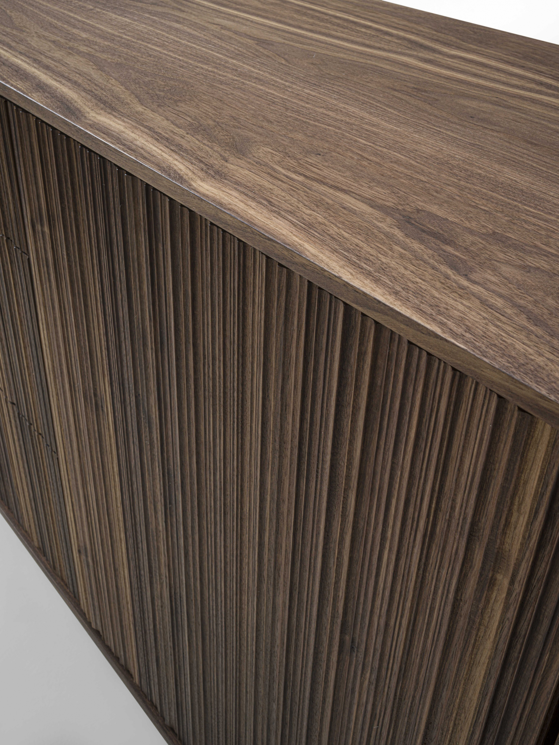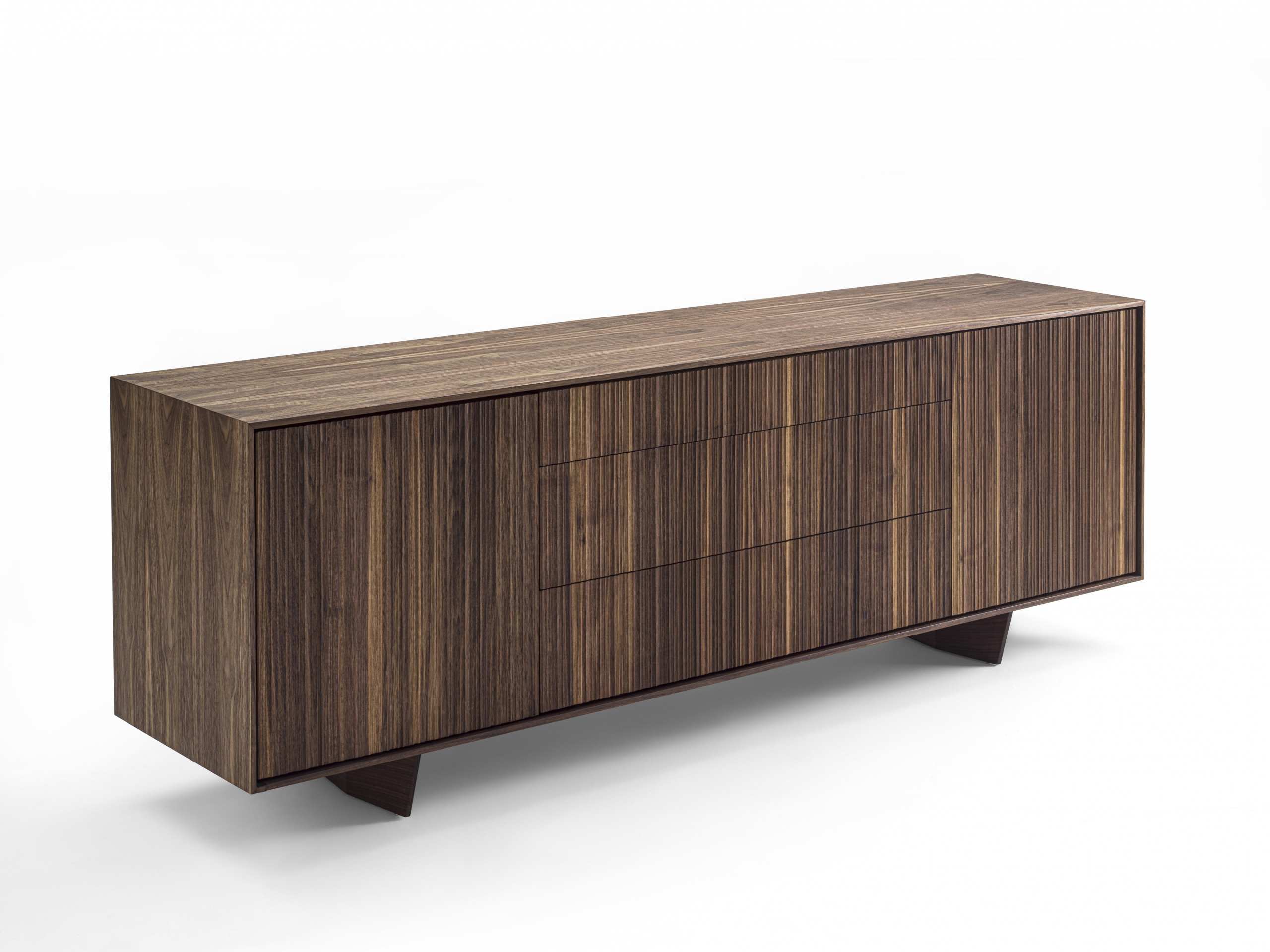 Sideboard aus Massivholz und Tischlerplatte, gekennzeichnet durch eine besondere vertikale Verarbeitung von Türen und Schubladenfronten, die einen modernen und dynamischen geometrischen Effekt erzeugt. Schubladen mit Schwalbenschwanzverbindung montiert.