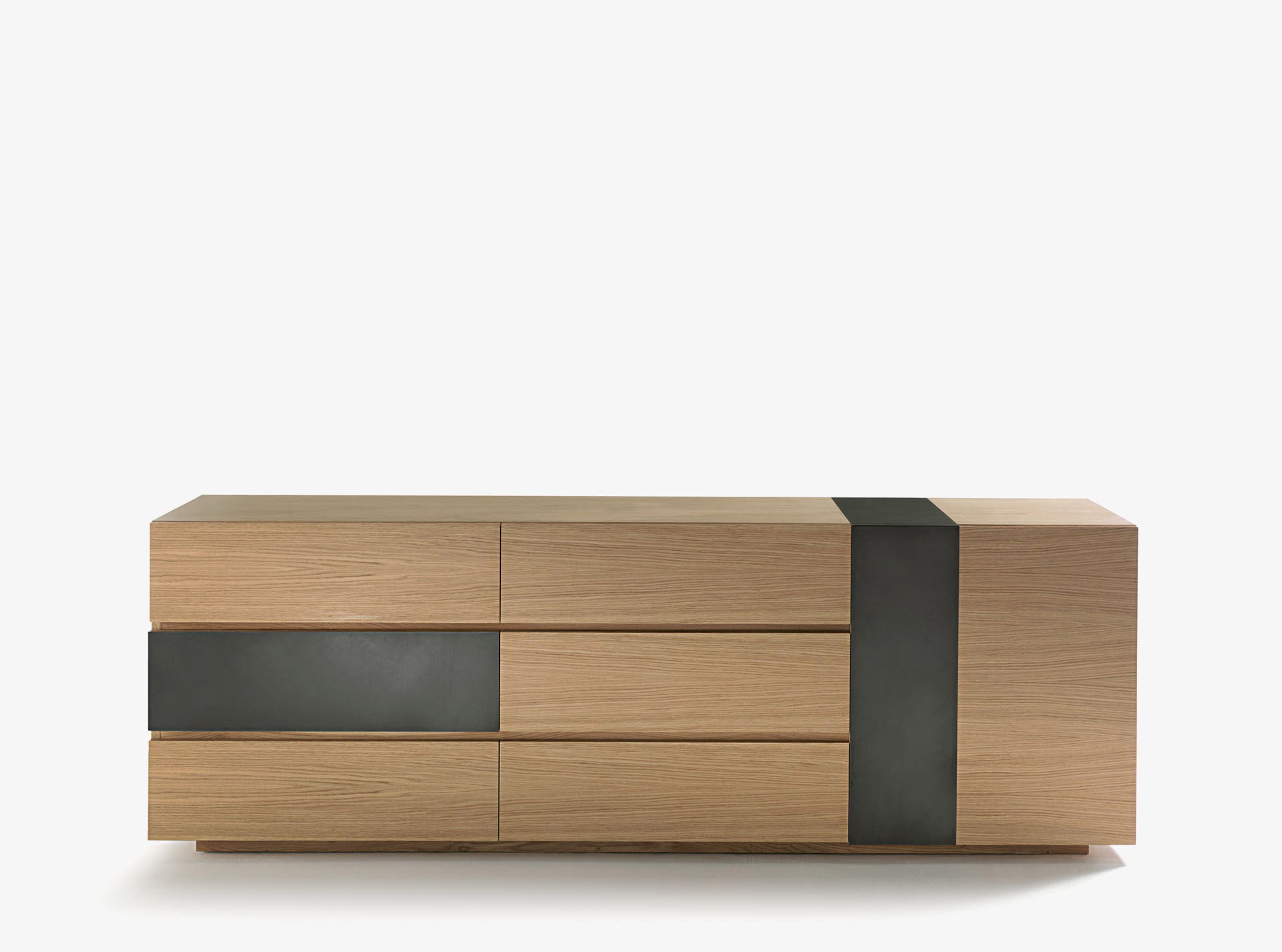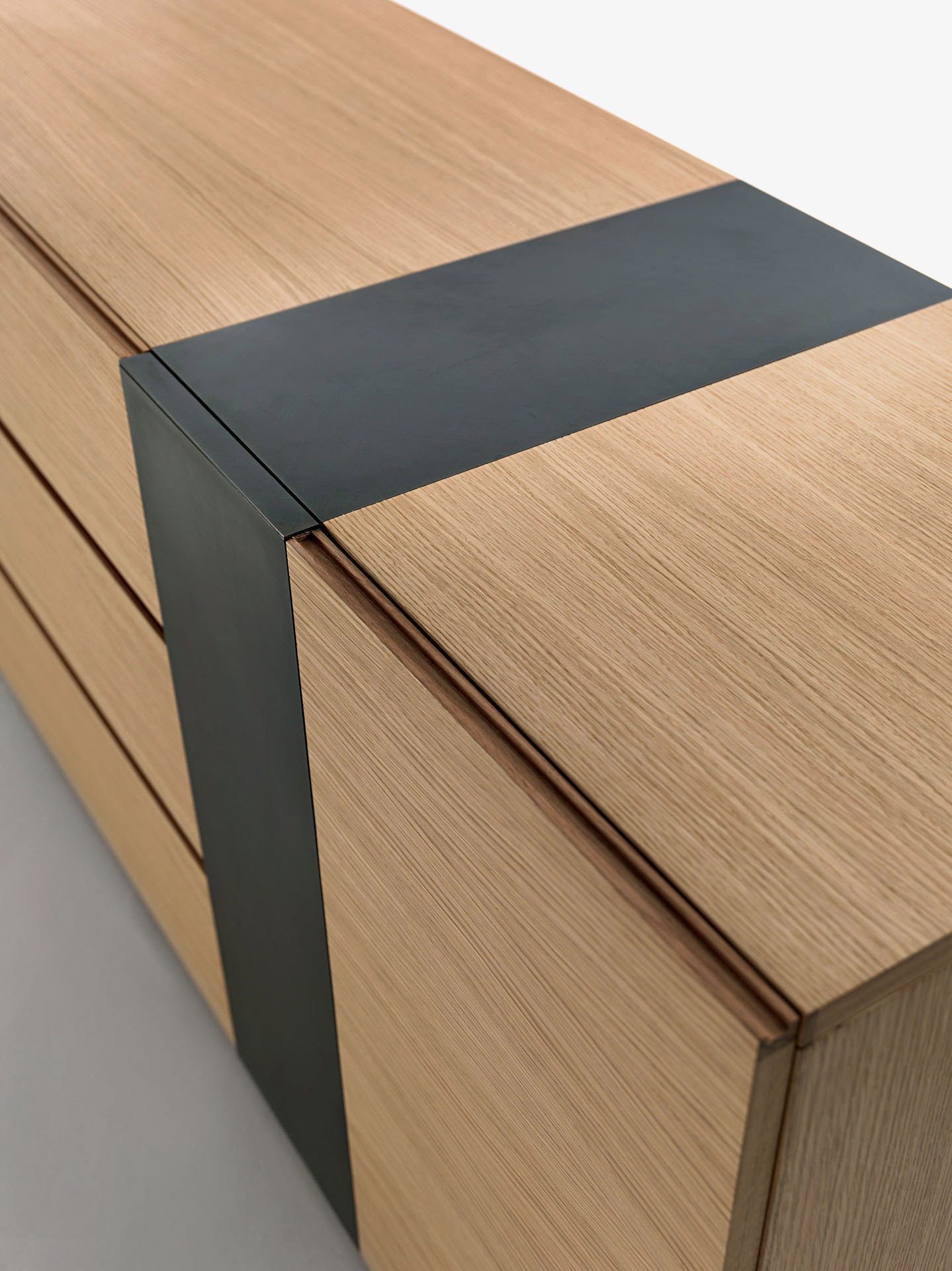 Kommode bestehend aus Massiv- und Furnierschichtholz mit Eisen-Einsätzen, von Griffnuten in den Schubladen und in den Türen charakterisiert. Die Schubladen weisen die traditionelle Schwalbenschwanzverbindung auf.