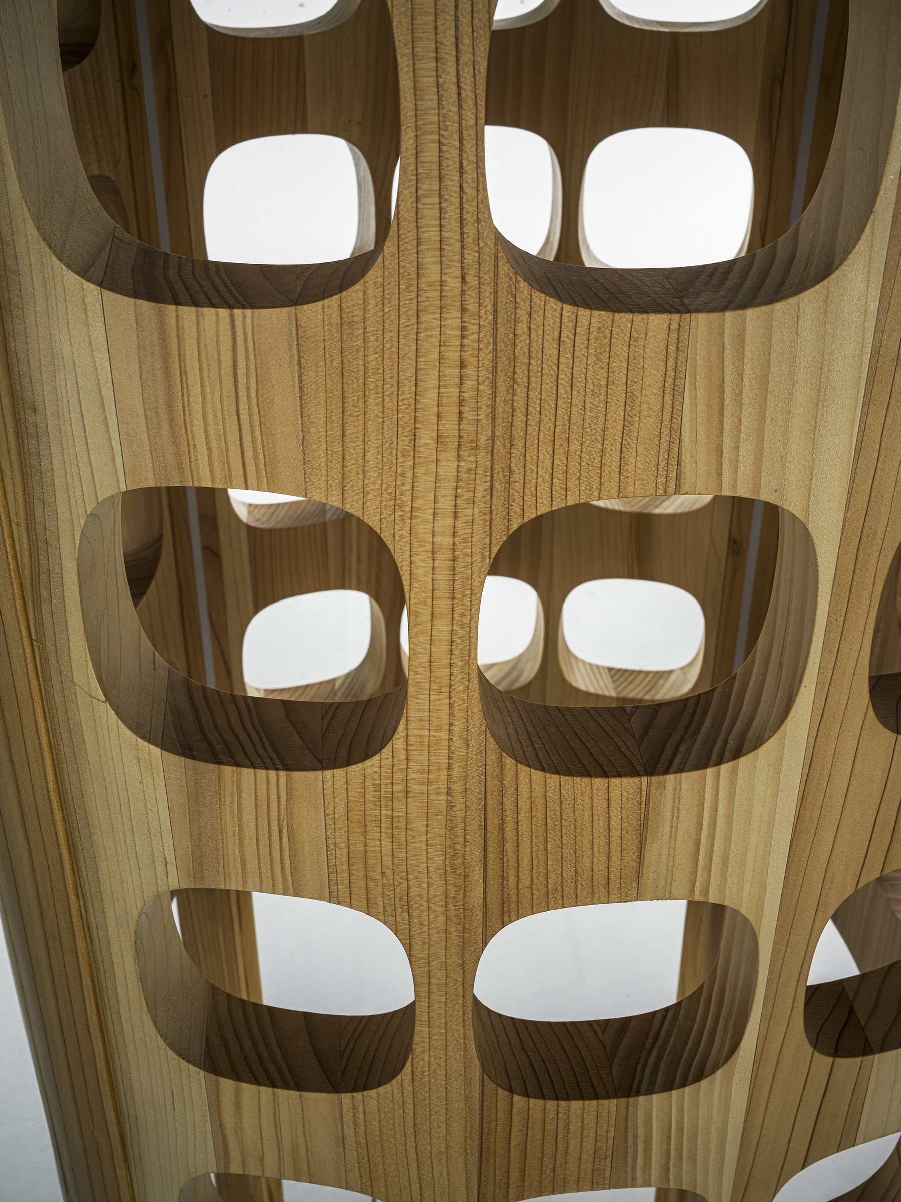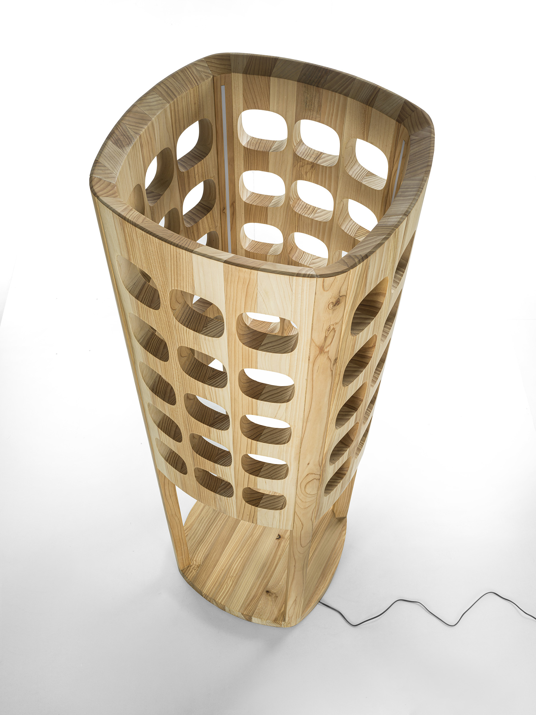 Stehleuchte mit skulpturalem Design, komplett aus Massivholz gefertigt. Das Zusammenspiel von Massivholz und Hohlraum ermöglicht es dem Licht, dank der LED-Streifen, durch das Holz zu dringen. Stehleuchte mit skulpturalem Design, komplett aus Massivholz gefertigt. Das Zusammenspiel von Massivholz und Hohlraum ermöglicht es dem Licht, dank der LED-Streifen, durch das Holz zu dringen.