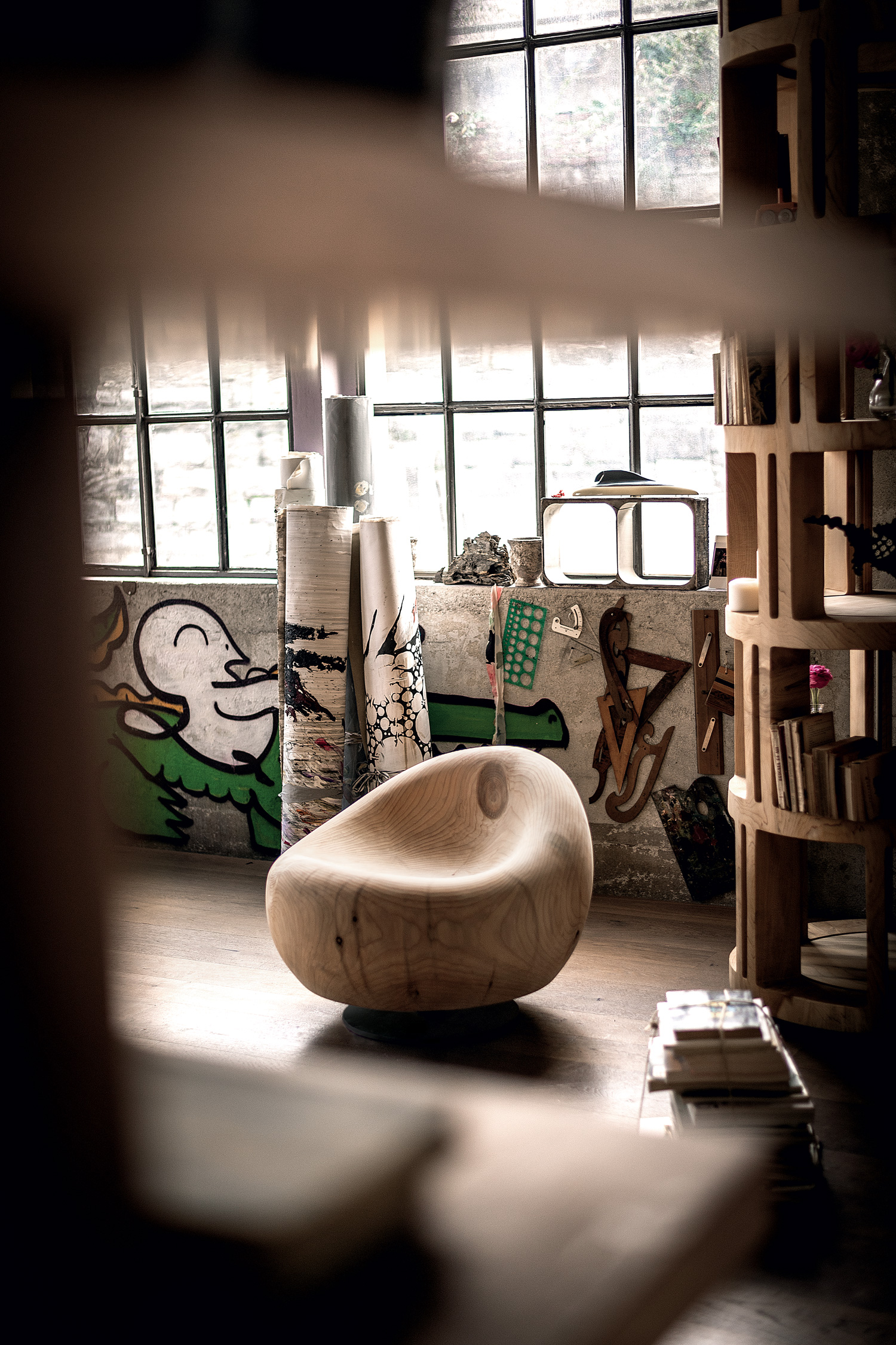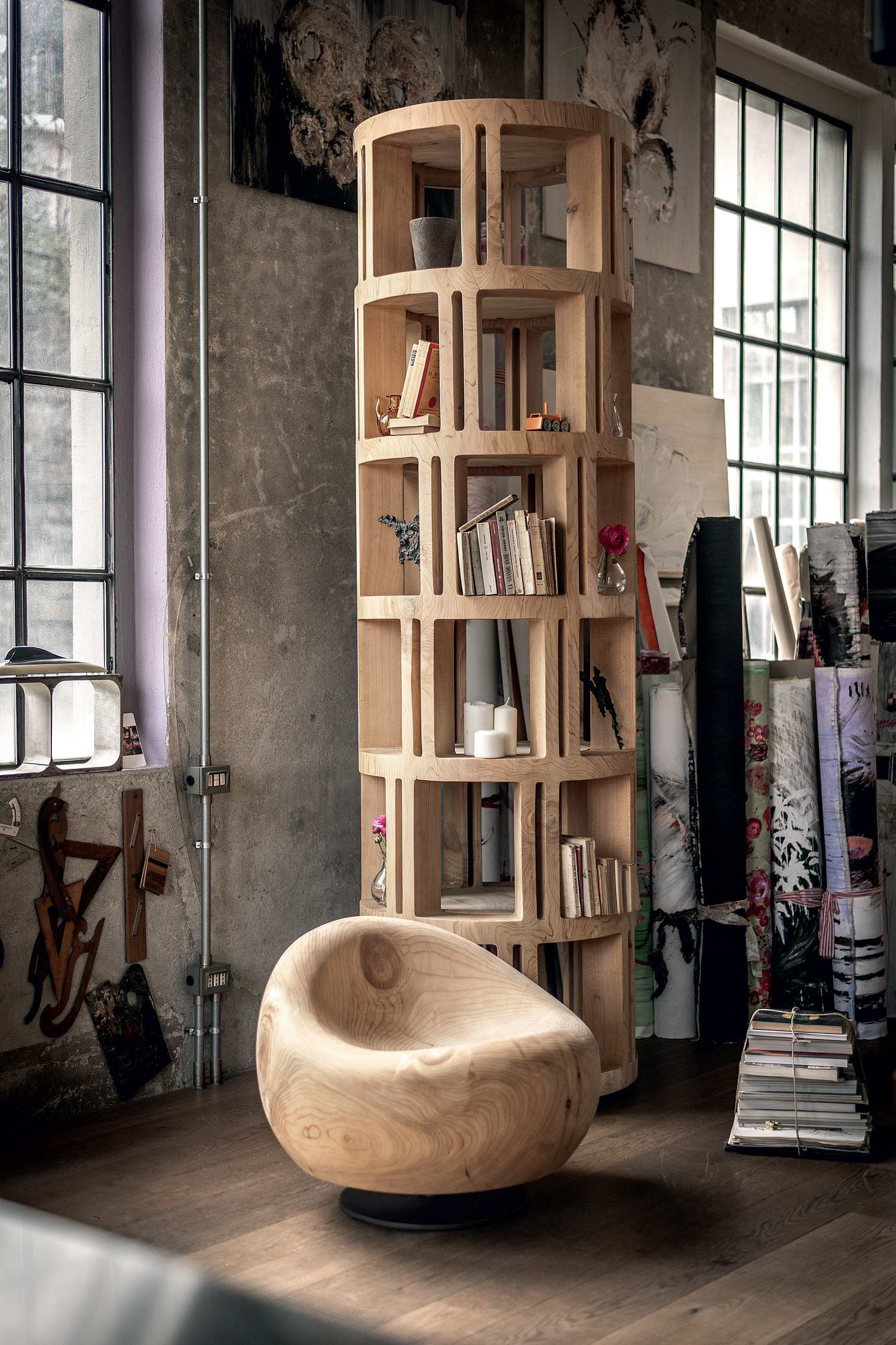 Kurvenförmiger Sessel mit ergonomischer Sitzfläche, aus einem einzigen massiven Block duftendes Zedernholzes gewonnen. In den Versionen mit oder ohne drehbares Eisengestell lieferbar.