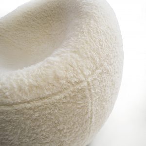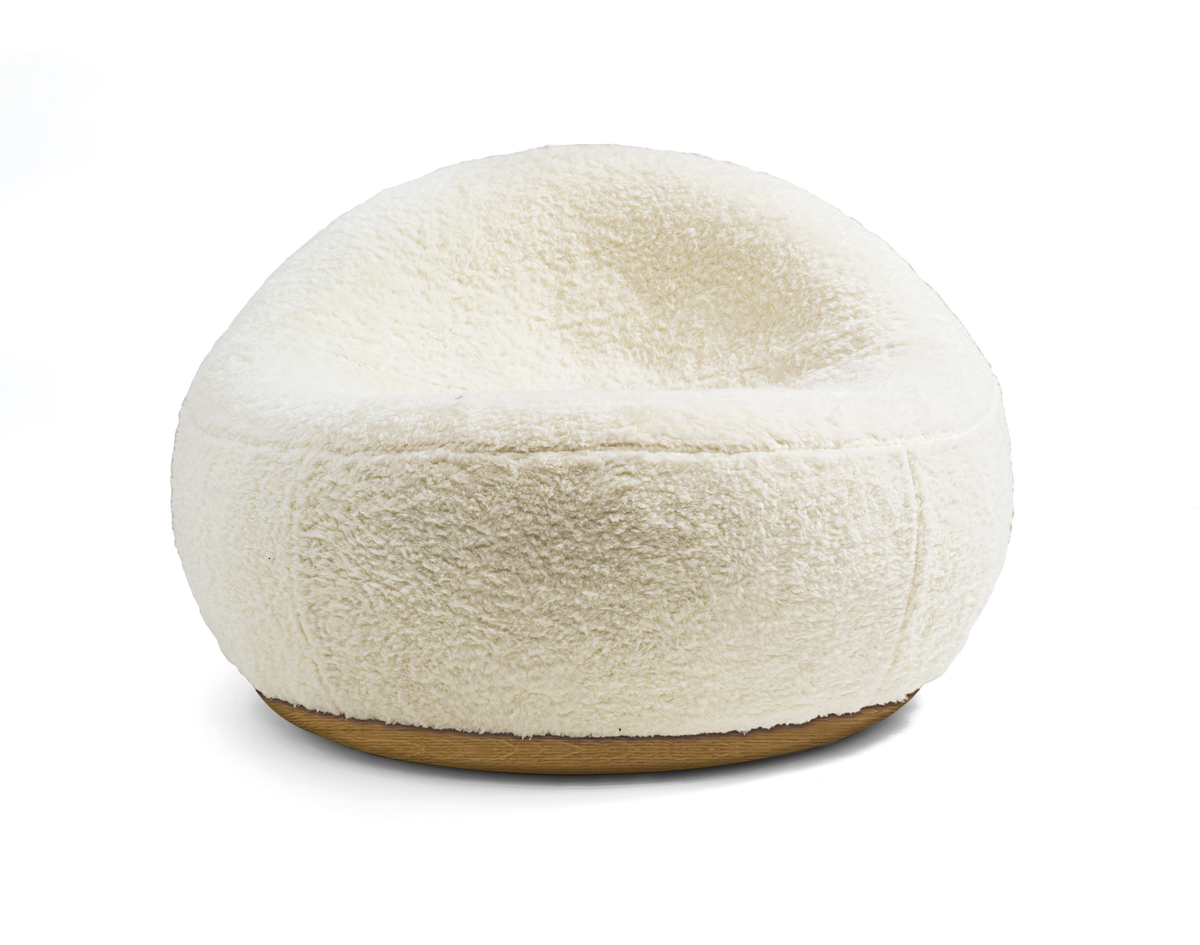 Sessel mit Struktur aus Multischichtholz, gepolstert und aus Leder oder Stoff bezogen. Mit integriertem Drehfuß. Der größere Durchmesser im Vergleich zu der Variante aus Holz sorgt für mehr Komfort.