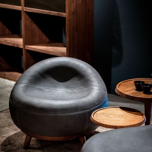 Sessel mit Struktur aus Multischichtholz, gepolstert und aus Leder mit sichtbaren und geometrischen Nähten bezogen. Gestell bestehend aus Füßchen in Massivholz.