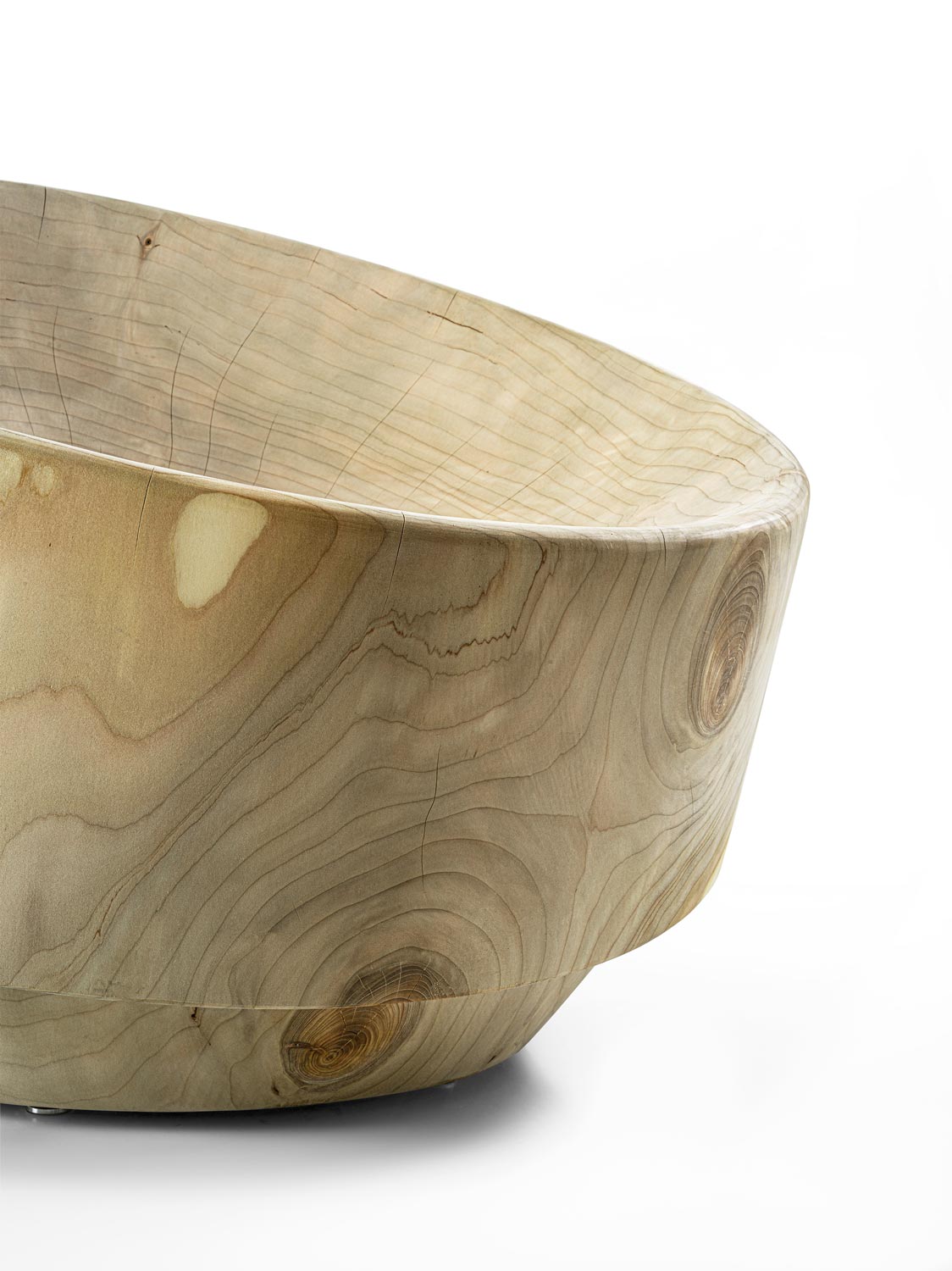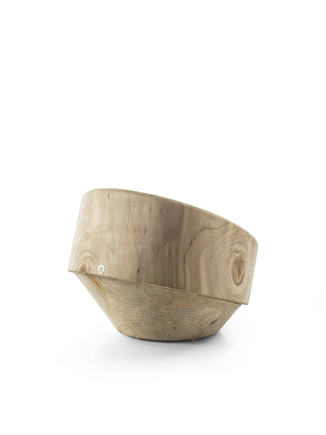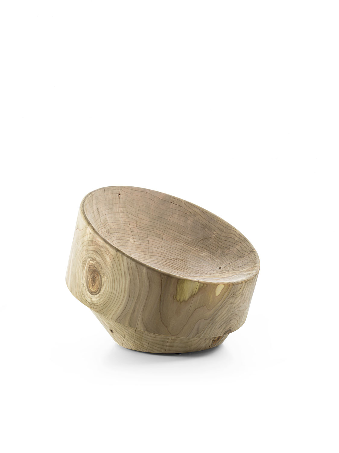 Aus einem einzigen Block massiven, duftenden Zedernholzes gefertigter Sessel. Ein kurvenfömiger Monolith, der sich durch eine ergonomische Sitzfläche, die fließend in die Rückenlehne übergeht, unterscheidet. Das Design ist das Ergebnis ein sorgfältigen Untersuchung der Wirkung von perfekt runden, fast kinetischen Formen auf die Volumina des Rohmaterials.