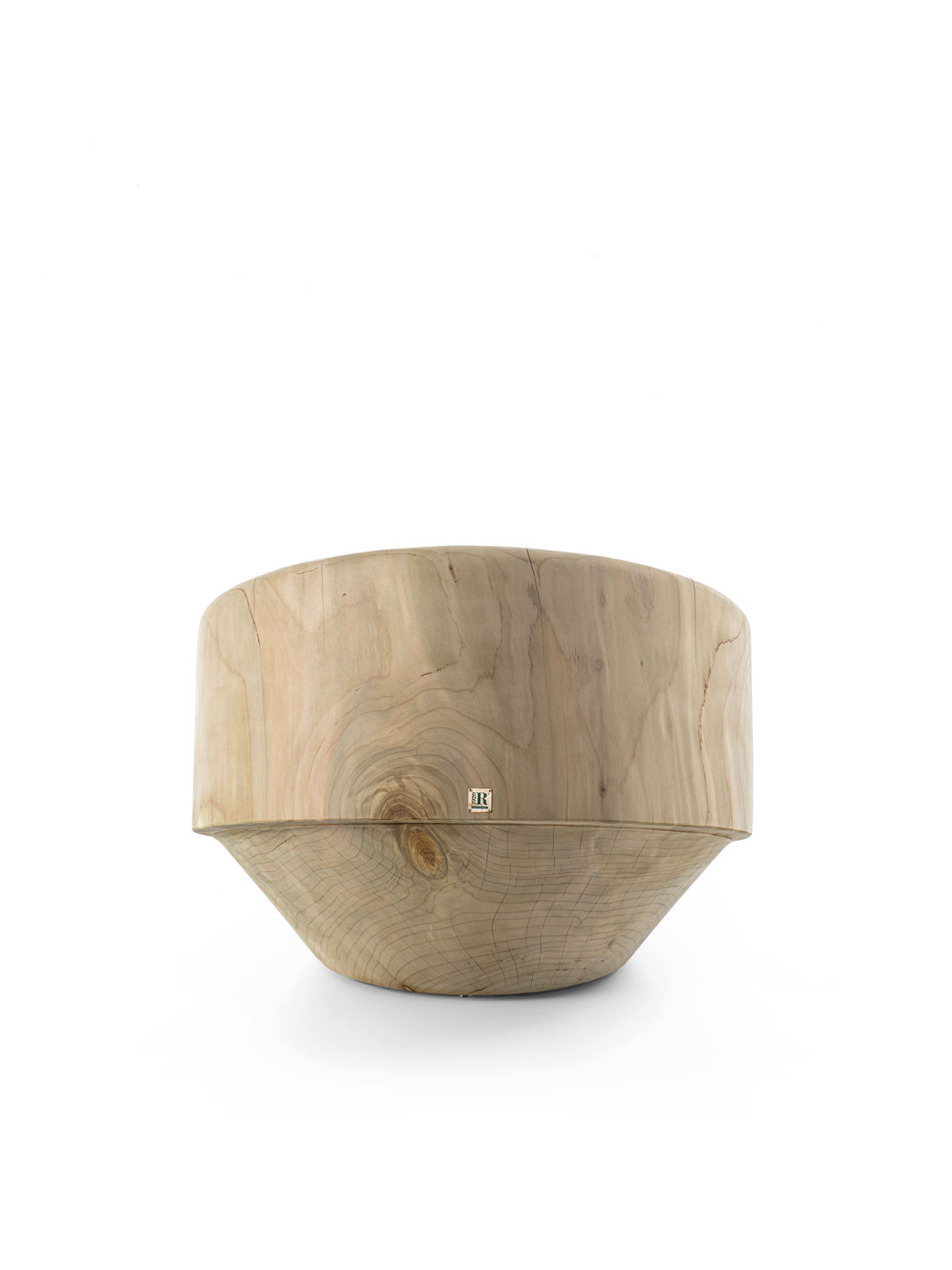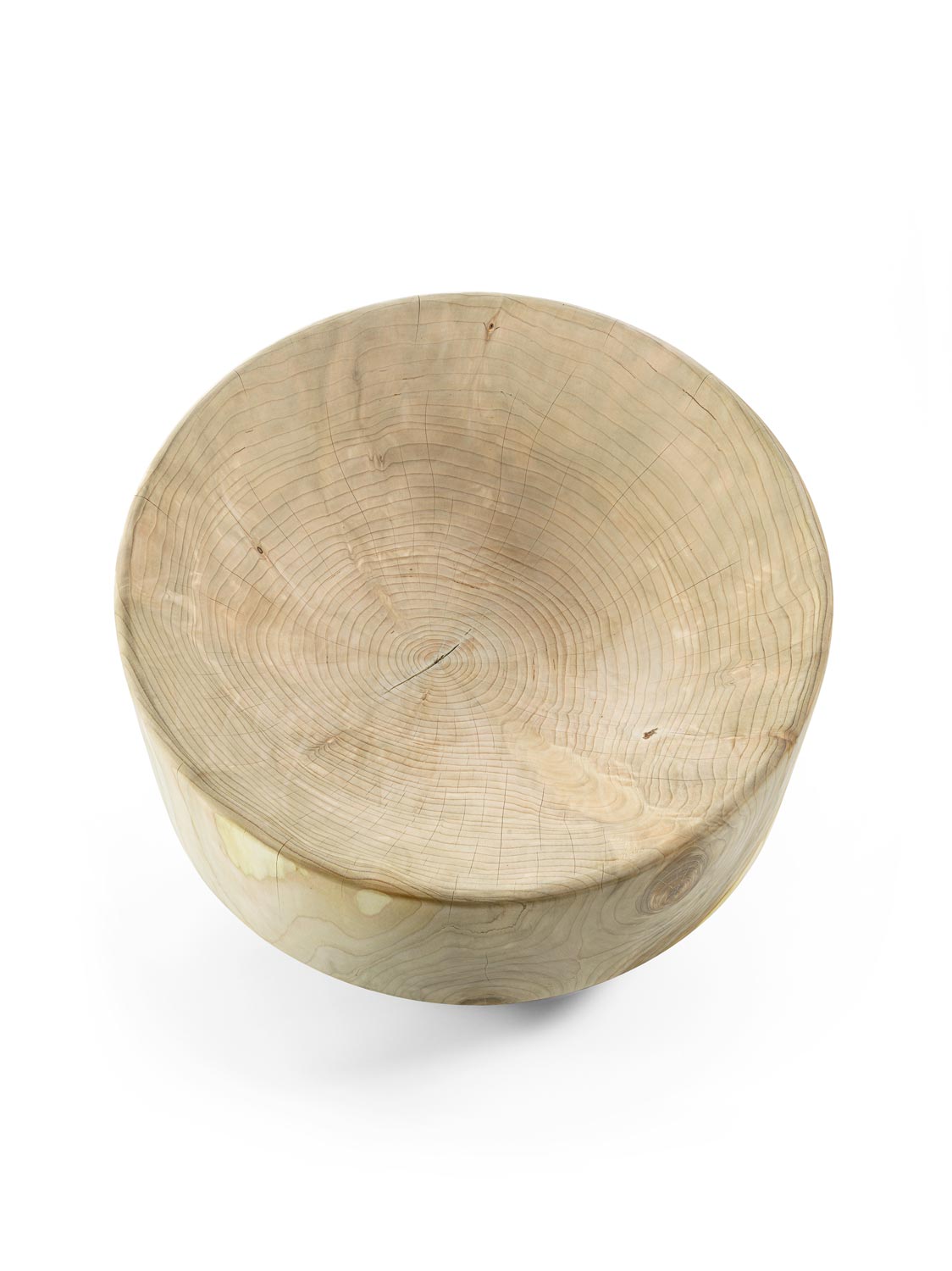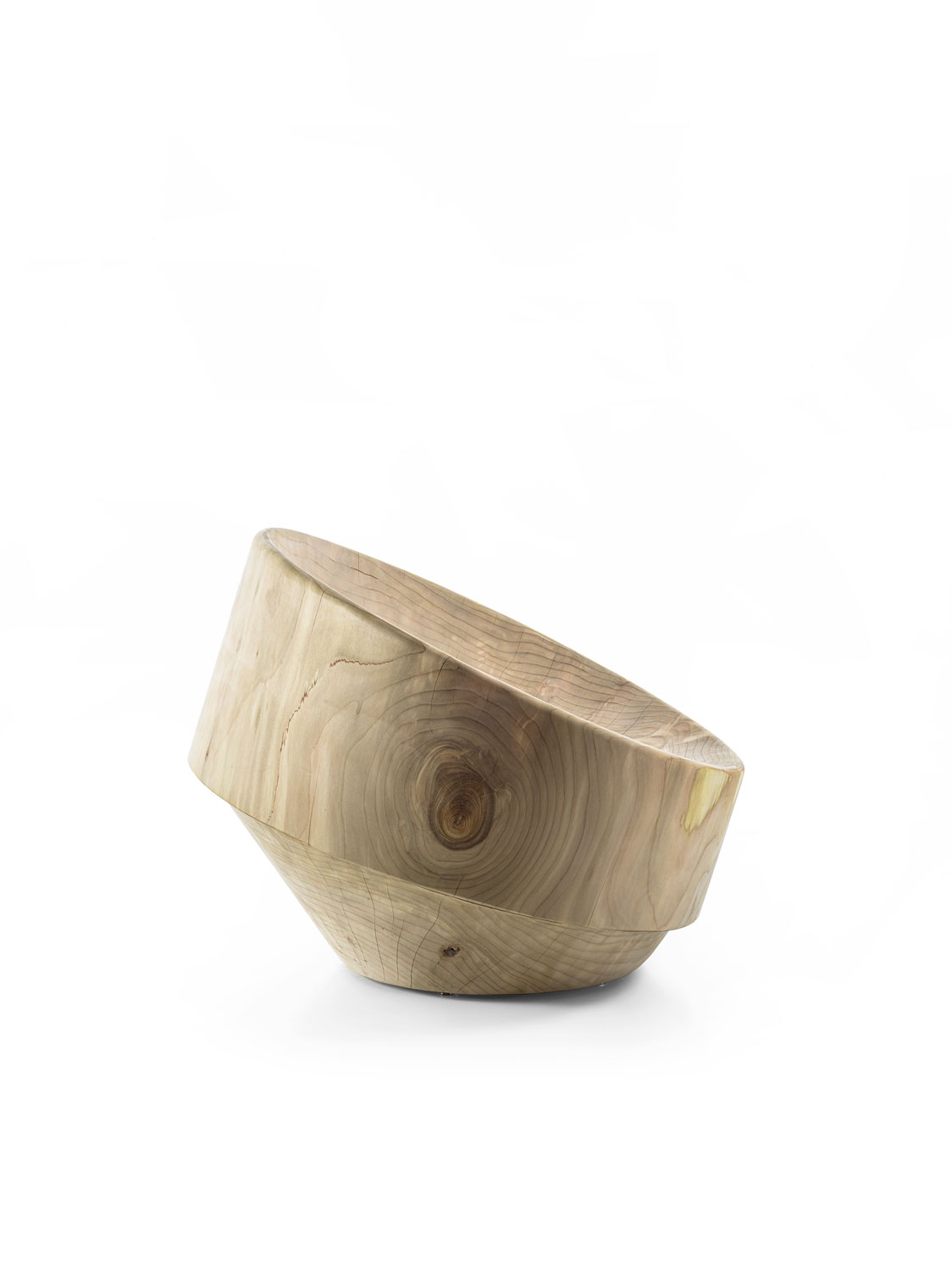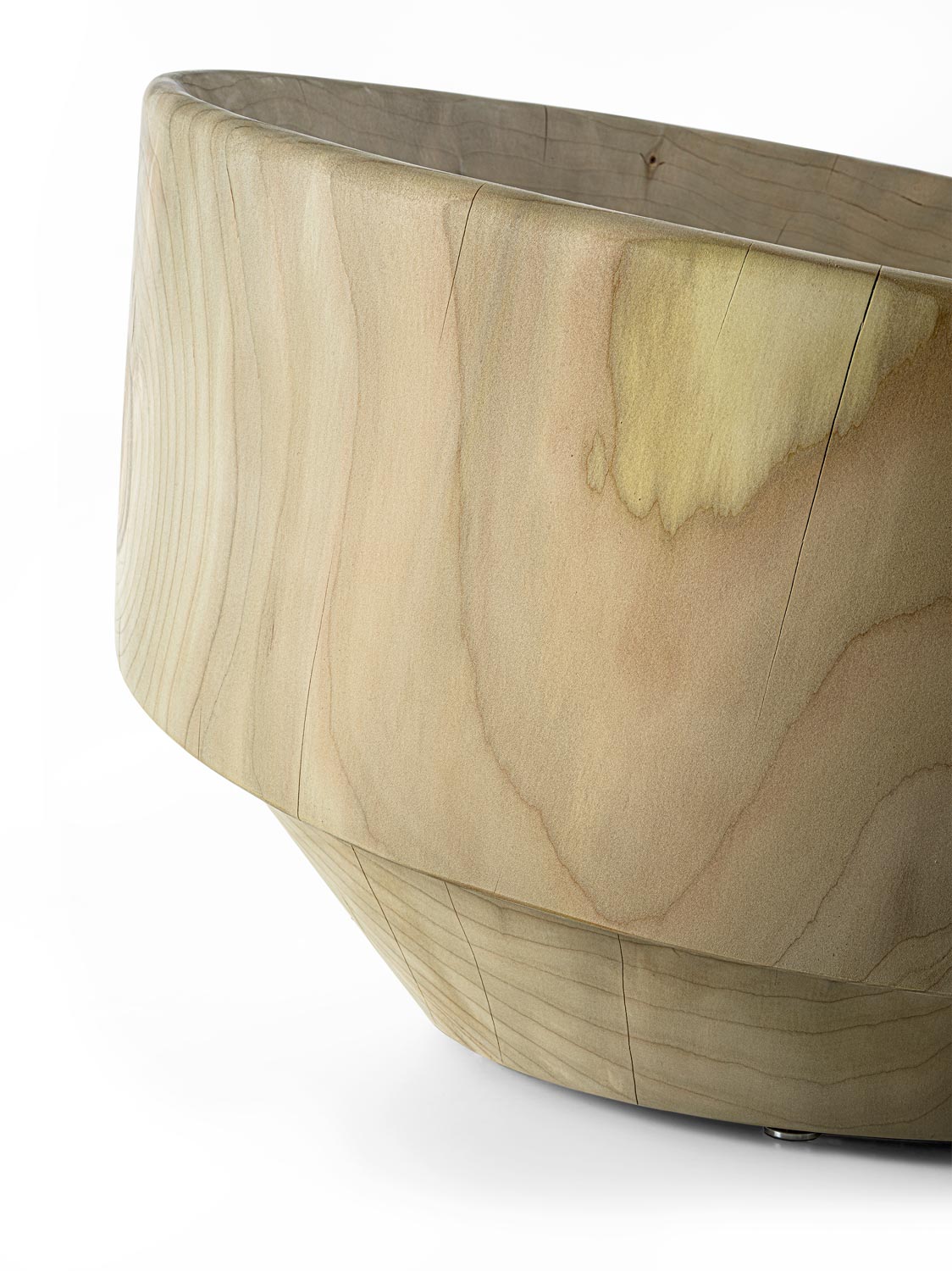 Aus einem einzigen Block massiven, duftenden Zedernholzes gefertigter Sessel. Ein kurvenfömiger Monolith, der sich durch eine ergonomische Sitzfläche, die fließend in die Rückenlehne übergeht, unterscheidet. Das Design ist das Ergebnis ein sorgfältigen Untersuchung der Wirkung von perfekt runden, fast kinetischen Formen auf die Volumina des Rohmaterials.