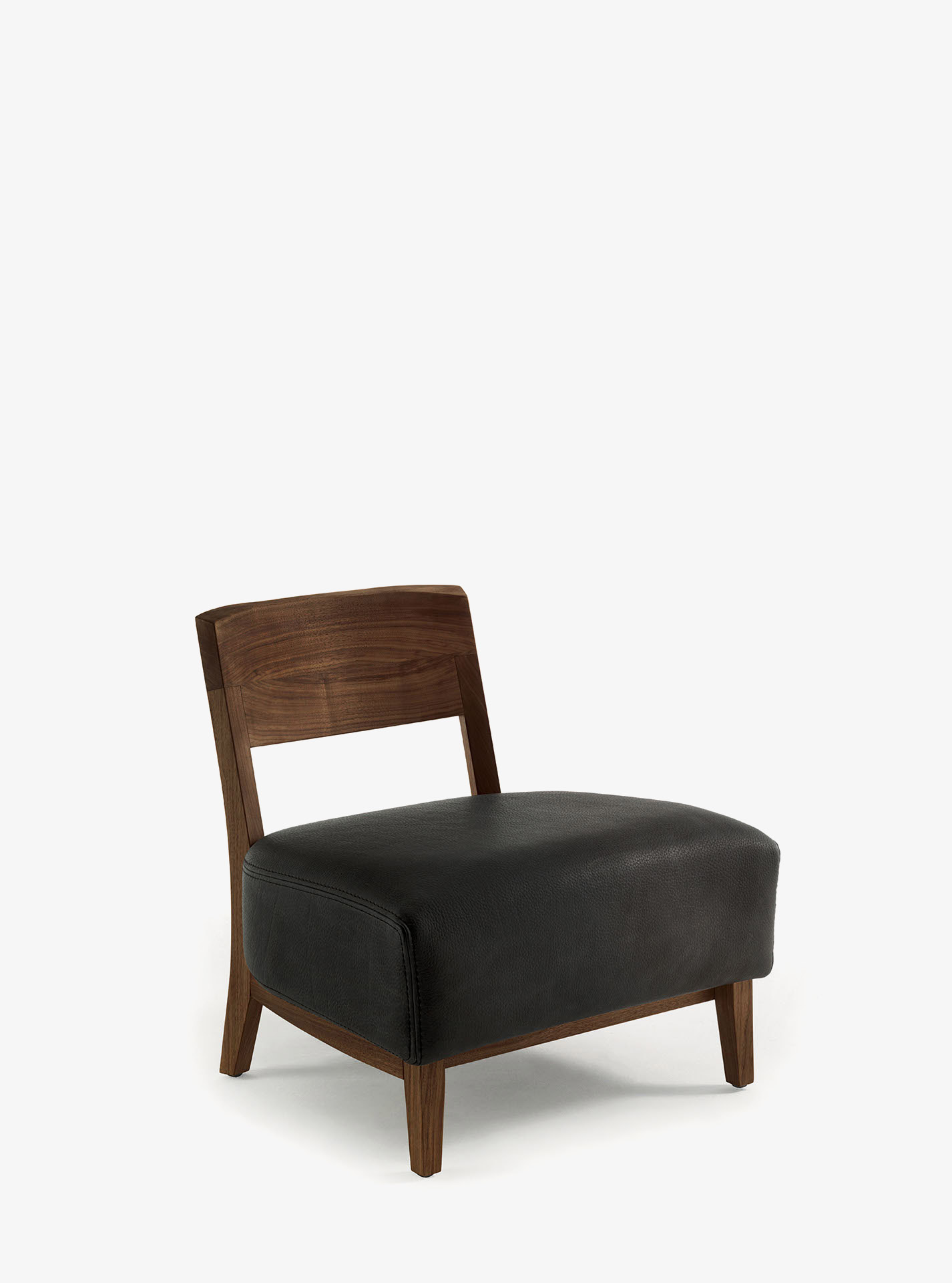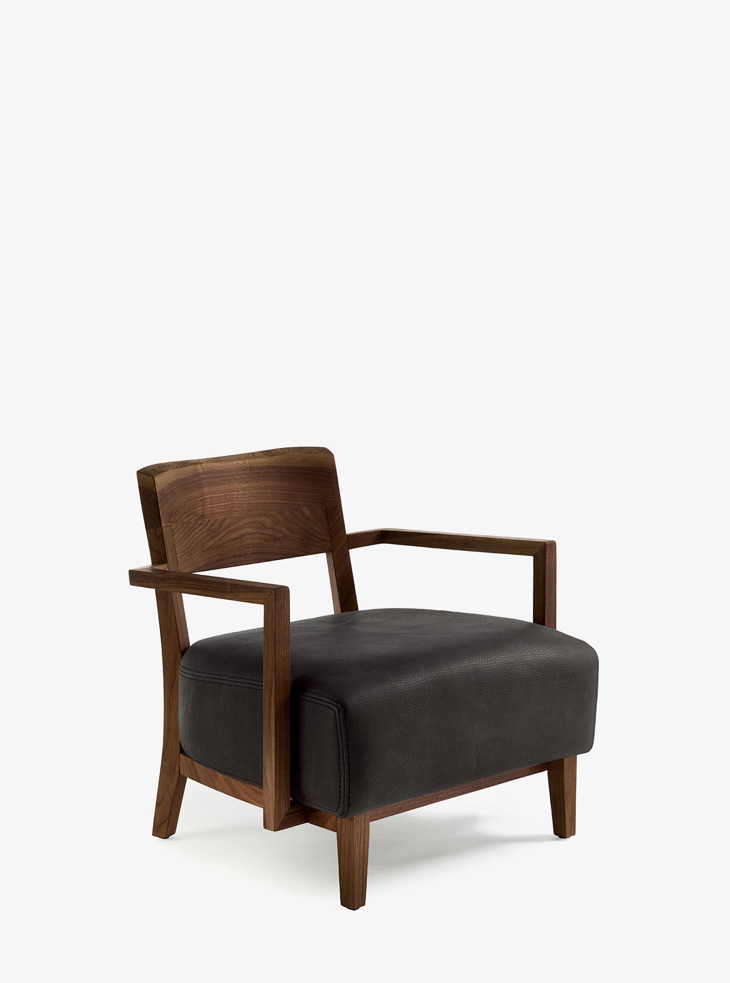 Sessel mit Gestell aus Massivholz, Rückenlehne mit naturbelassener Oberkante. Gepolsterte Sitzfläche, Bezug aus Leder oder Stoff mit sichtbaren Nähten. In den Varianten mit oder ohne Armlehnen erhältlich.