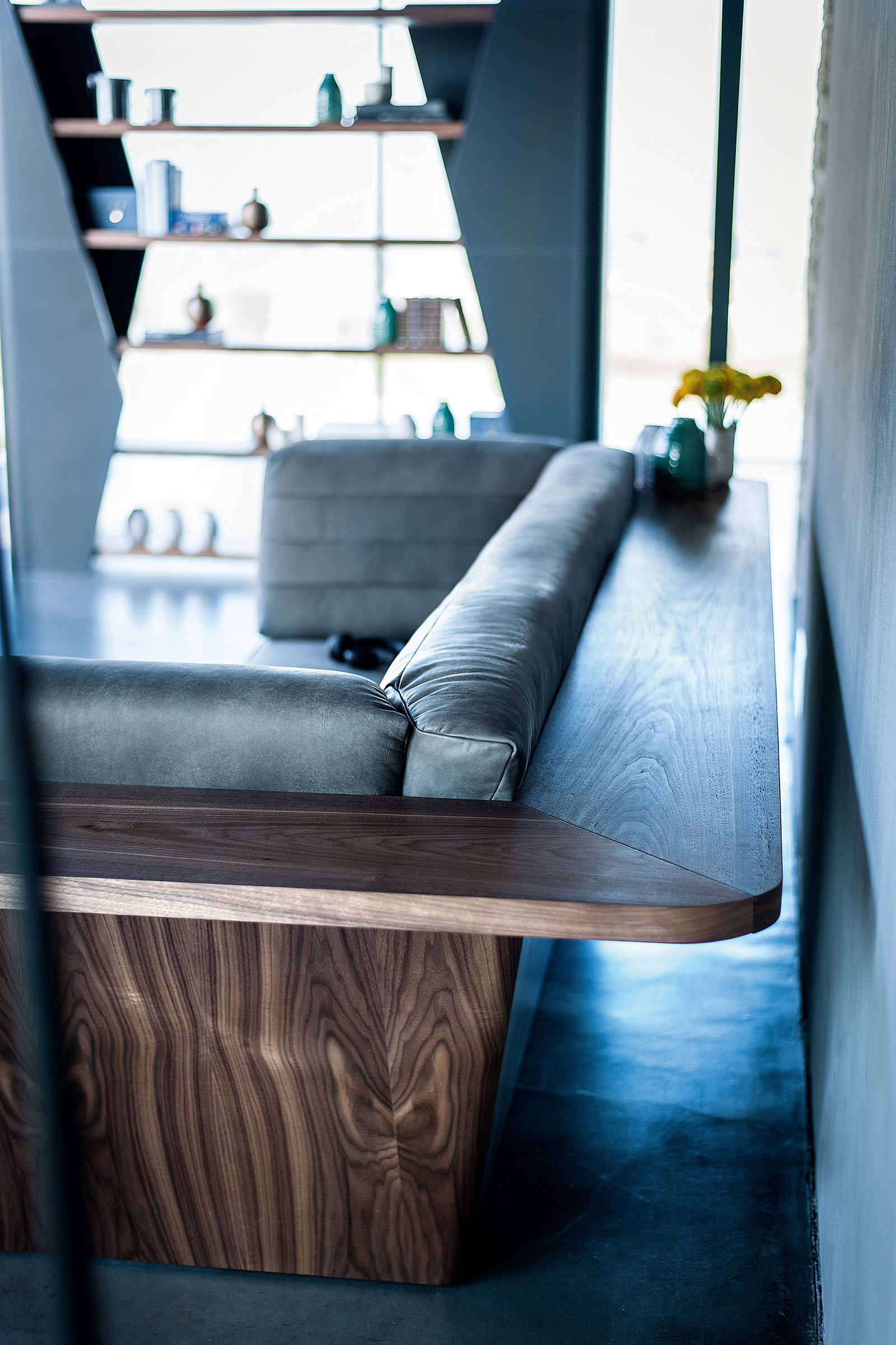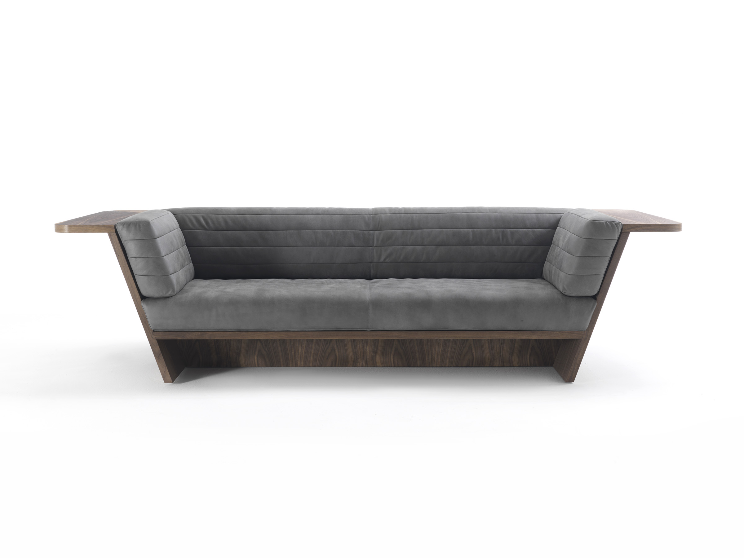 Sofa, in einer Schale aus Schichtholz mit Regal, welches über den gesamten Umfang verläuft. Durchgängige Sitz- und Rückenkissen, die sich durch sichtbare Nähte auszeichnen.