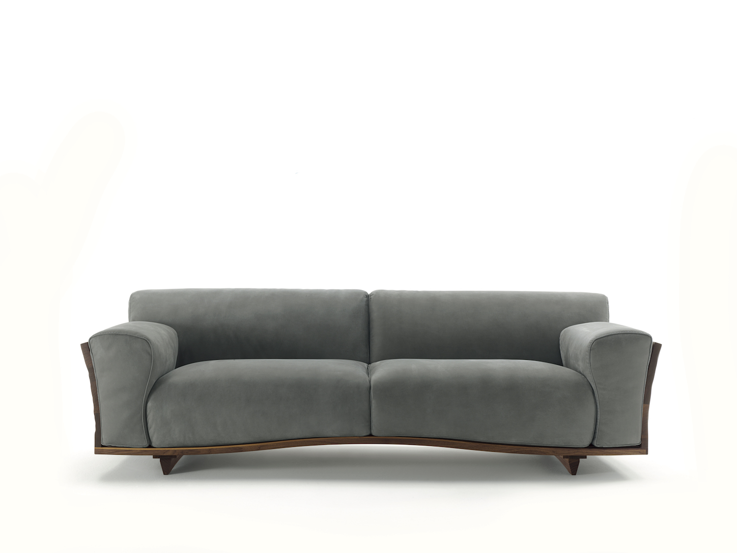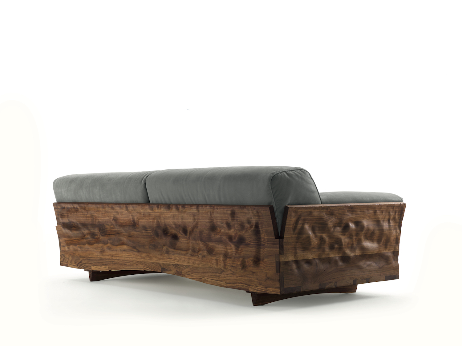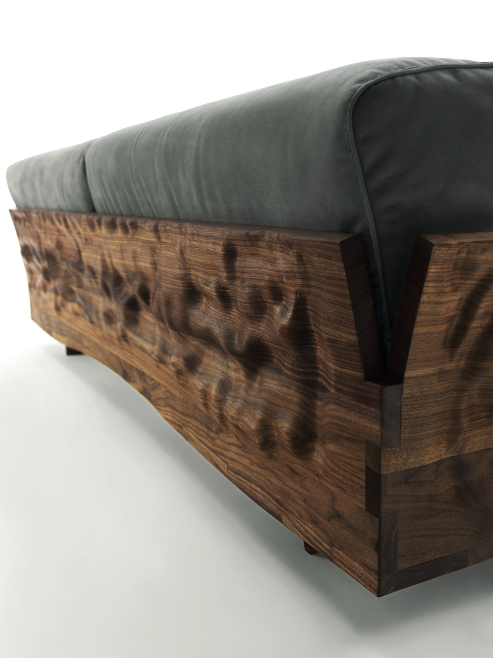 Sofa mit eingeschnitteter Struktur aus Massivholz, Rücken- und Armlehnen durch die traditionelle Schwalbenschwanzverbindung miteinander verbunden. Kennzeichnen des Sofas ist ein Bewegungseffekt, das dadurch entsteht. Grosse und weiche Sitzkissen aus Leder oder Stoff mit sichtbaren Nähten liegen auf das abgerundete Gestell.Es ist von dem Kunstwerk von Amedeo Modigliani inspiriert worden und so benannt.