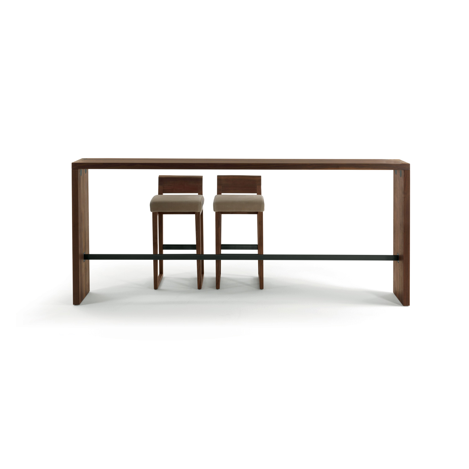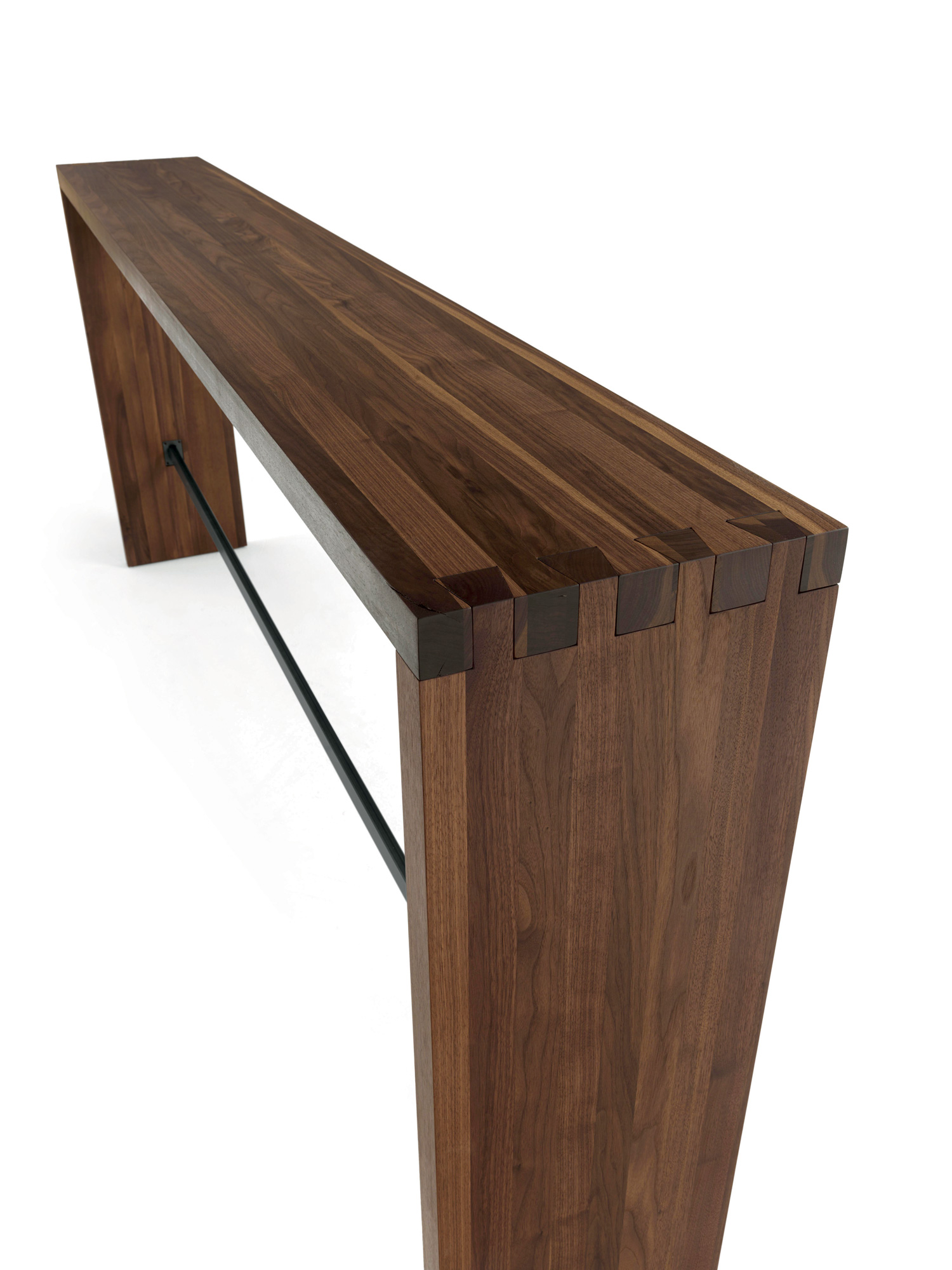 Konsole völlig aus verleimten Massivholzleisten gefertigt, mit geraden Kanten und Schwalbenschwanzverbindung zwischen Platte und Gestell. Fußstütze aus Metall.